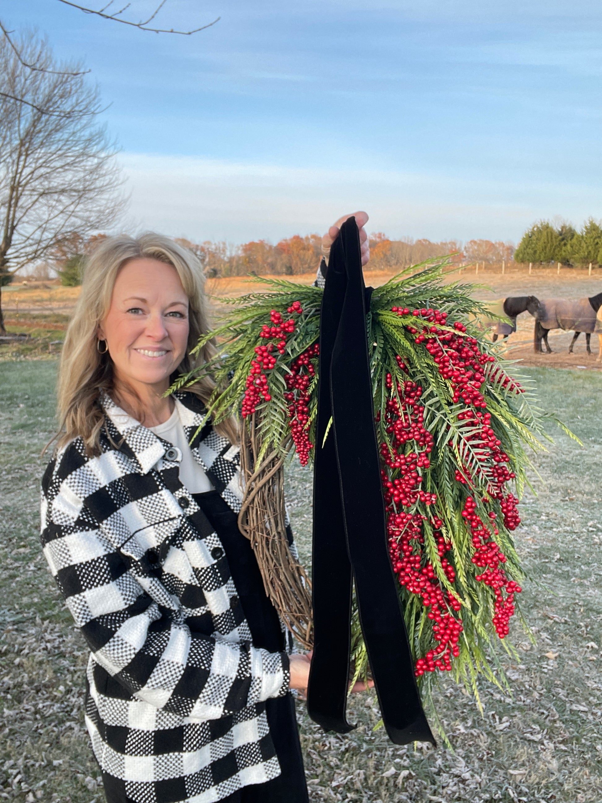 A luxurious black velvet ribbon adds a sophisticated touch, while the wooden bell completes the design with a rustic, timeless charm. Perfect for front doors, fireplaces, or walls, this wreath brings warmth and elegance to any space. Each piece is carefully crafted to ensure quality and uniqueness, making it a stunning addition to your seasonal decor. Limited availability – grab yours today!