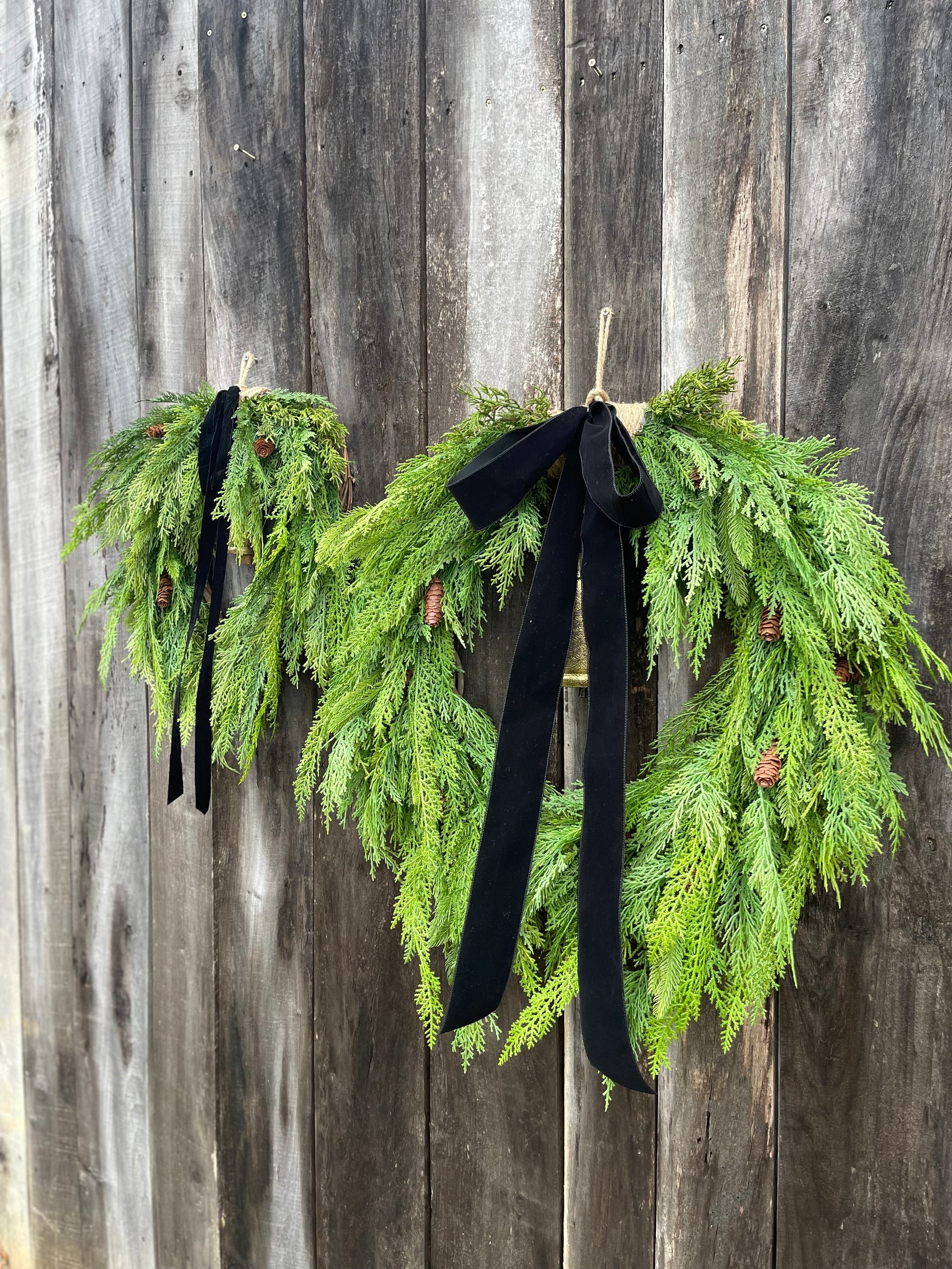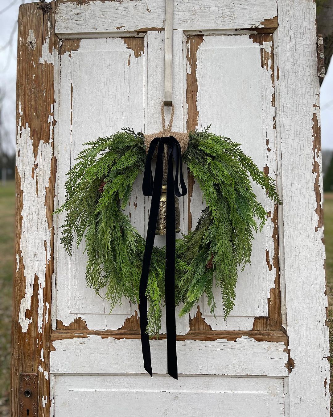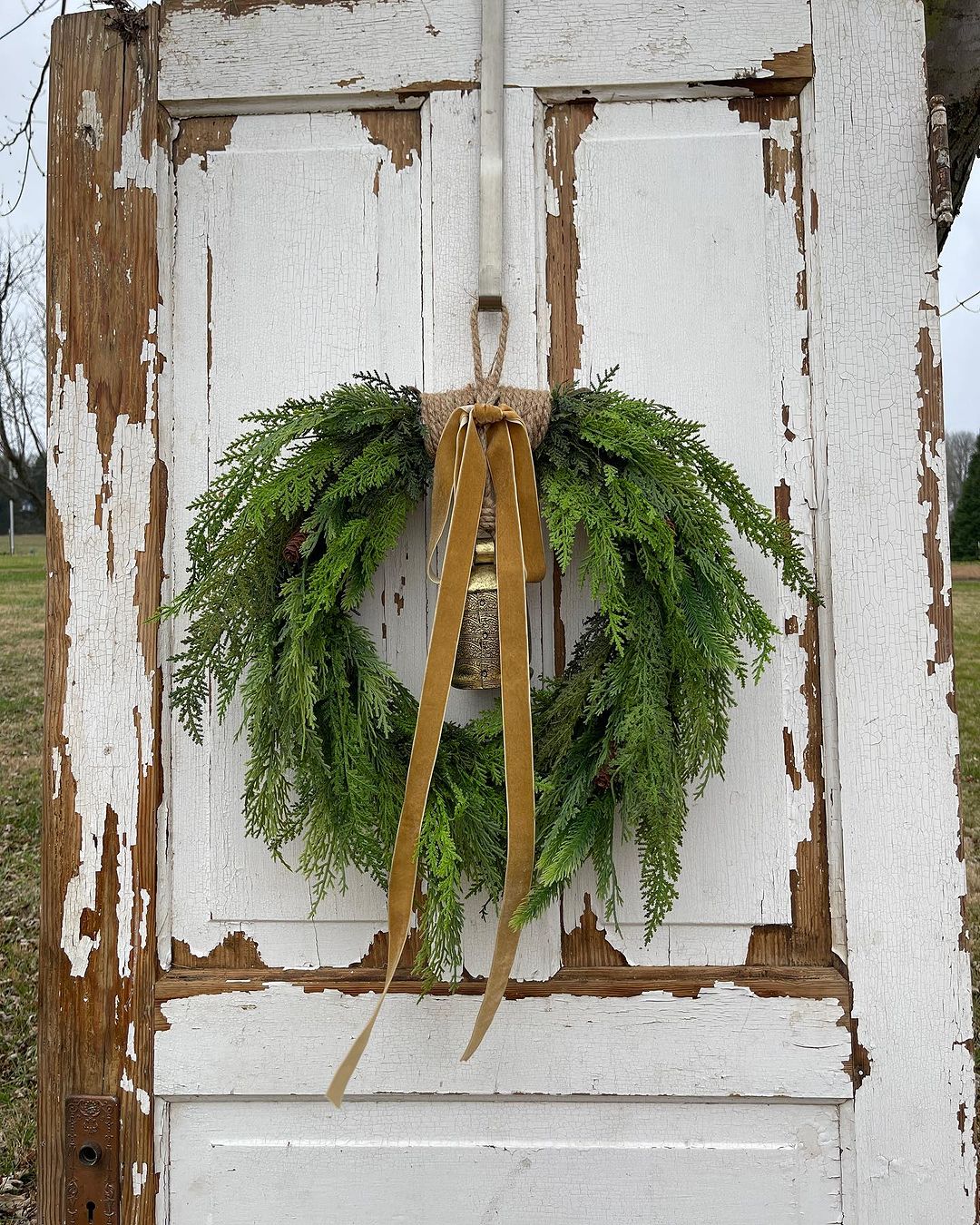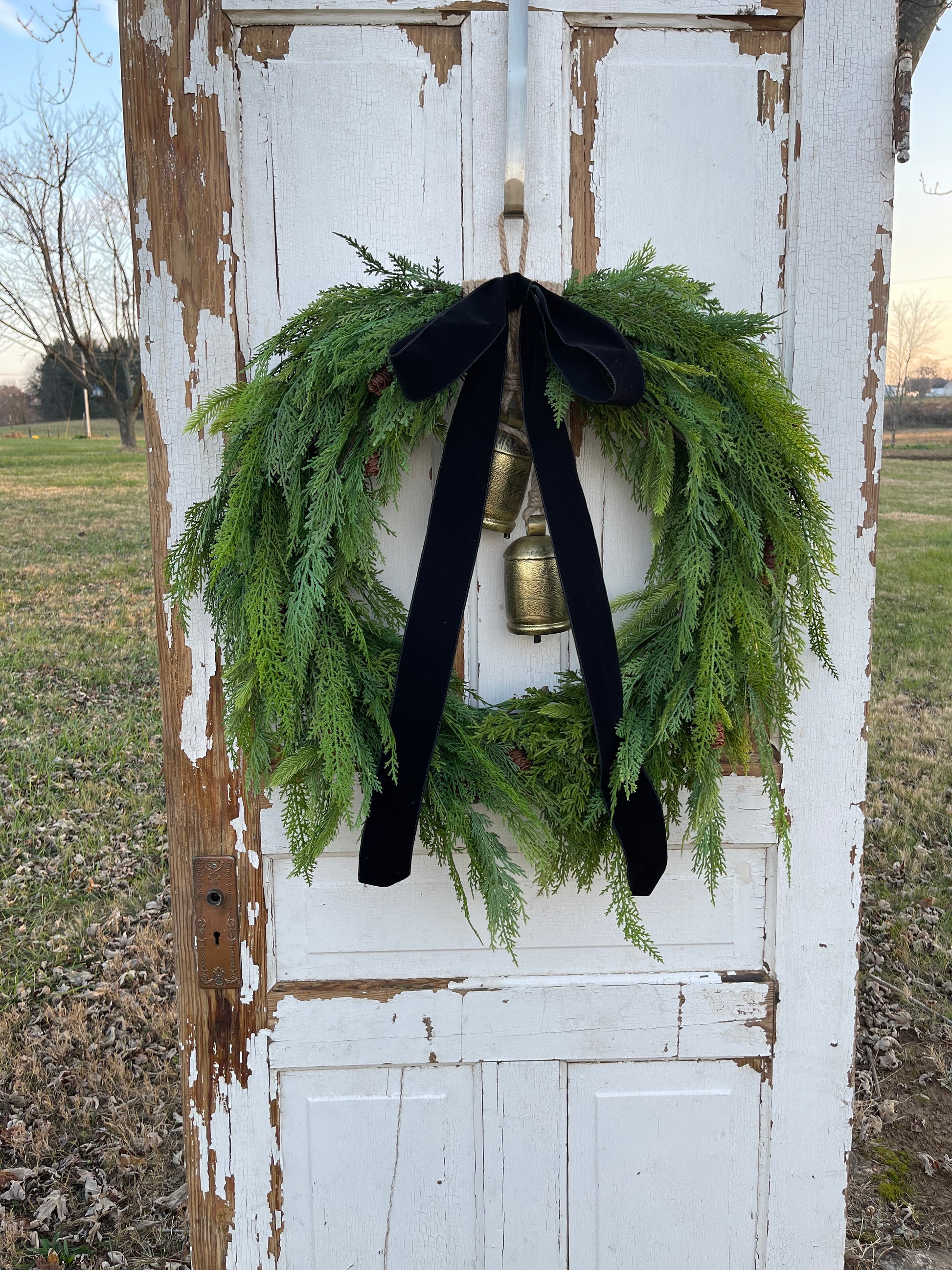 Rustic Grapevine Evergreen Wreath with Brass Bell – Custom Ribbon Options Available