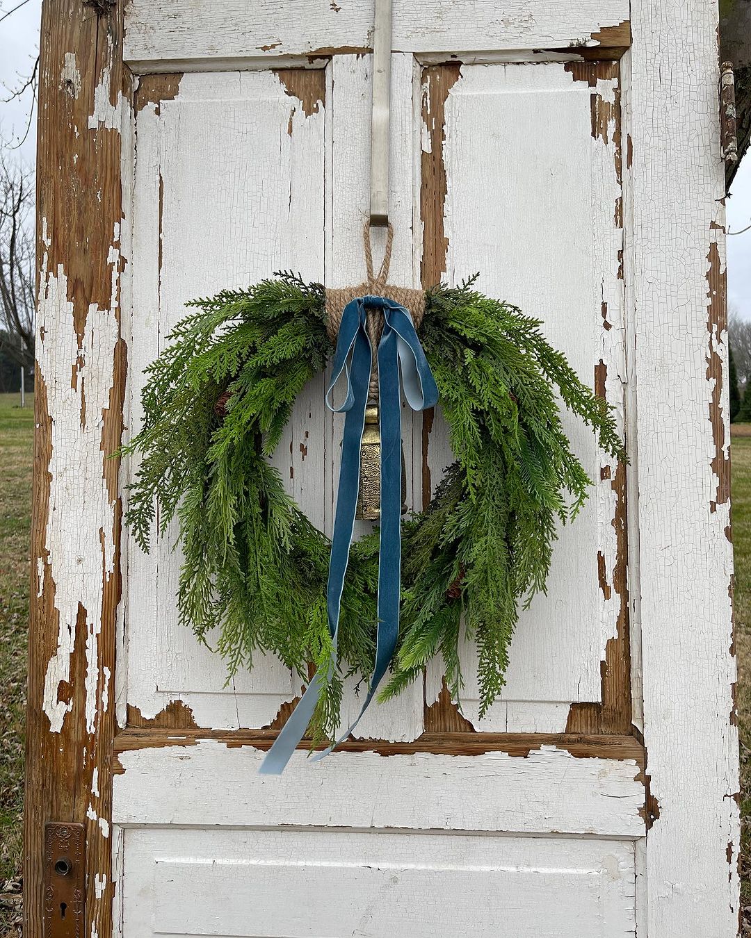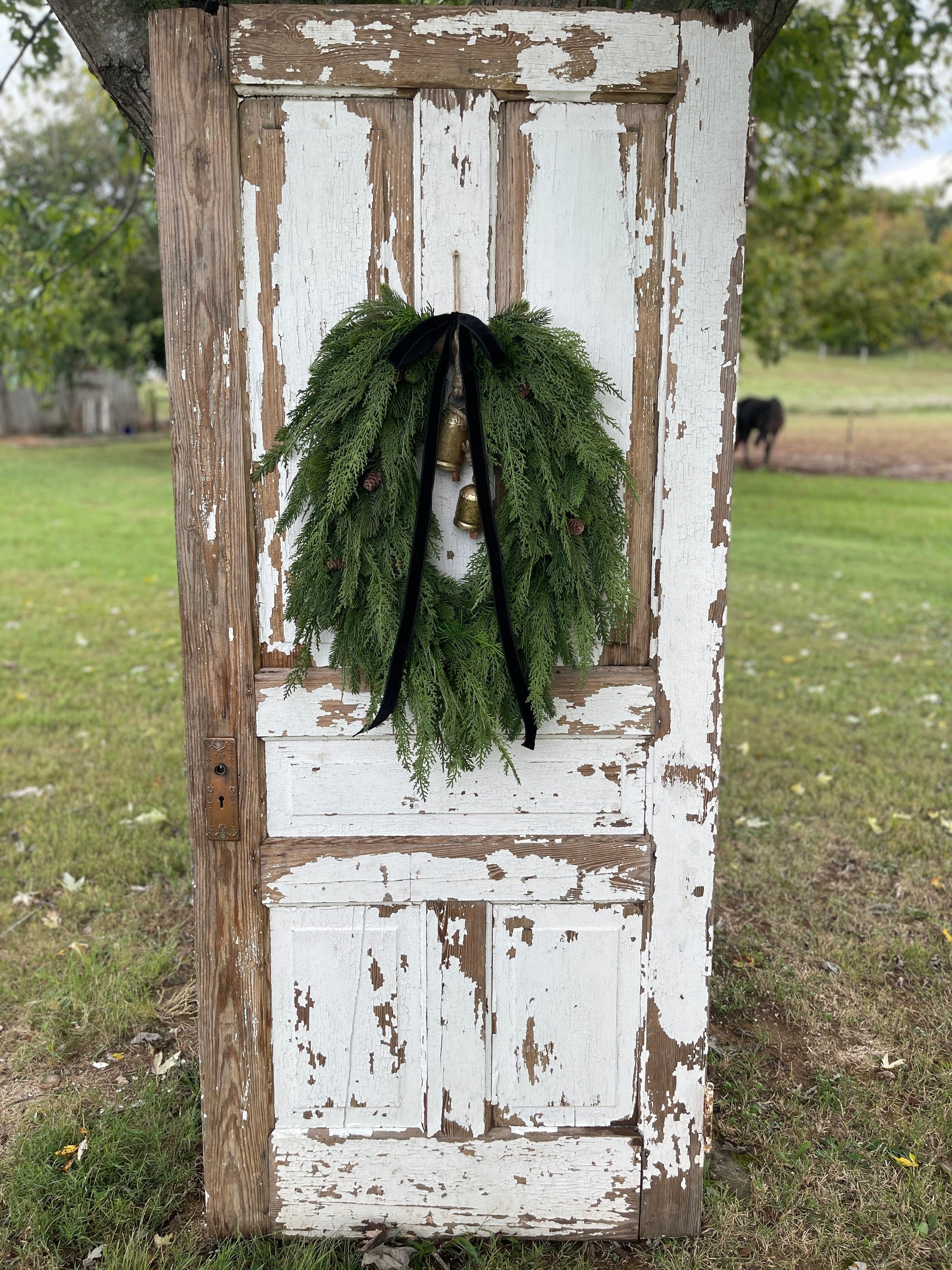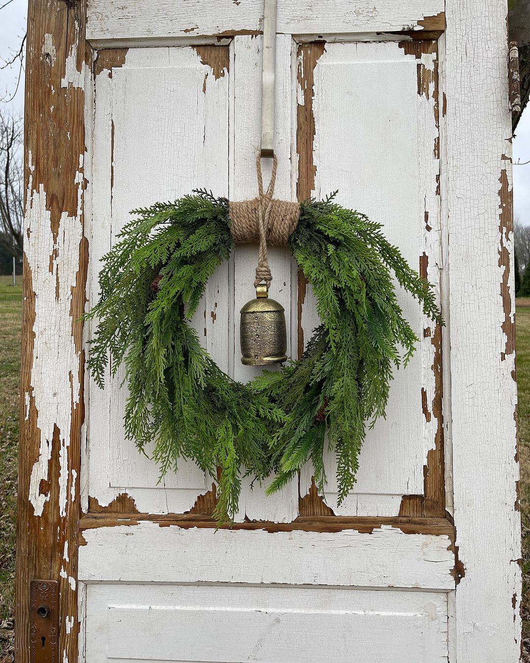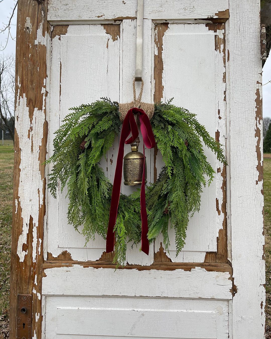 Rustic Grapevine Evergreen Wreath with Brass Bell – Custom Ribbon Options Available