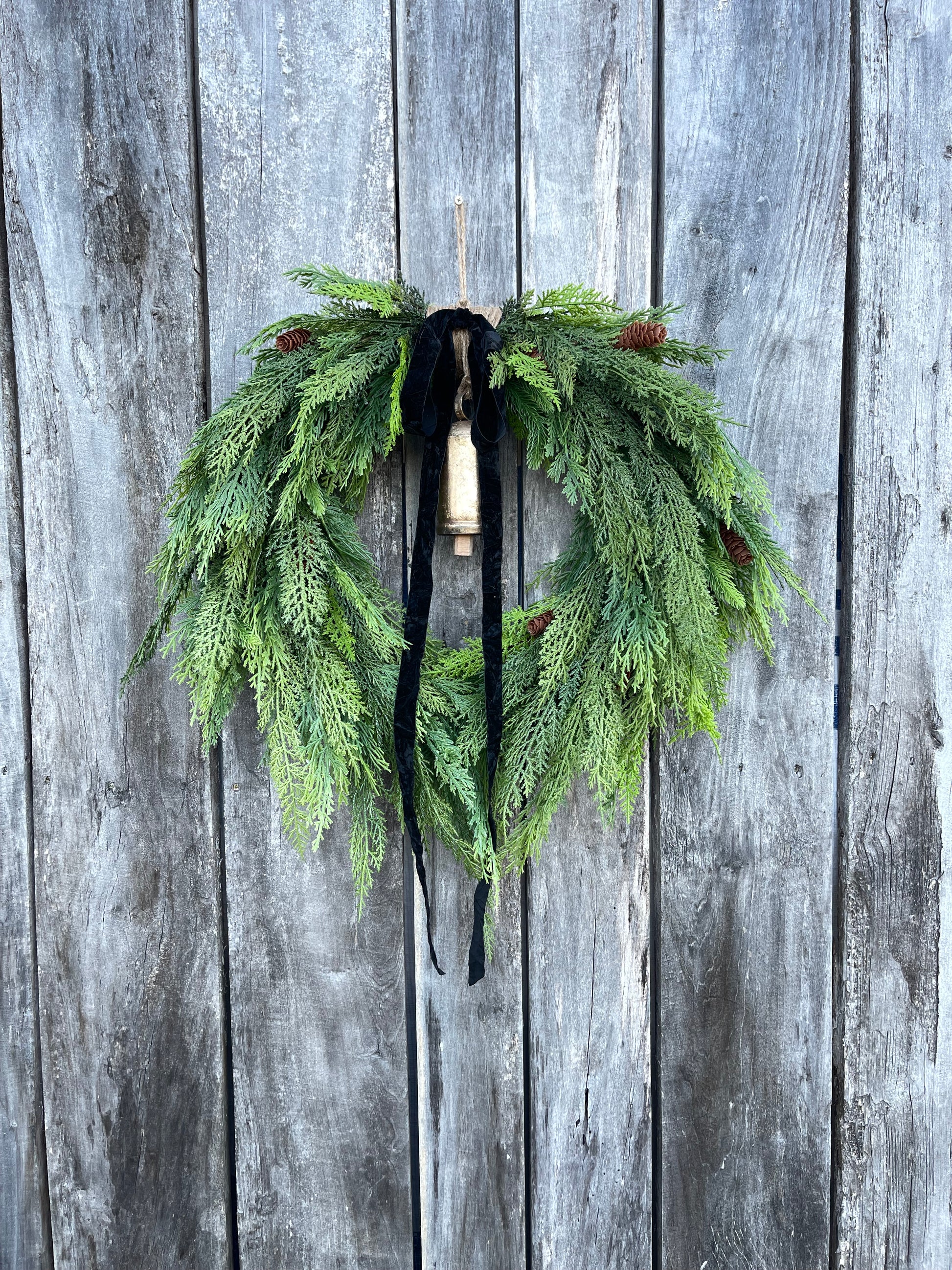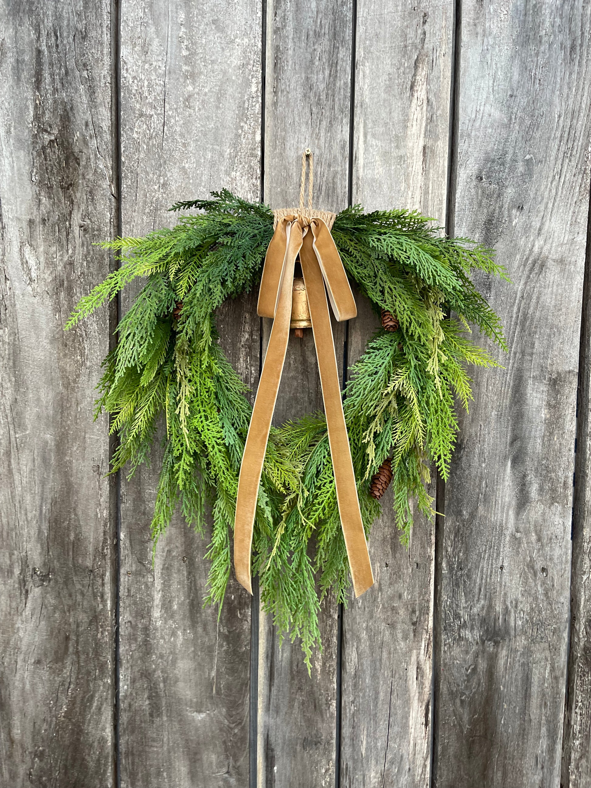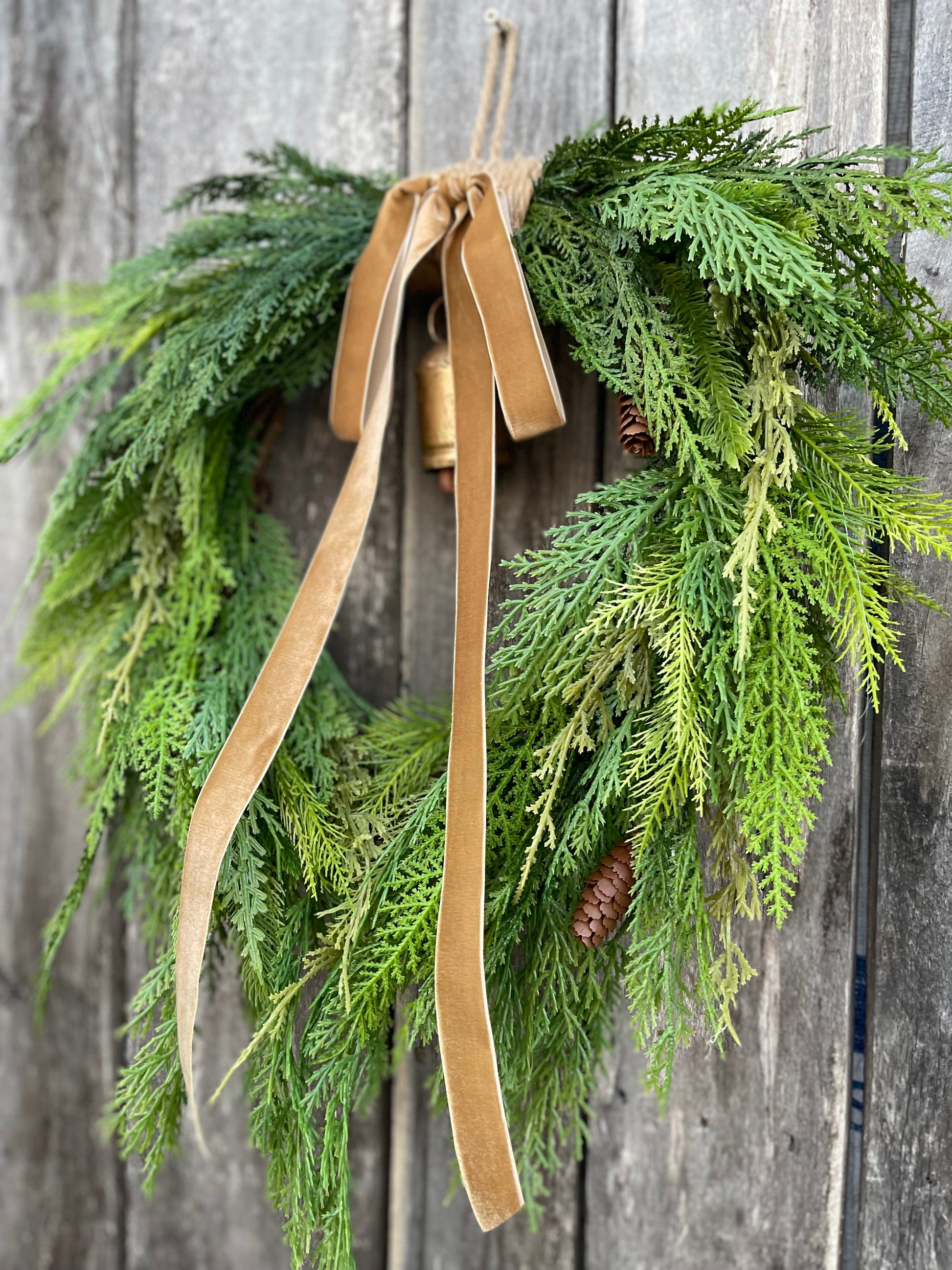 Add a touch of timeless elegance to your home with this handcrafted grapevine wreath. Made with lush, realistic evergreen cedar and pine branches and featuring a charming brass bell, this wreath is perfect for the holiday season and beyond. Whether you prefer a classic look or something a bit more rustic, you can choose from several ribbon color options or opt for no ribbon at all.