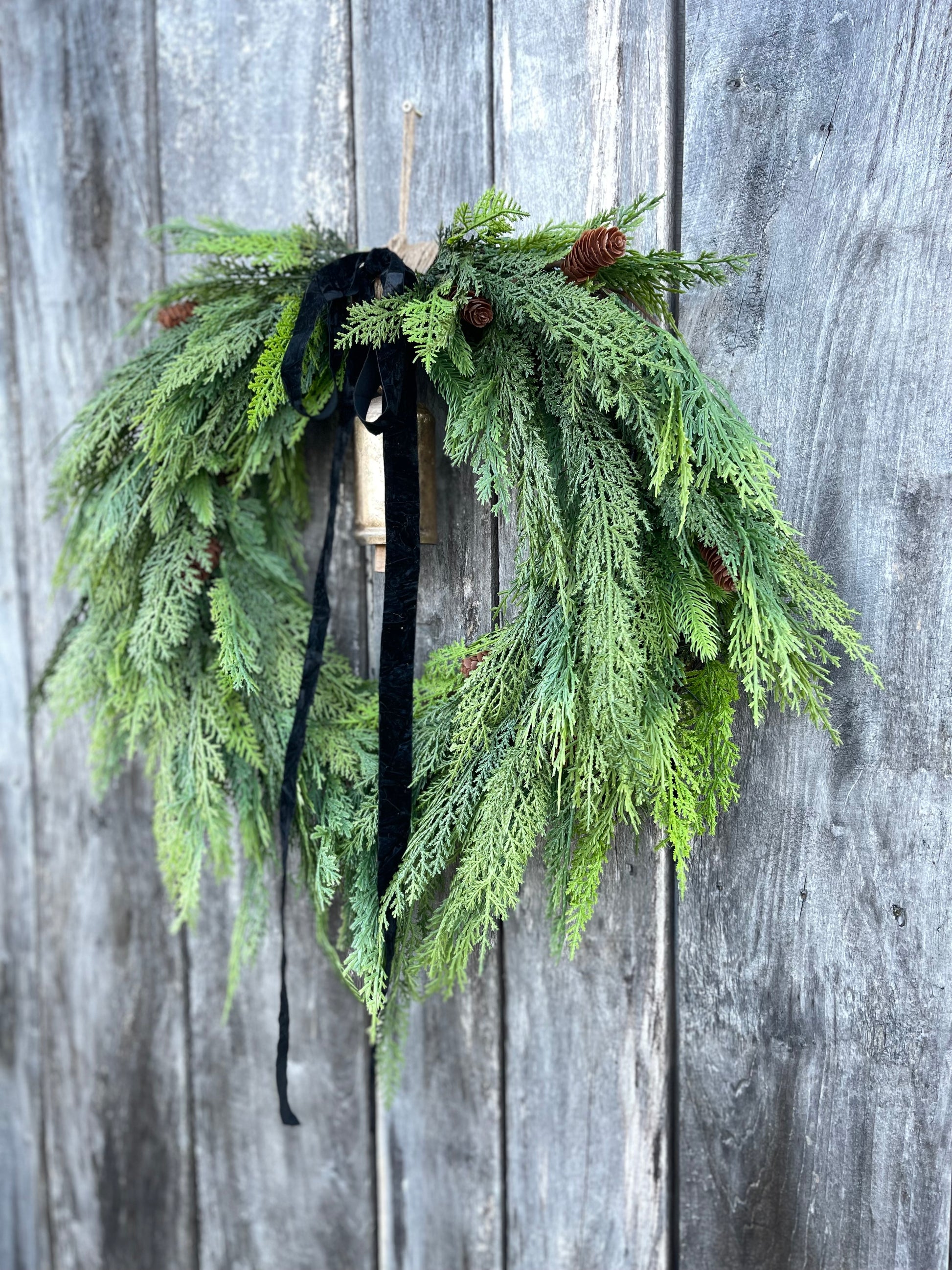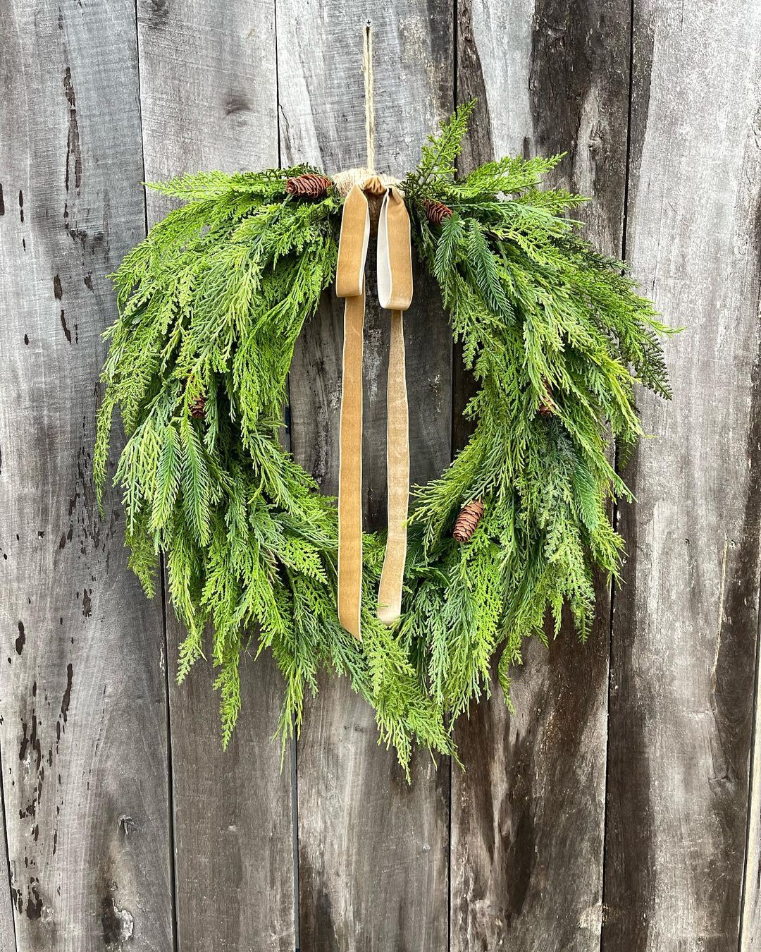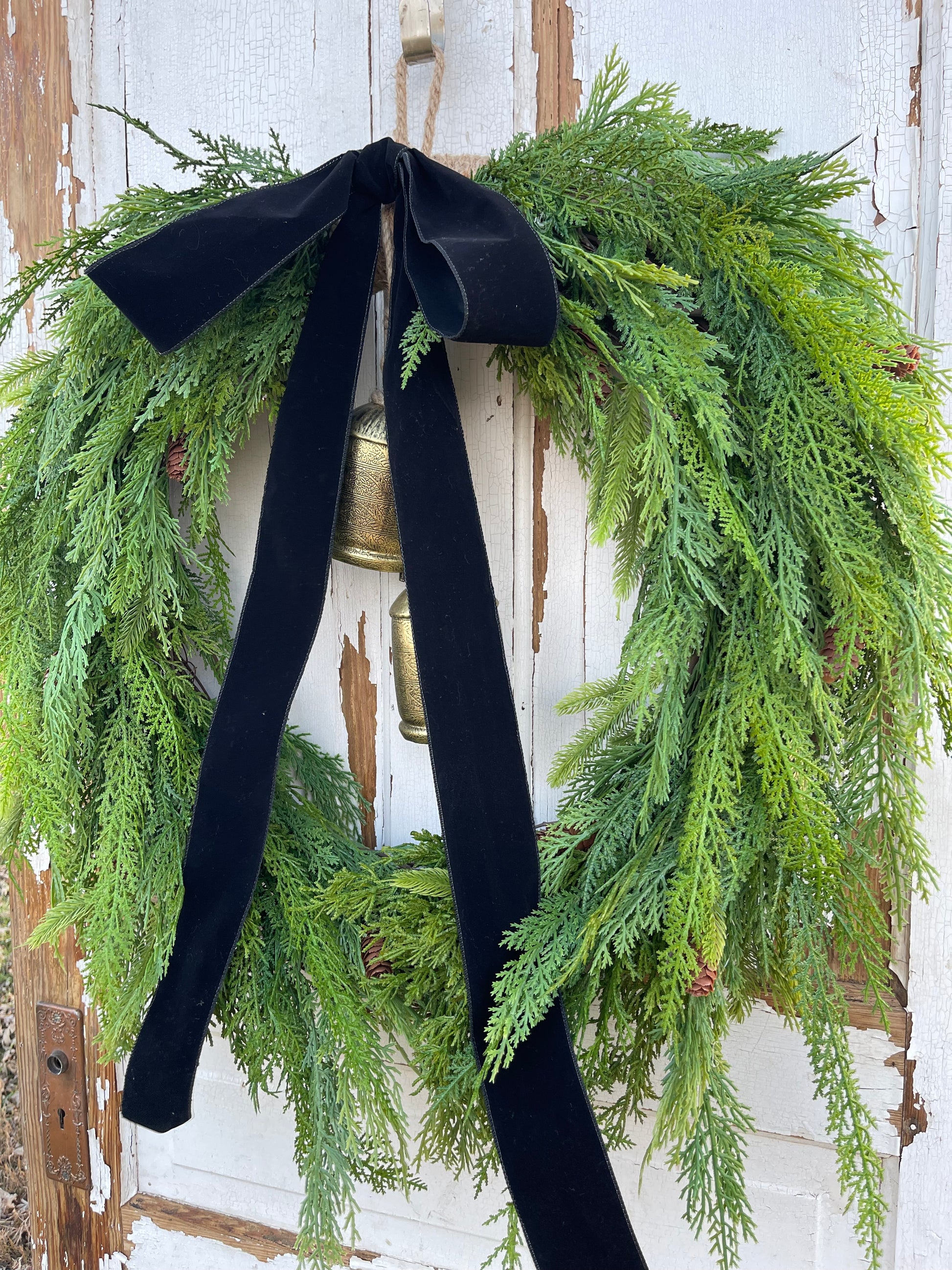 Add a touch of timeless elegance to your home with this handcrafted grapevine wreath. Made with lush, realistic evergreen cedar and pine branches and featuring a charming brass bell, this wreath is perfect for the holiday season and beyond. Whether you prefer a classic look or something a bit more rustic, you can choose from several ribbon color options or opt for no ribbon at all.