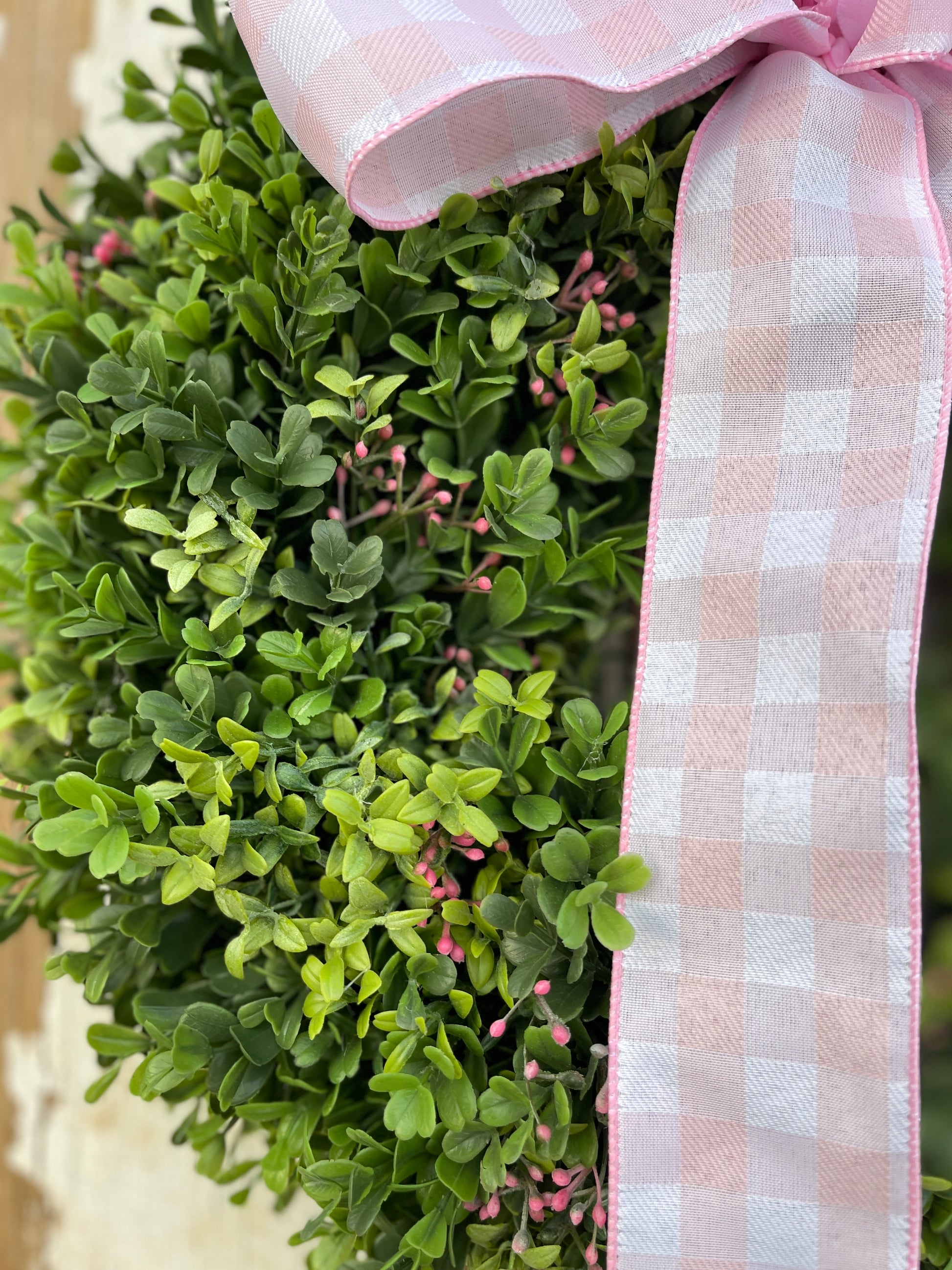 • Design Details: A 14” grapevine base that measures 17” in diameter, adorned with lush boxwood greenery and delicate pink baby’s breath accents.
