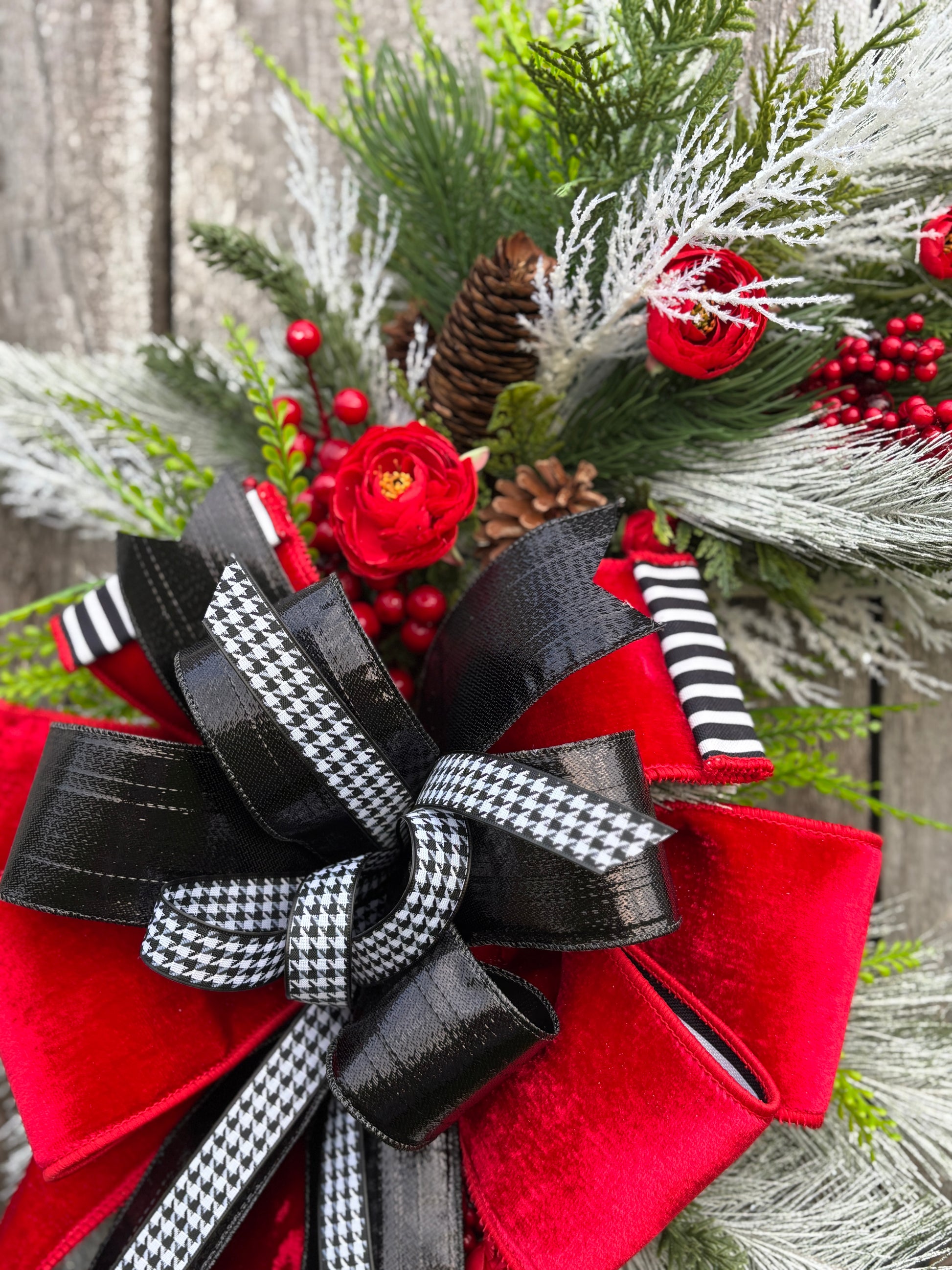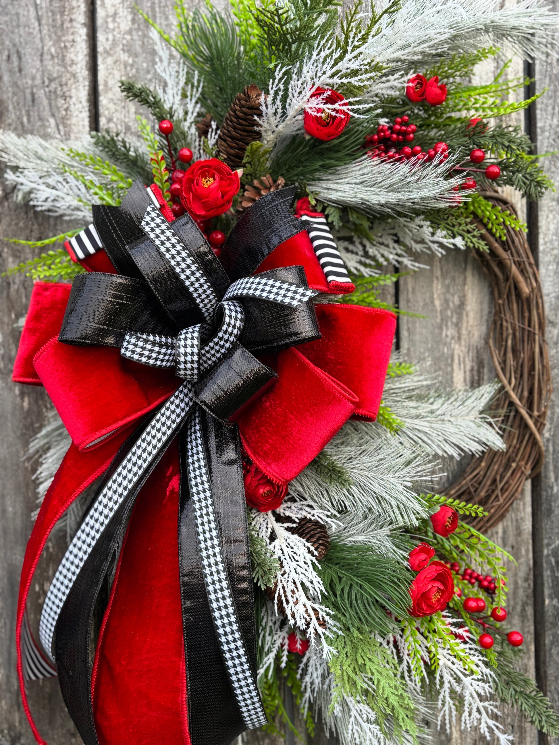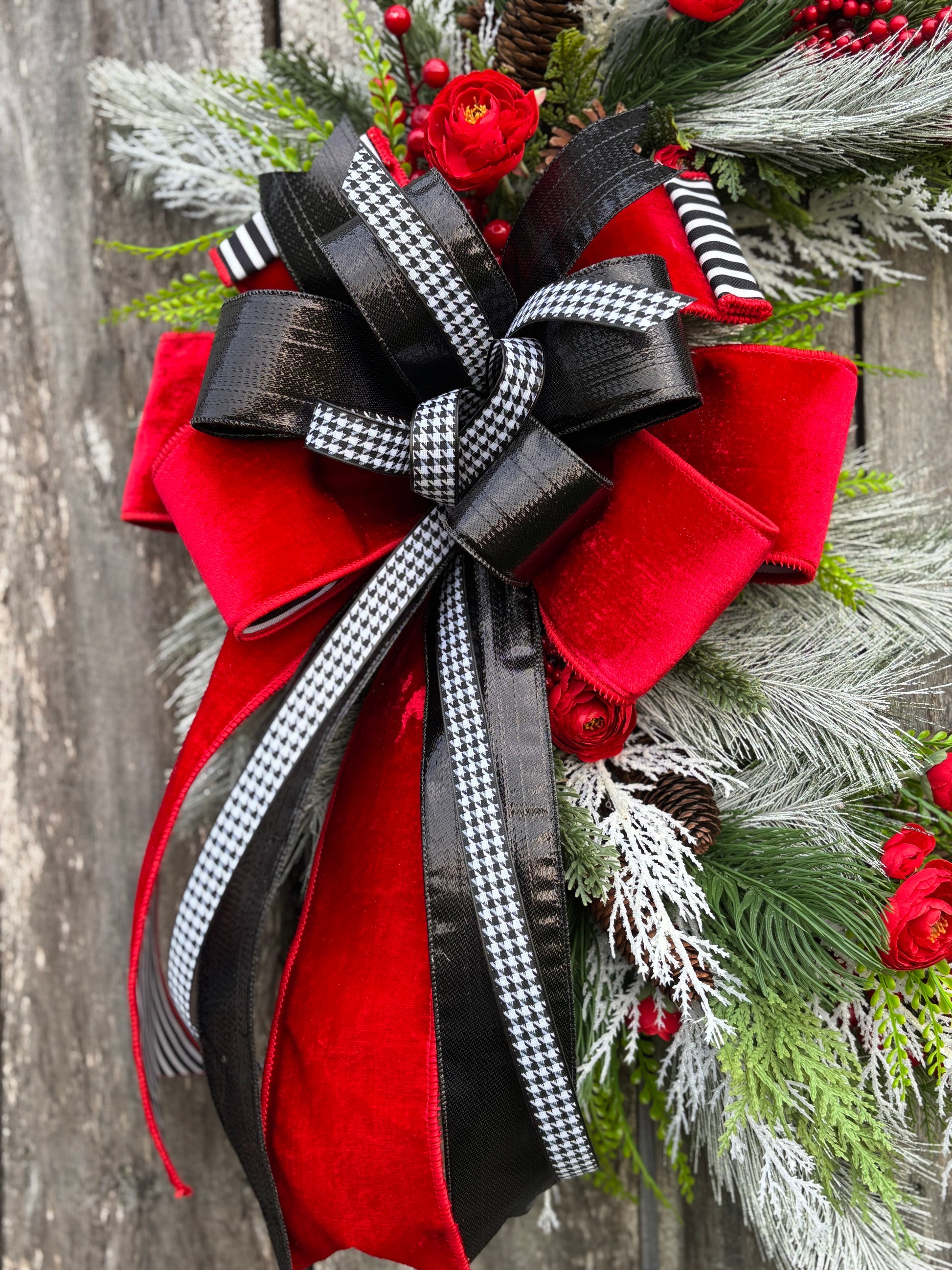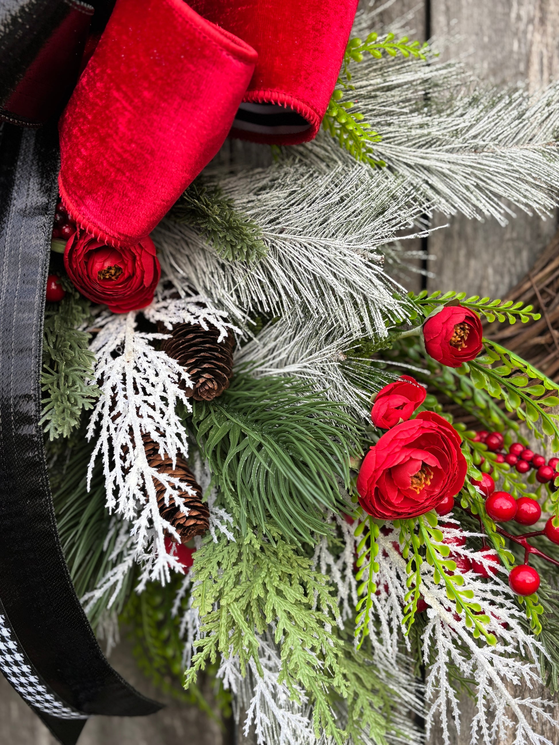 Designed with lush frosted greenery, vibrant red berries, pinecones, and pops of red florals, this wreath captures the magic of Christmas. The bold velvet red bow paired with black and houndstooth ribbon adds a modern yet timeless touch, making it ideal for your front door, entryway, mantel, or above a fireplace.