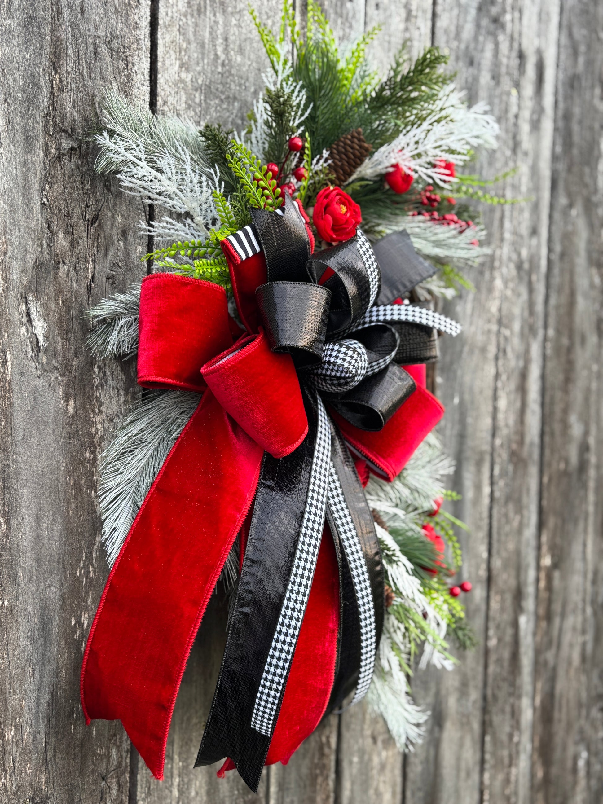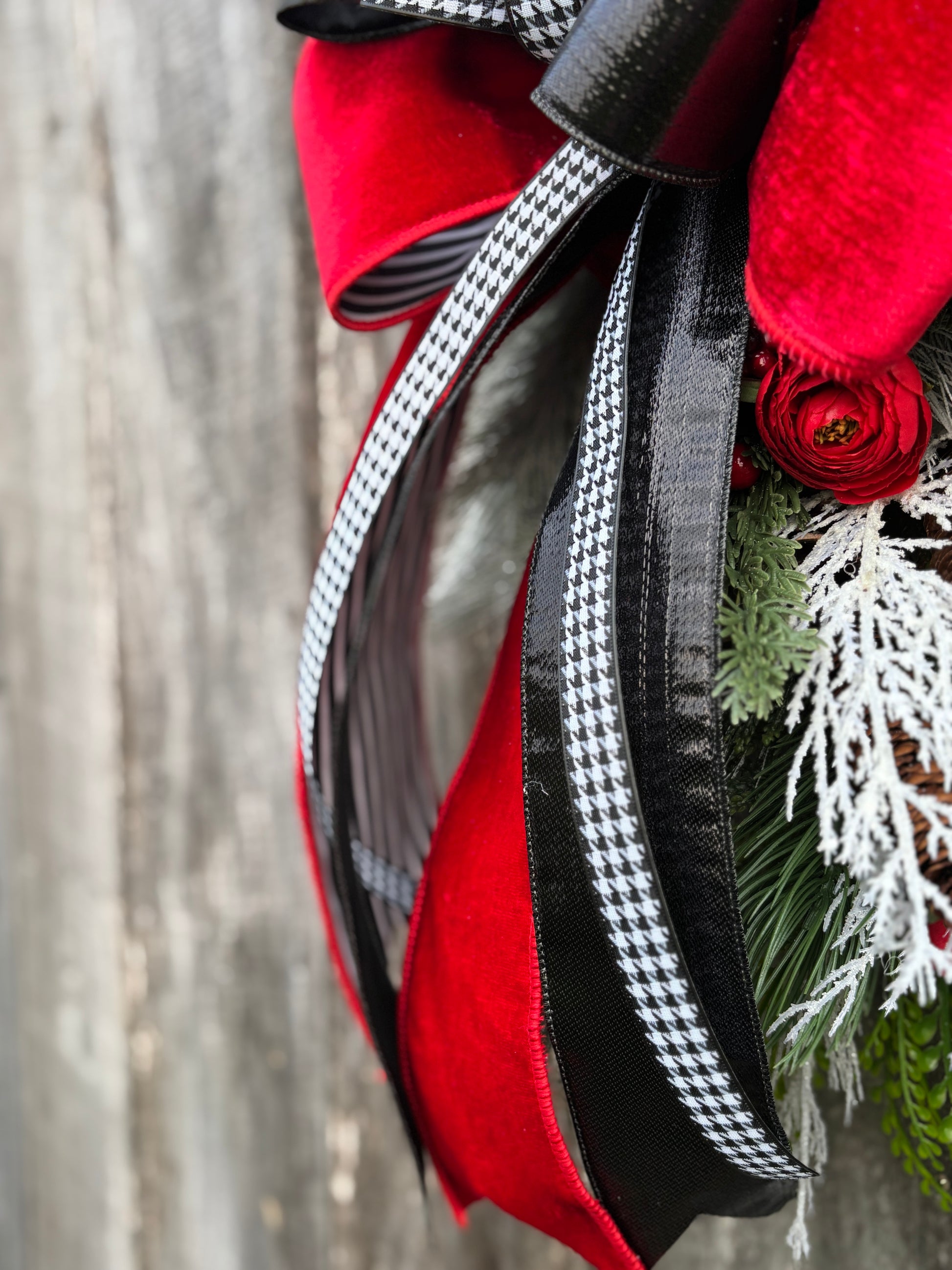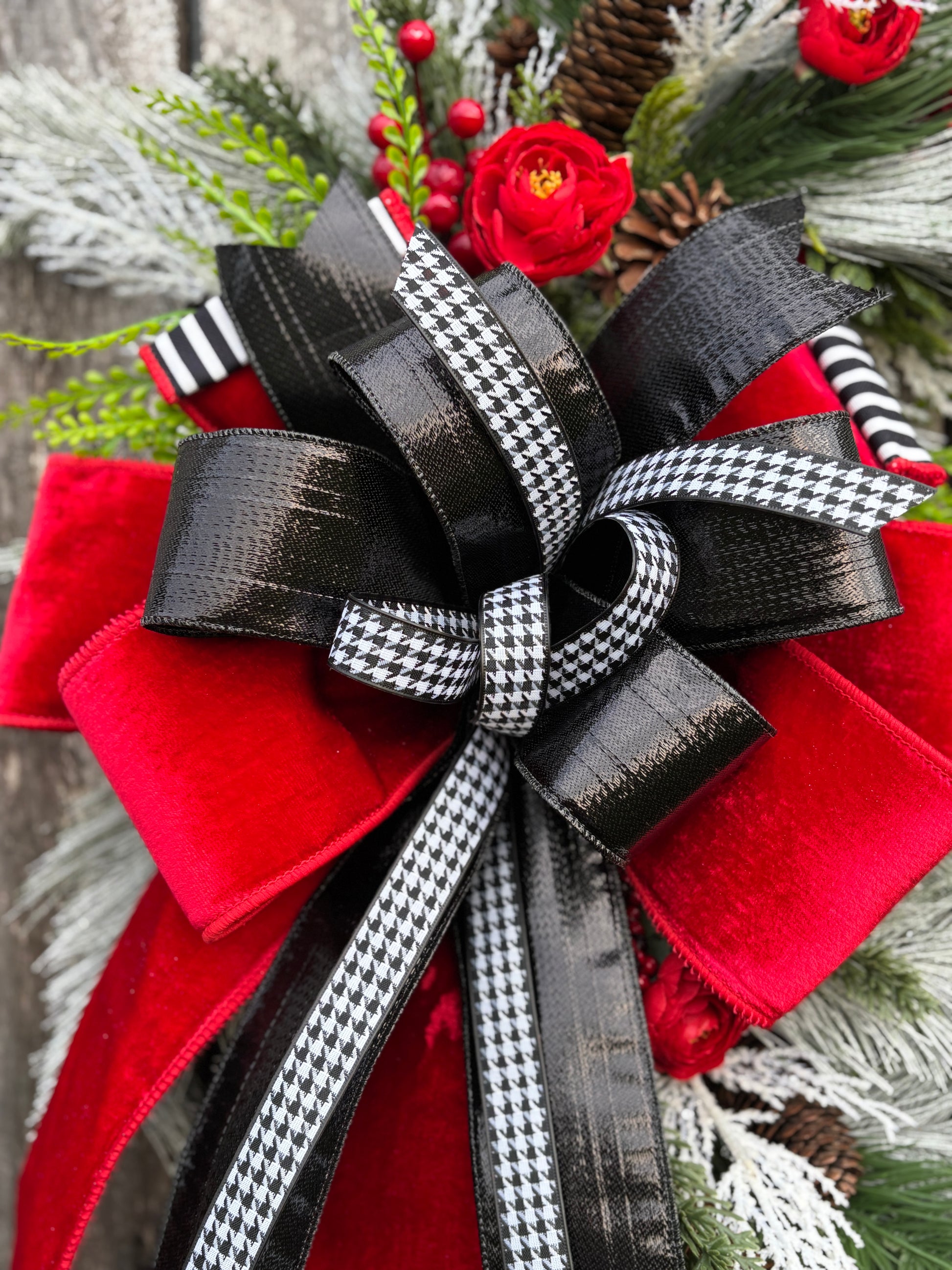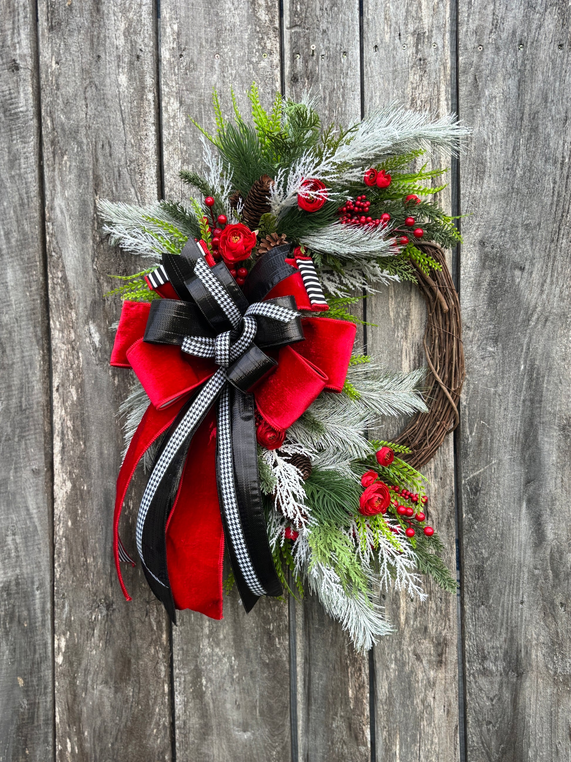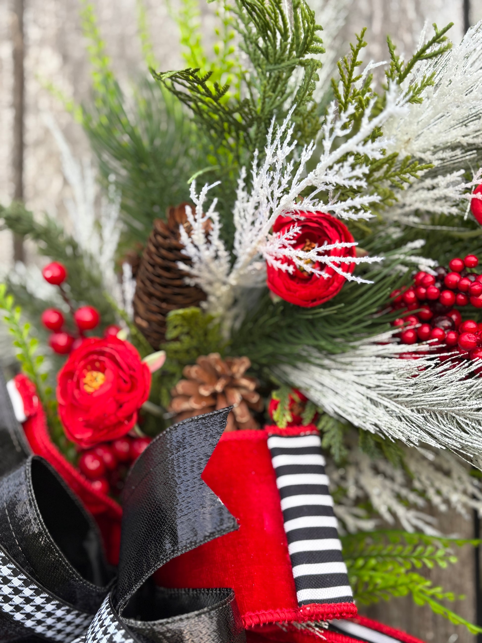 Designed with lush frosted greenery, vibrant red berries, pinecones, and pops of red florals, this wreath captures the magic of Christmas. The bold velvet red bow paired with black and houndstooth ribbon adds a modern yet timeless touch, making it ideal for your front door, entryway, mantel, or above a fireplace.
