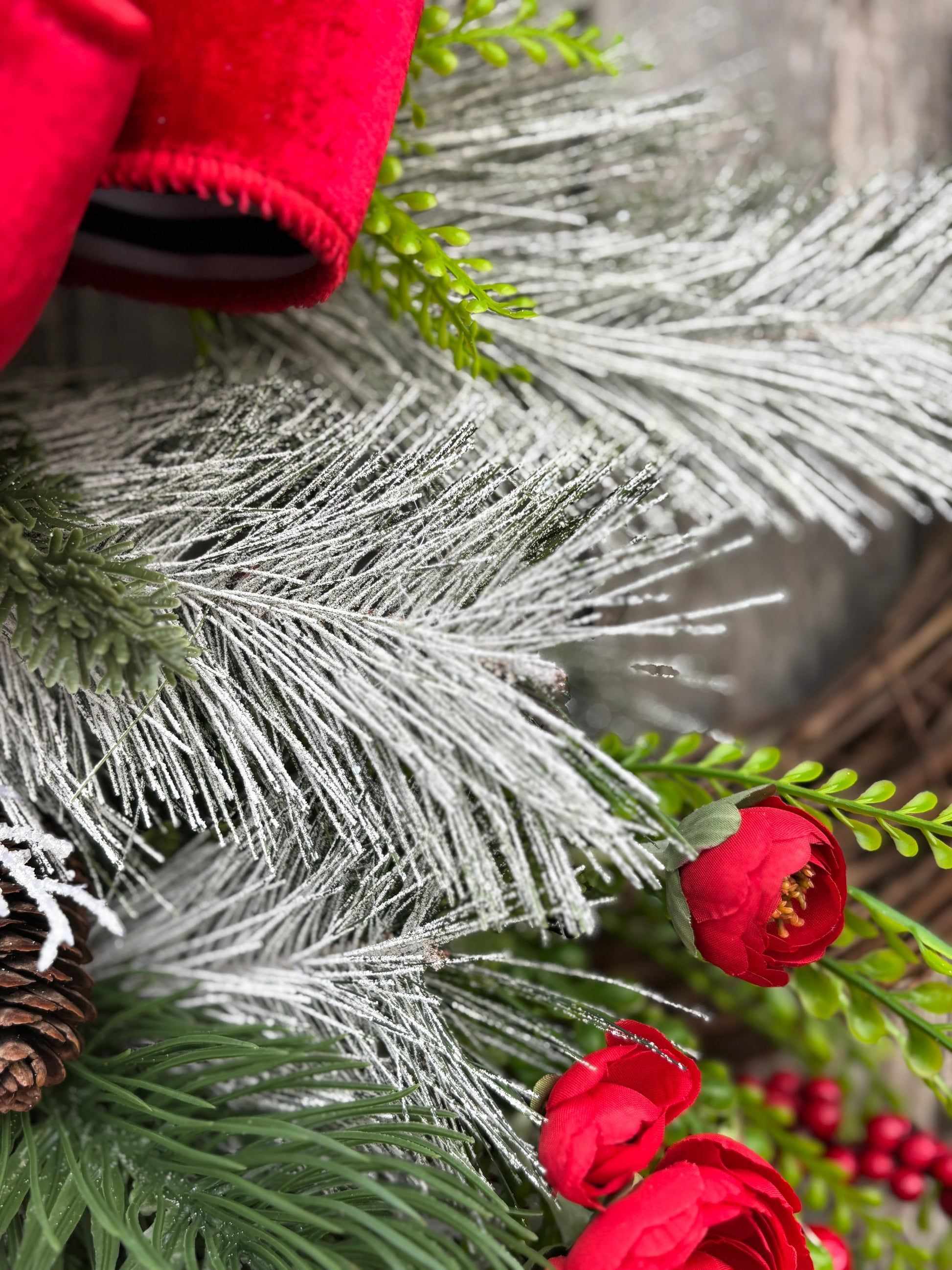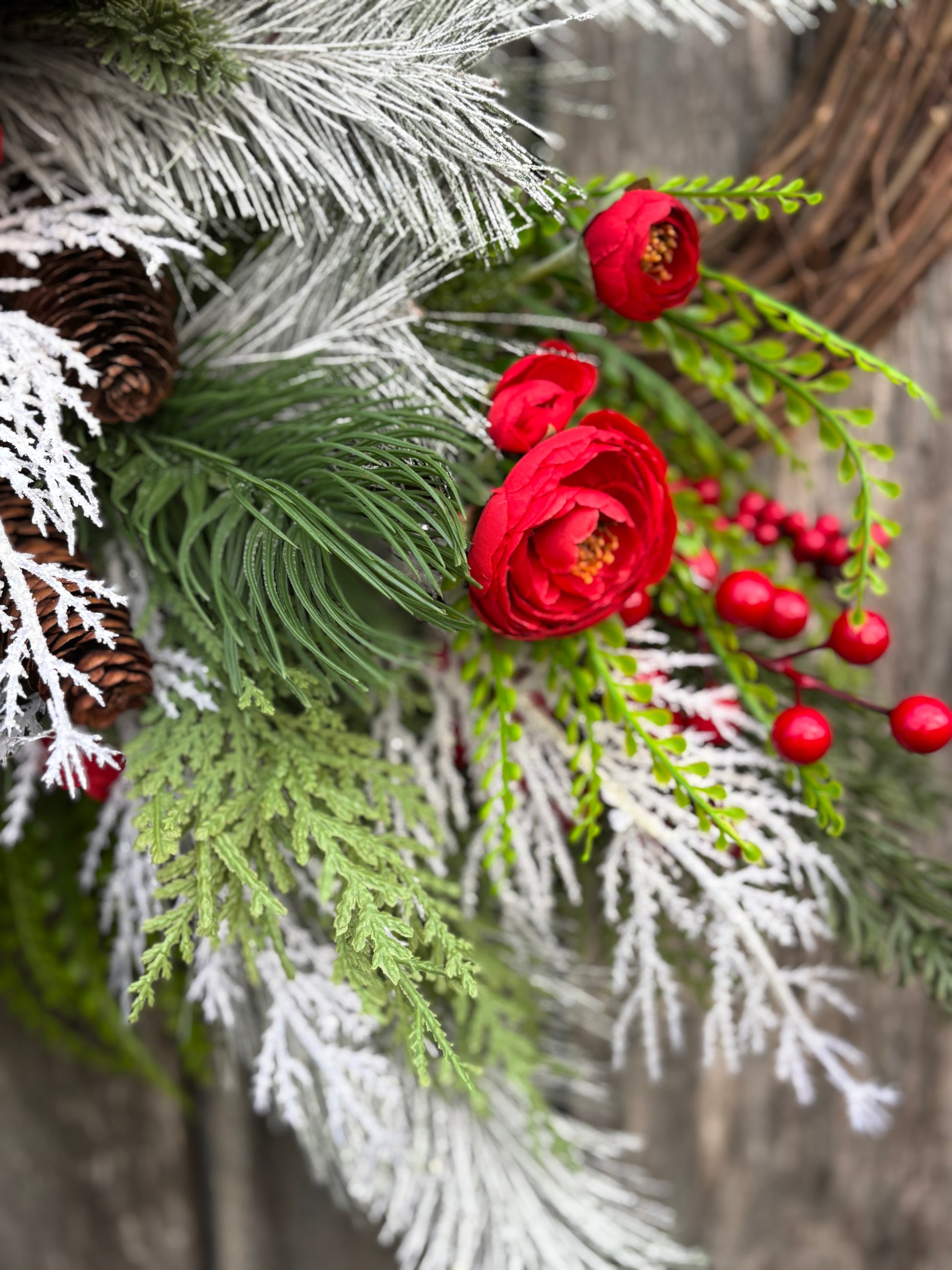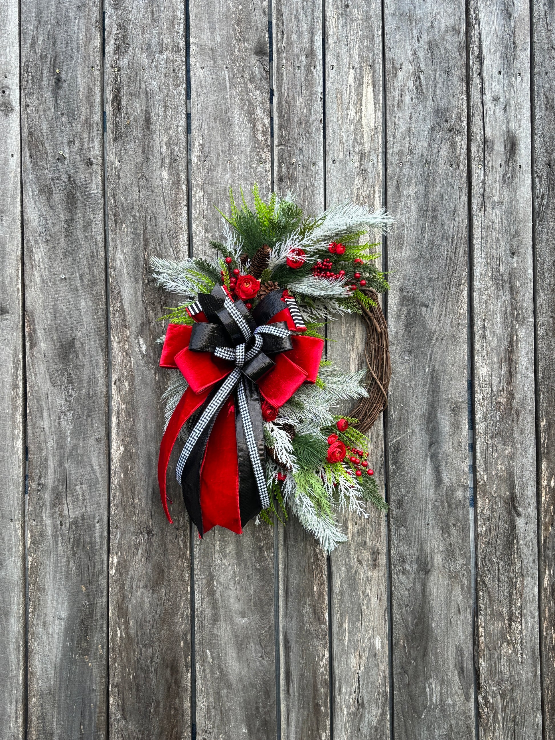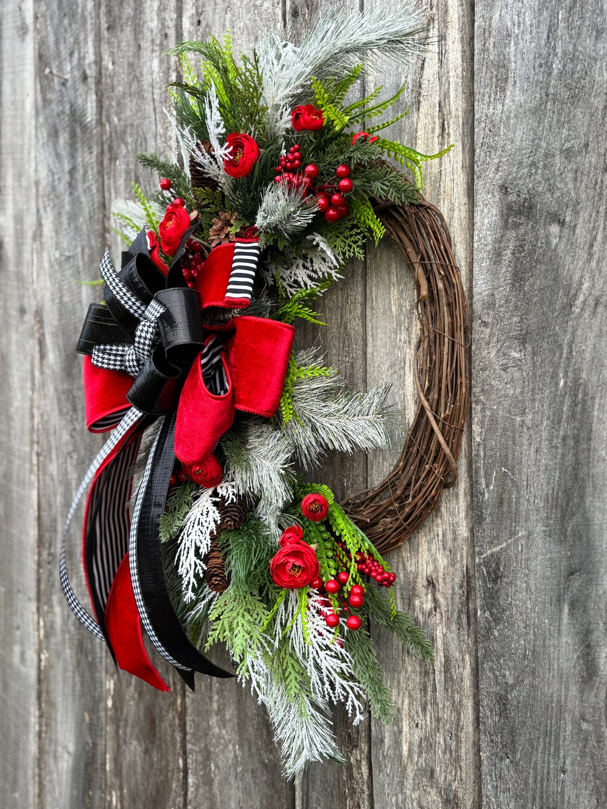 Designed with lush frosted greenery, vibrant red berries, pinecones, and pops of red florals, this wreath captures the magic of Christmas. The bold velvet red bow paired with black and houndstooth ribbon adds a modern yet timeless touch, making it ideal for your front door, entryway, mantel, or above a fireplace.