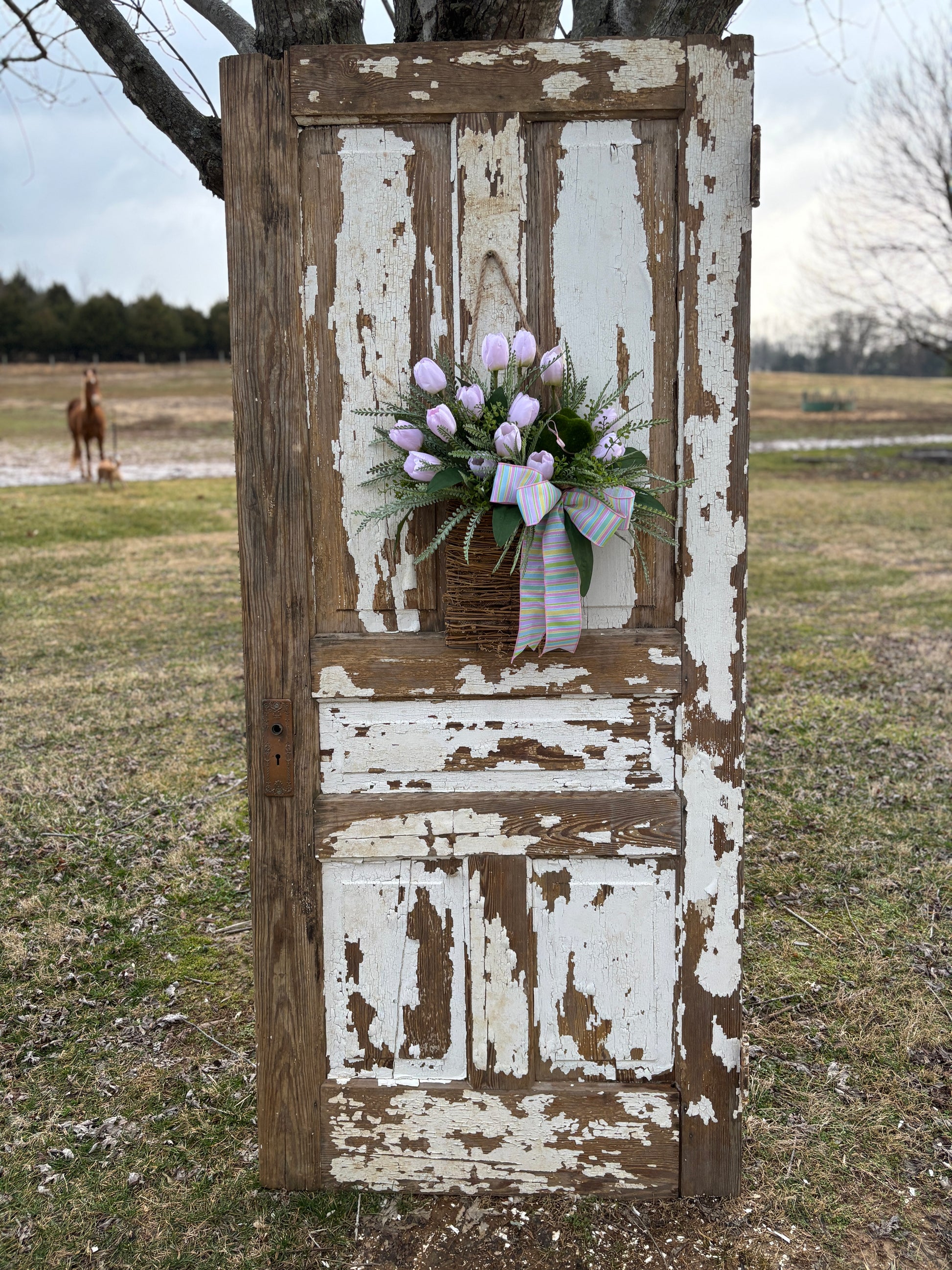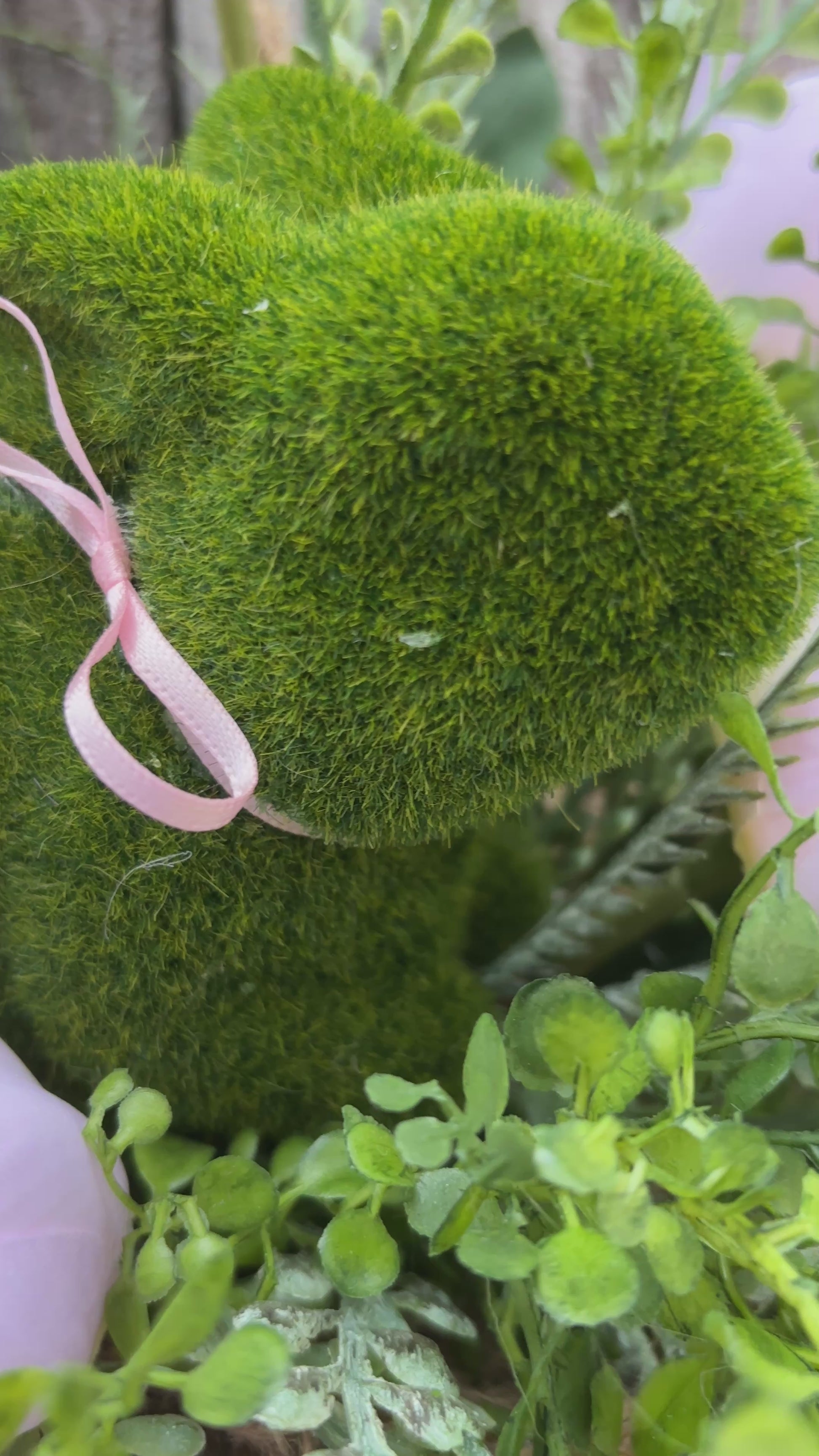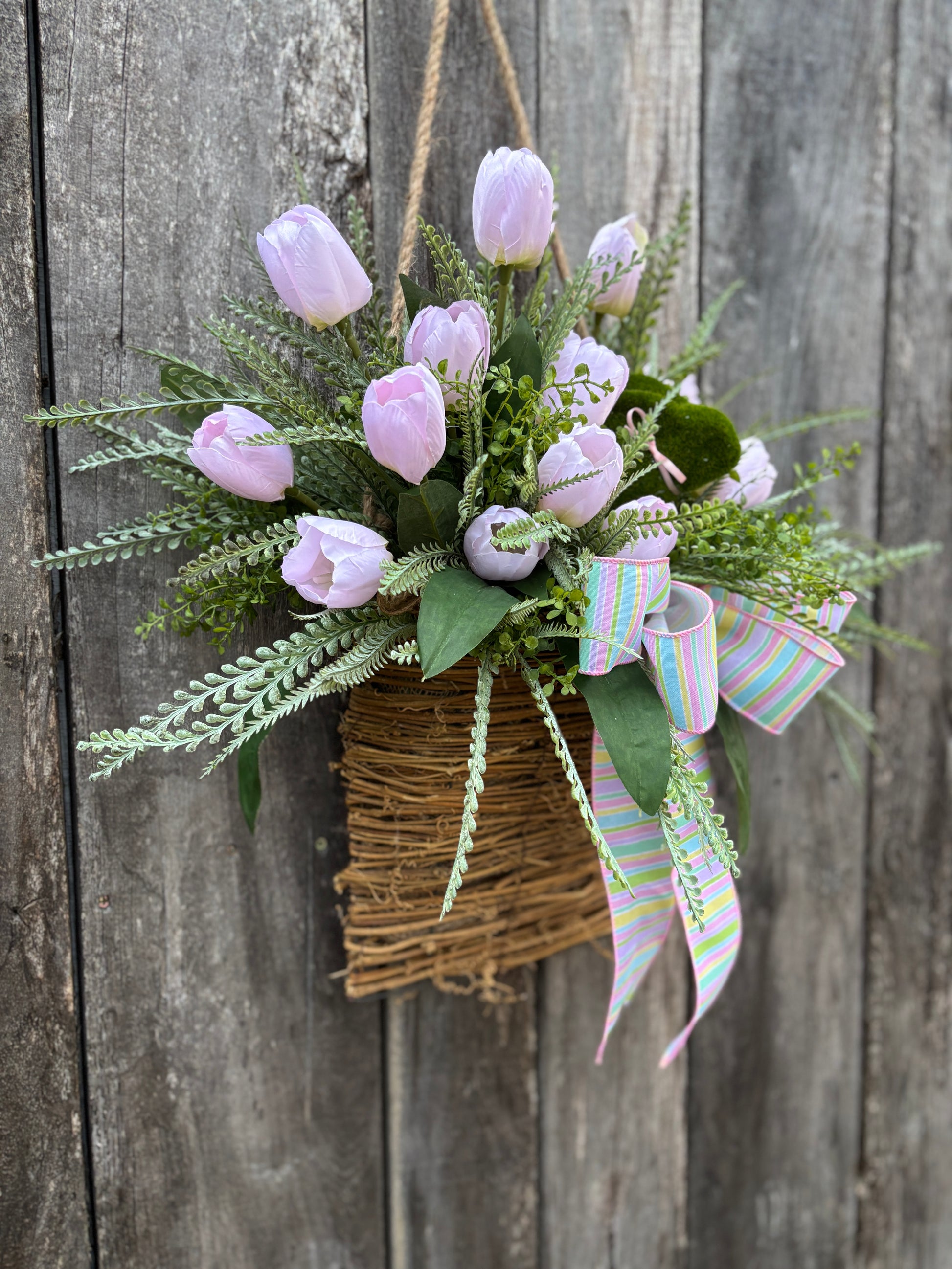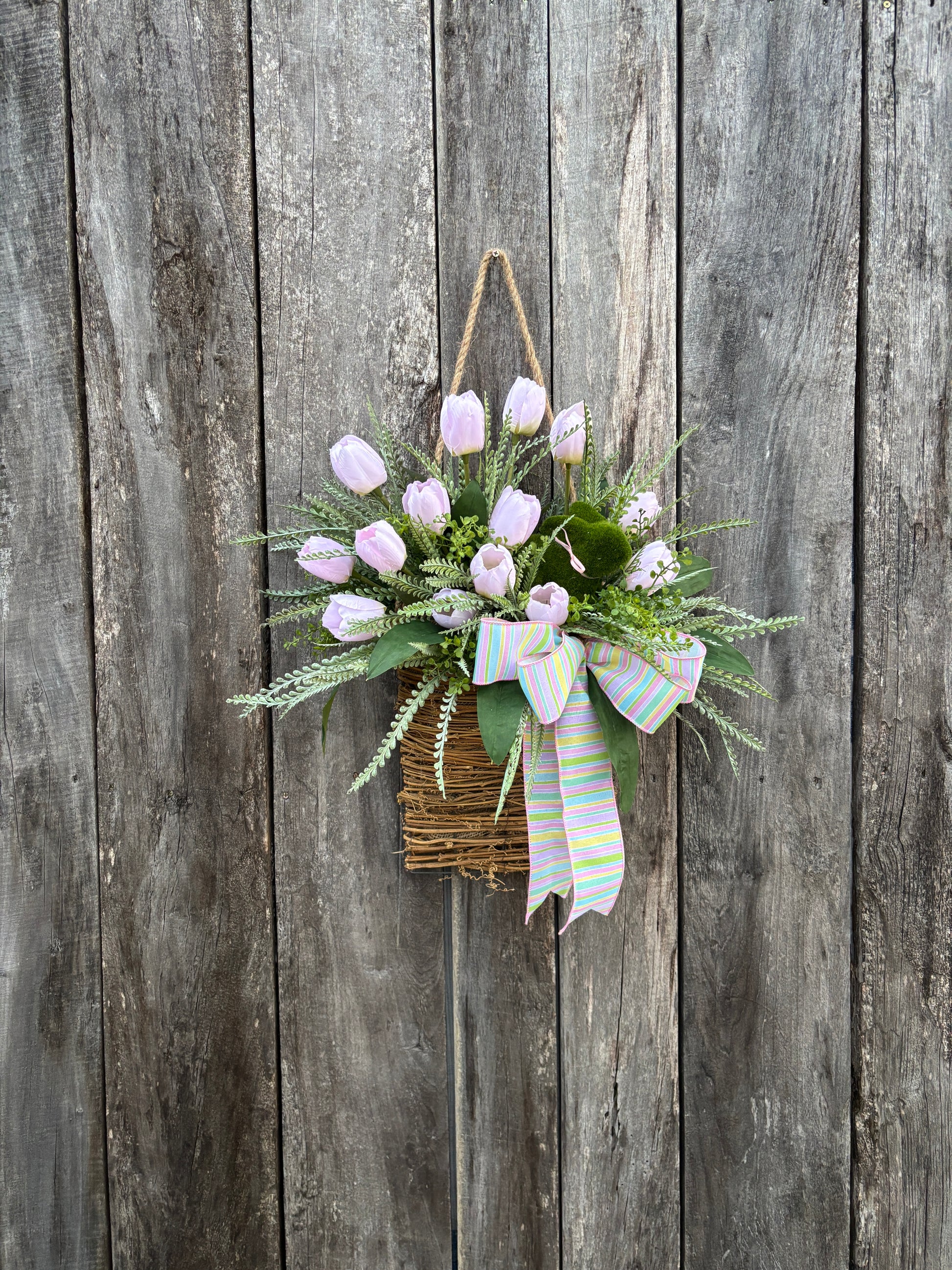 What truly sets this piece apart is its thoughtful details: a pastel striped bow brings a burst of cheerful color, perfectly echoing the hues of the season, while a moss bunny nestled among the tulips adds a whimsical touch that’s perfect for Easter.