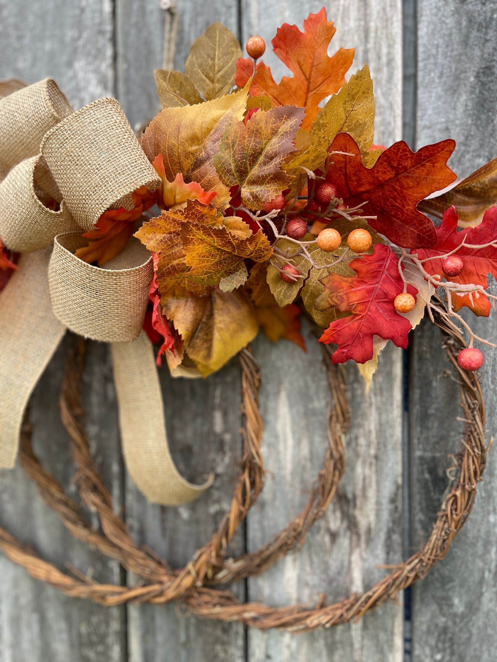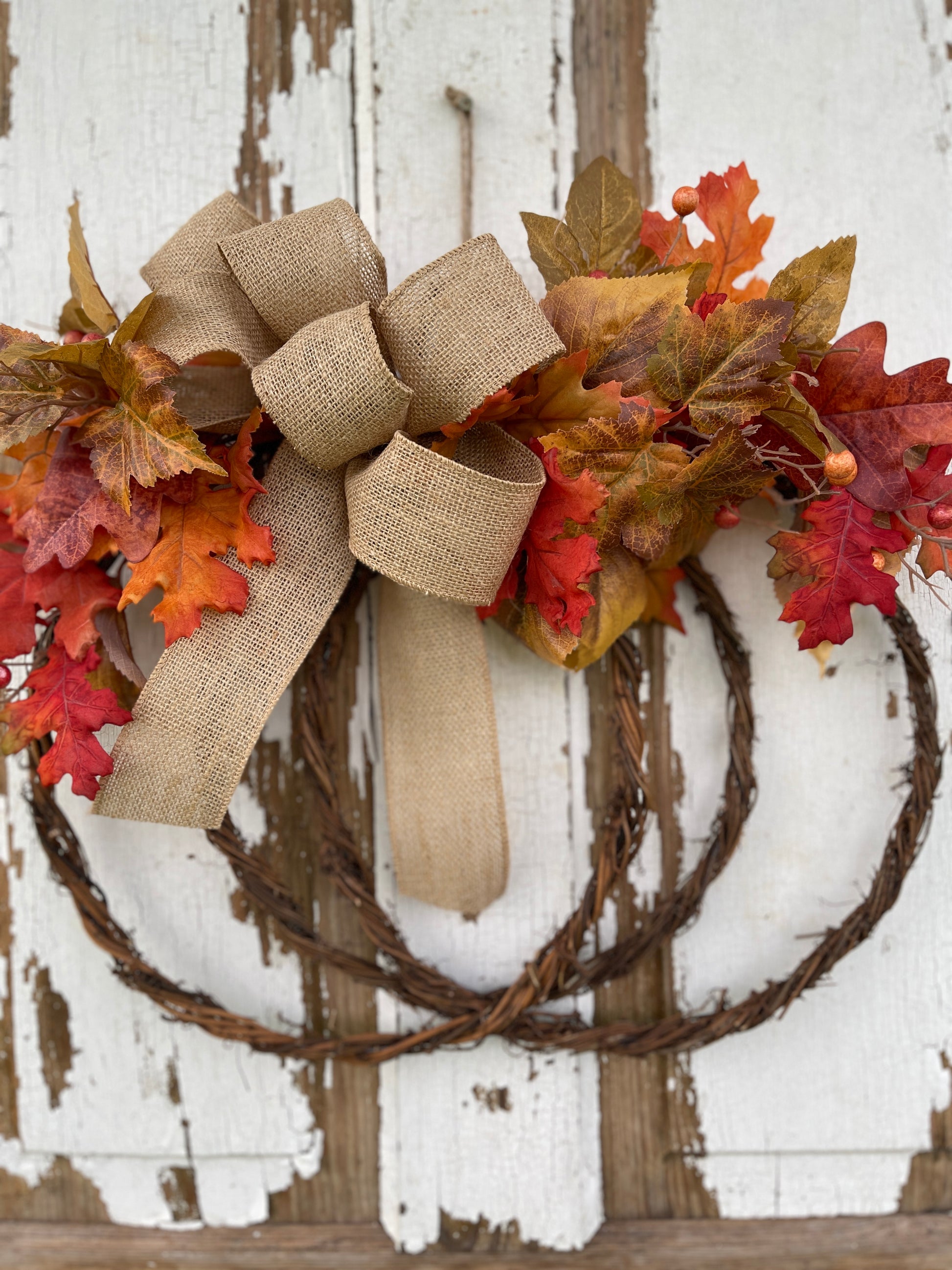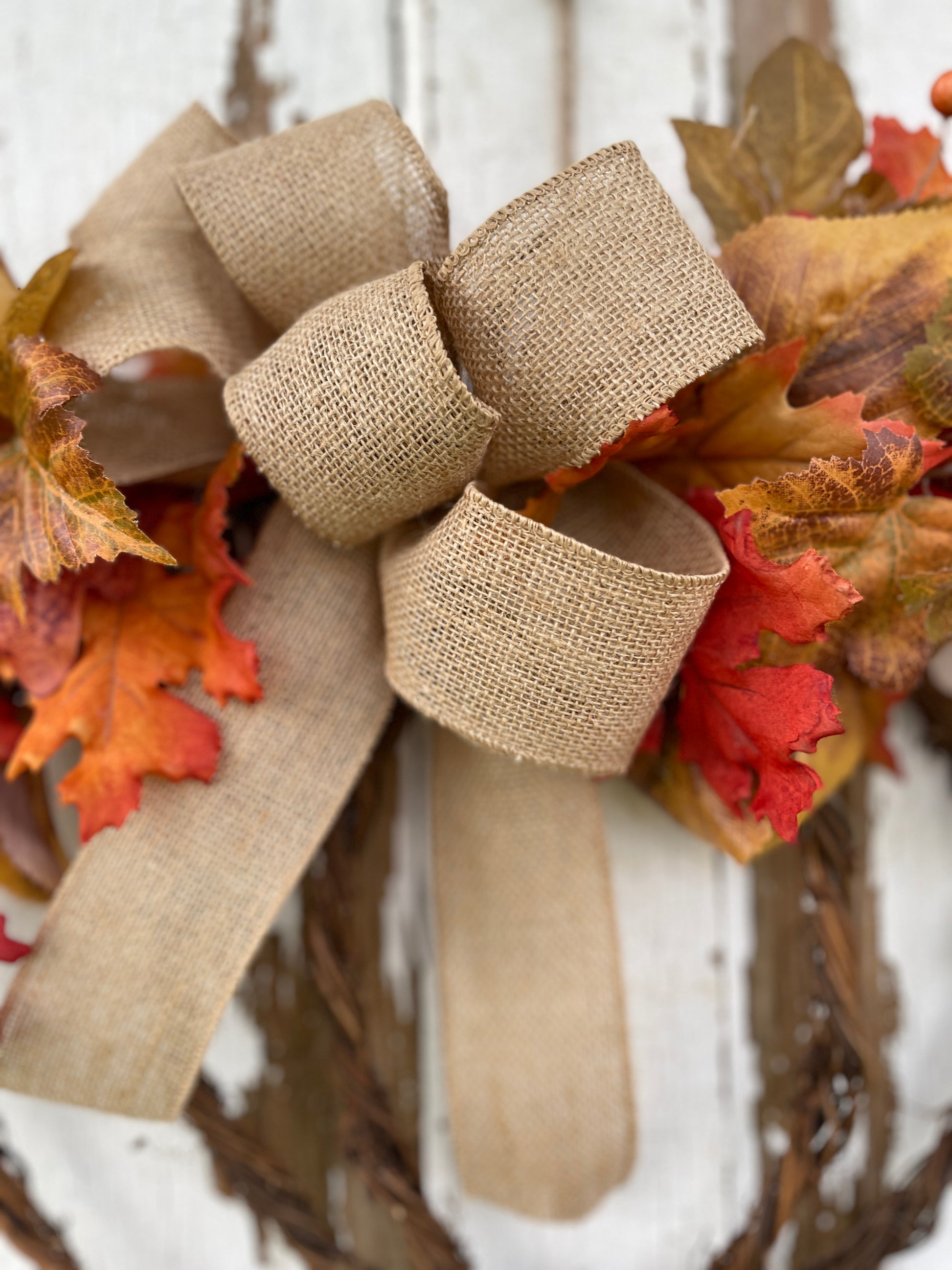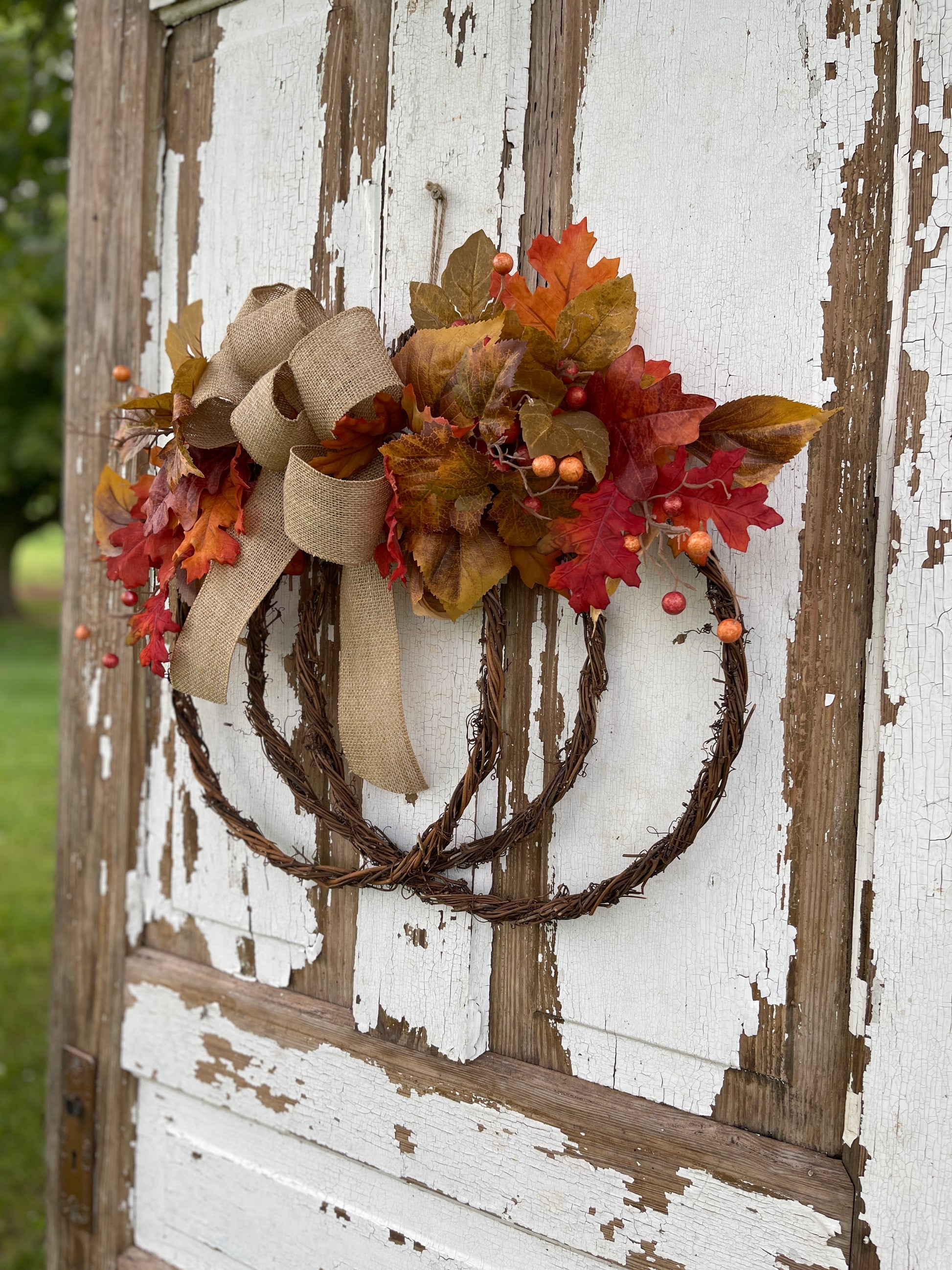 - Materials: Grapevine wreath base, felt pumpkin, blue eucalyptus, lamb’s ear, assorted fall leaves, burlap bow