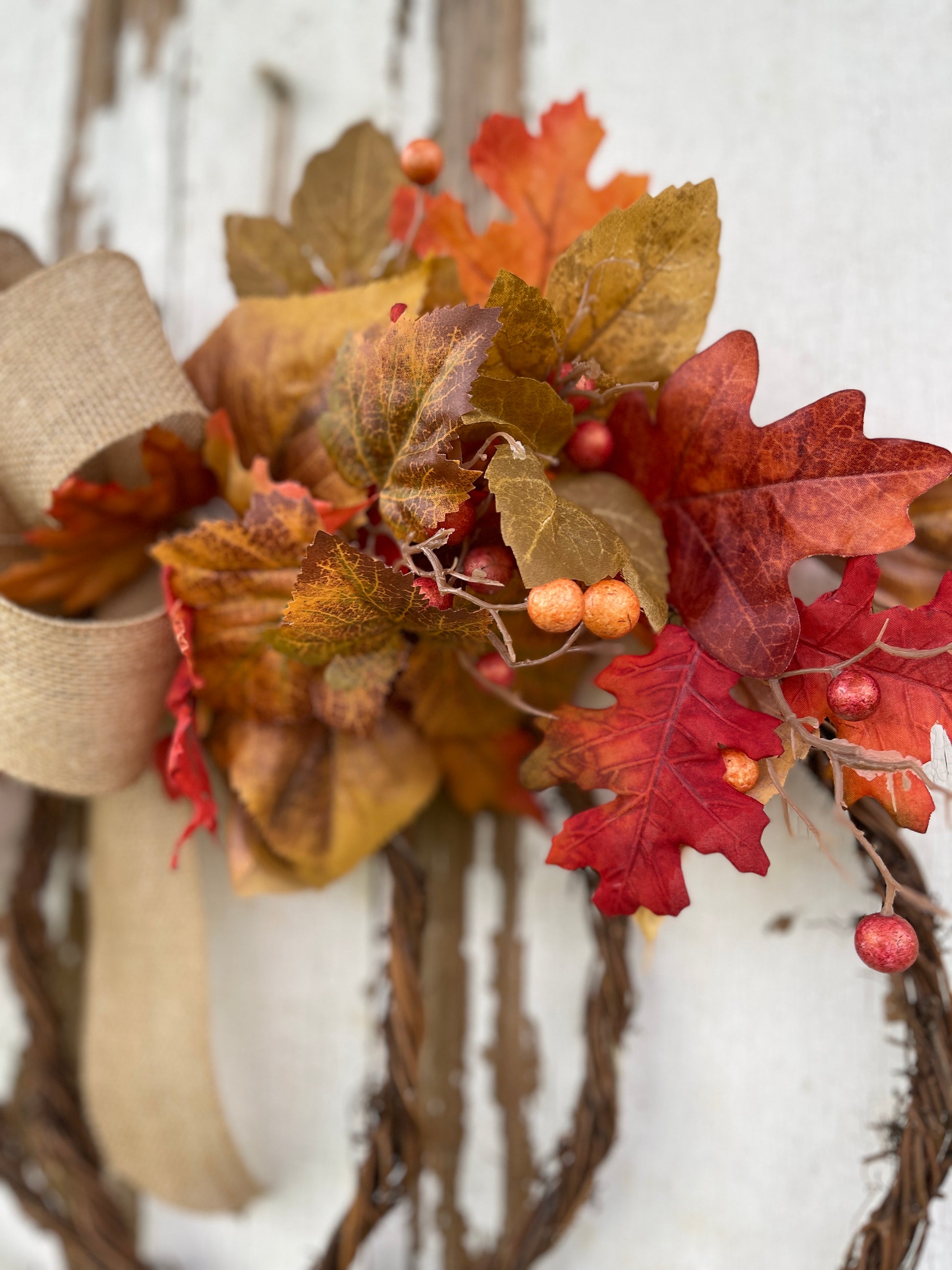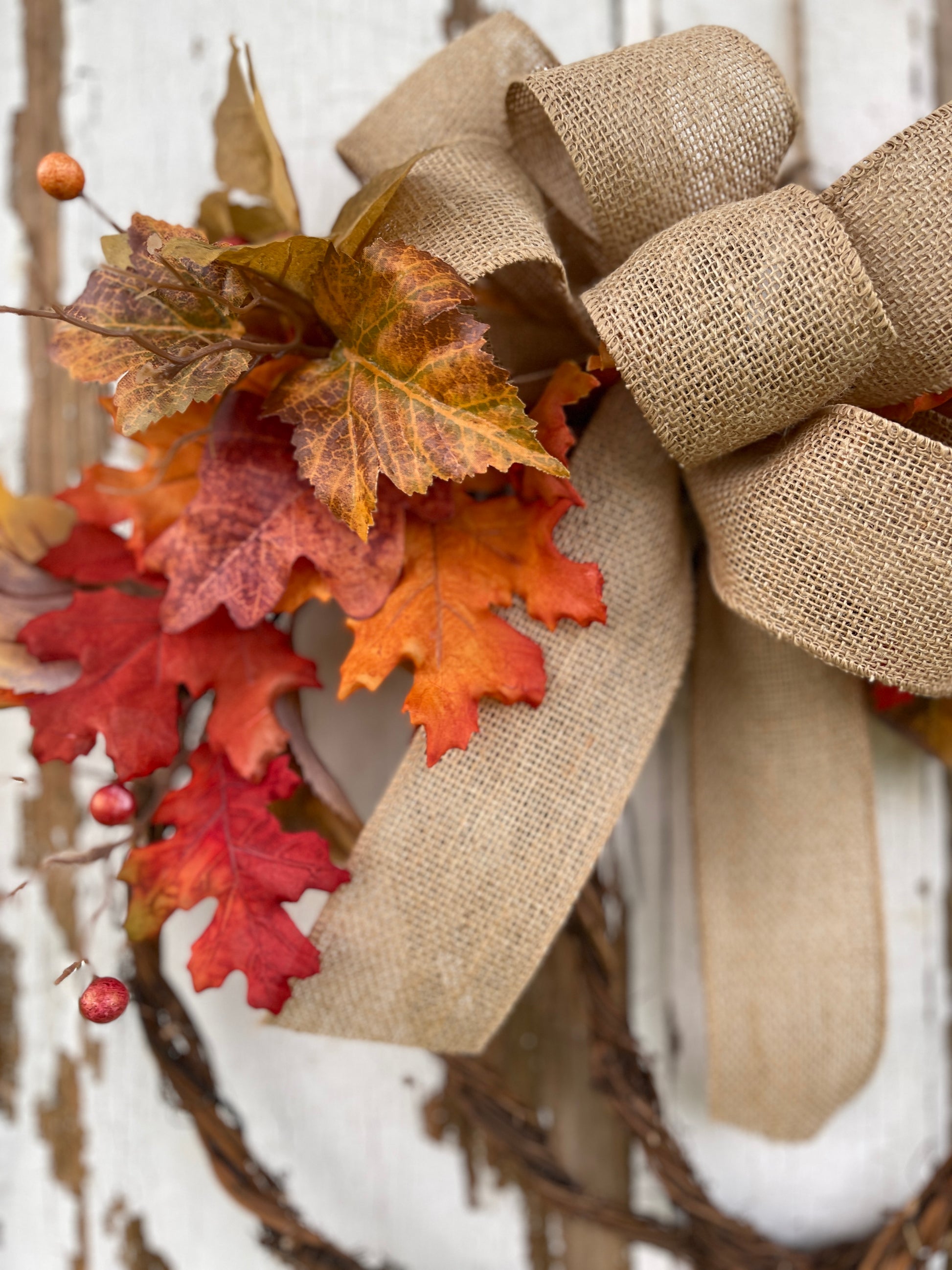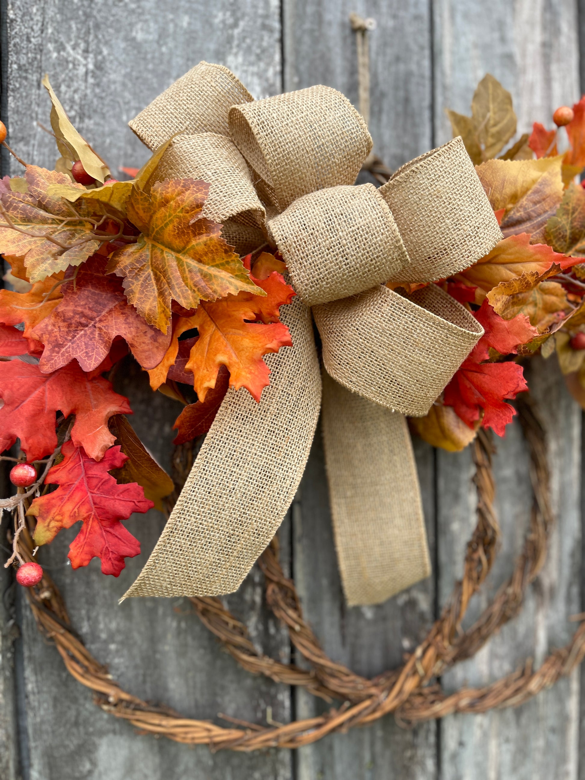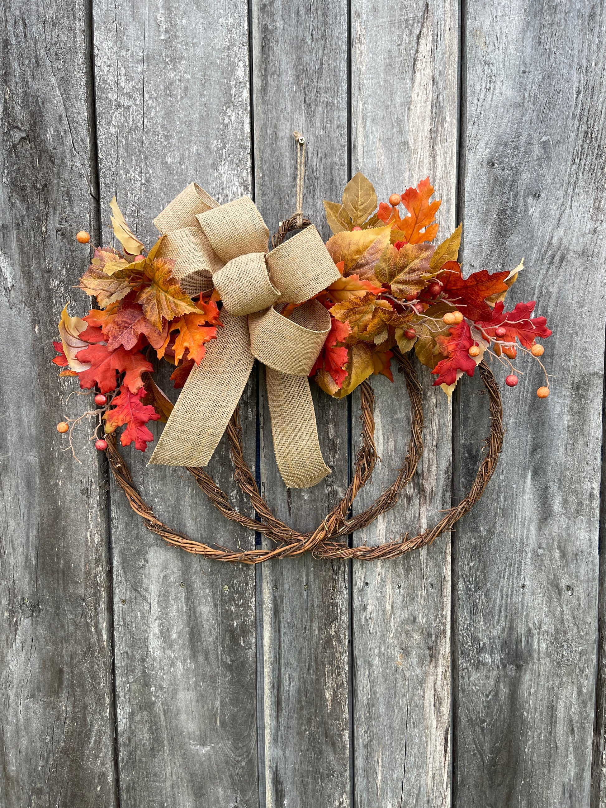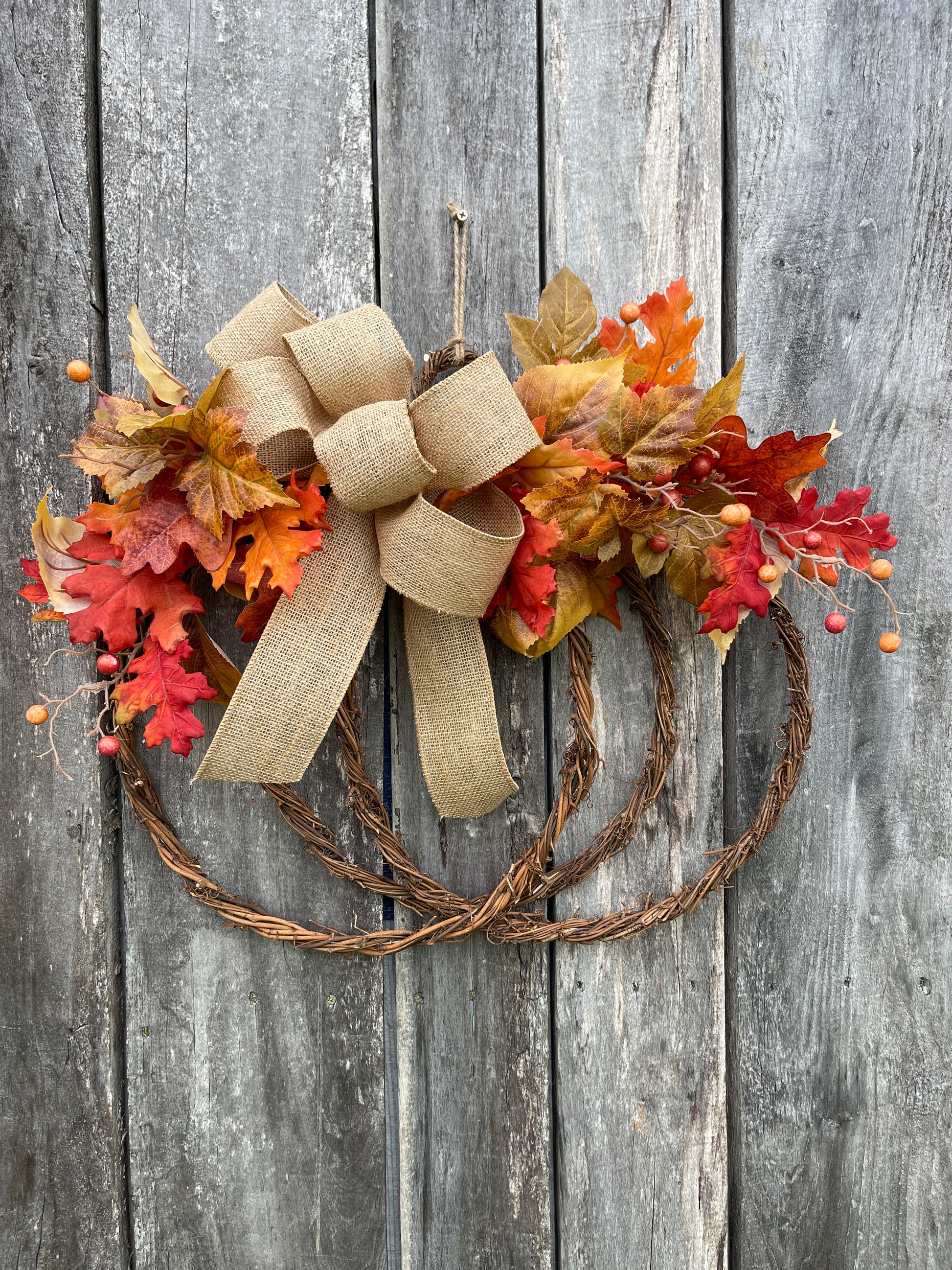 - Materials: Grapevine wreath base, felt pumpkin, blue eucalyptus, lamb’s ear, assorted fall leaves, burlap bow