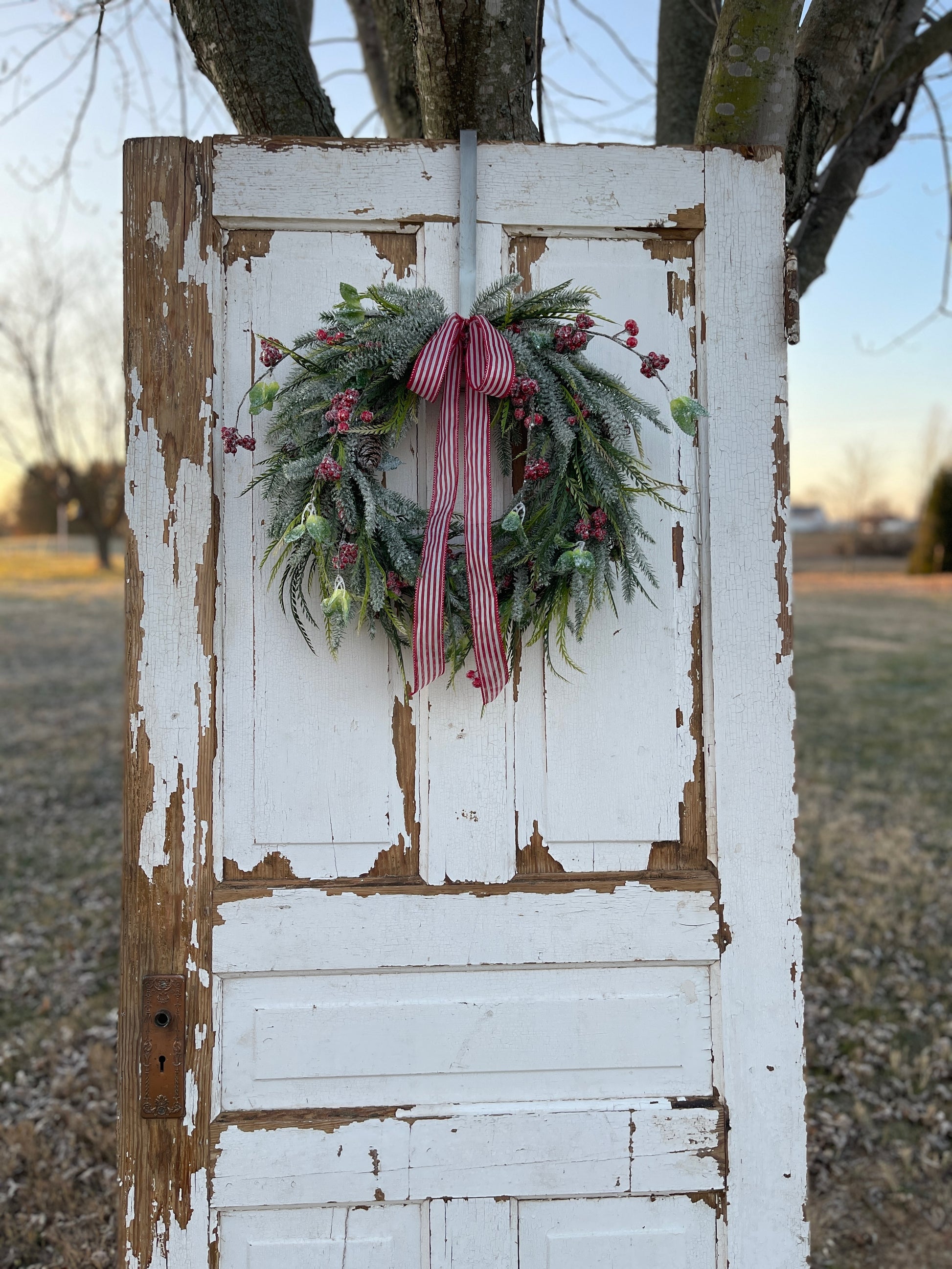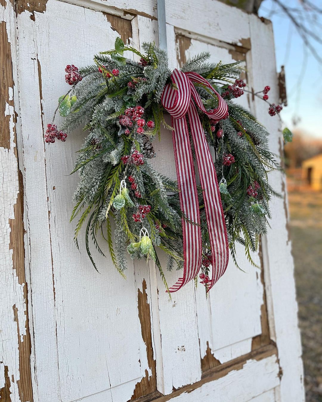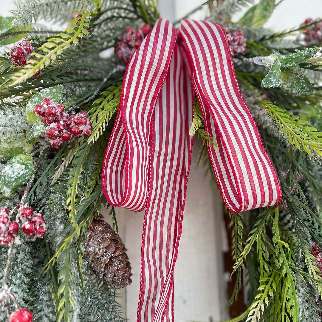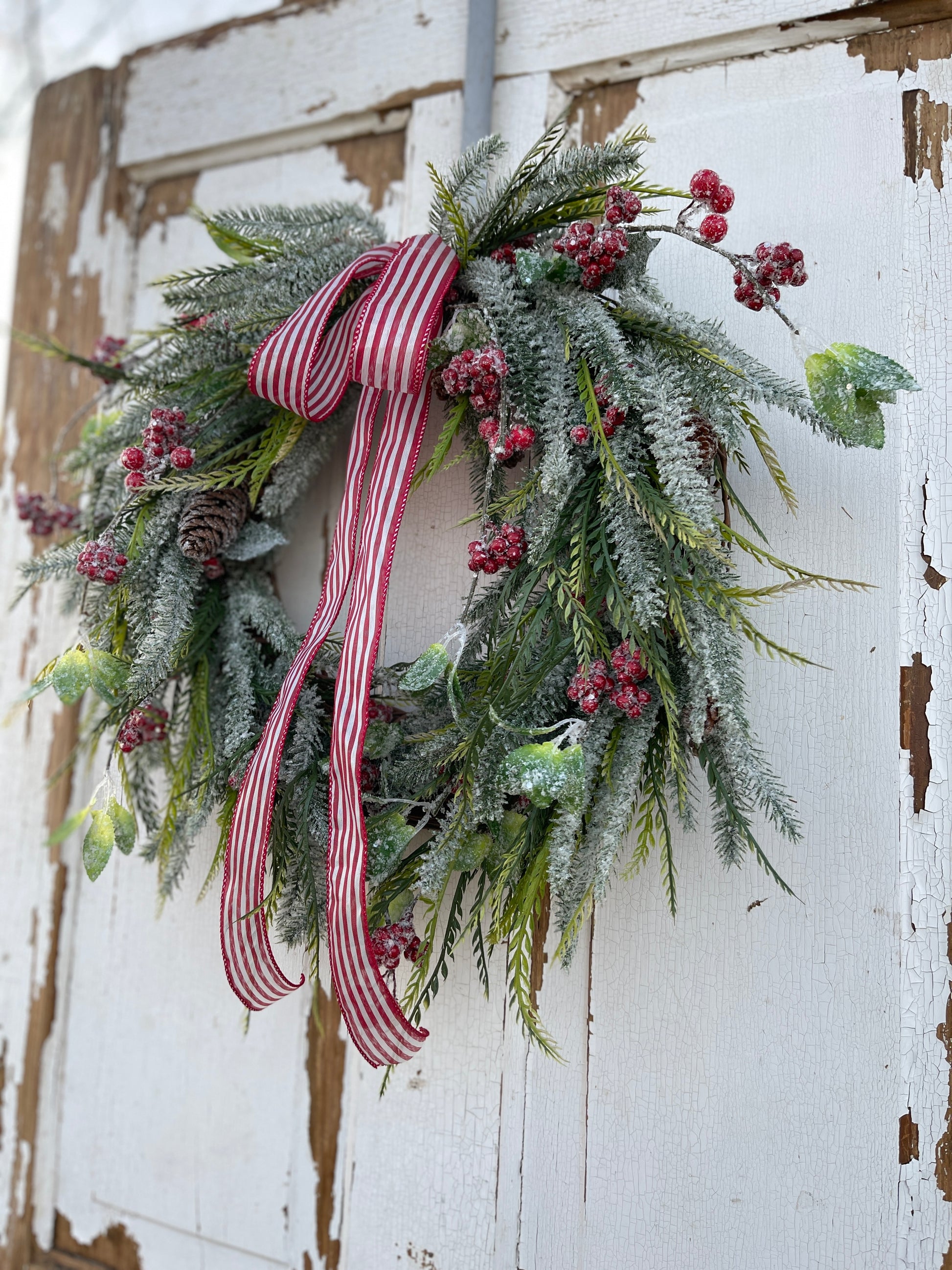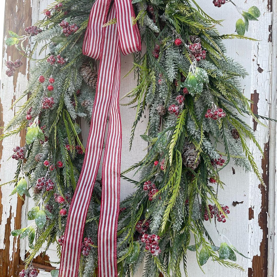 - **Design:** A beautiful combination of frosted pine and cedar branches, accented with red berries and a classic red and white striped ribbon