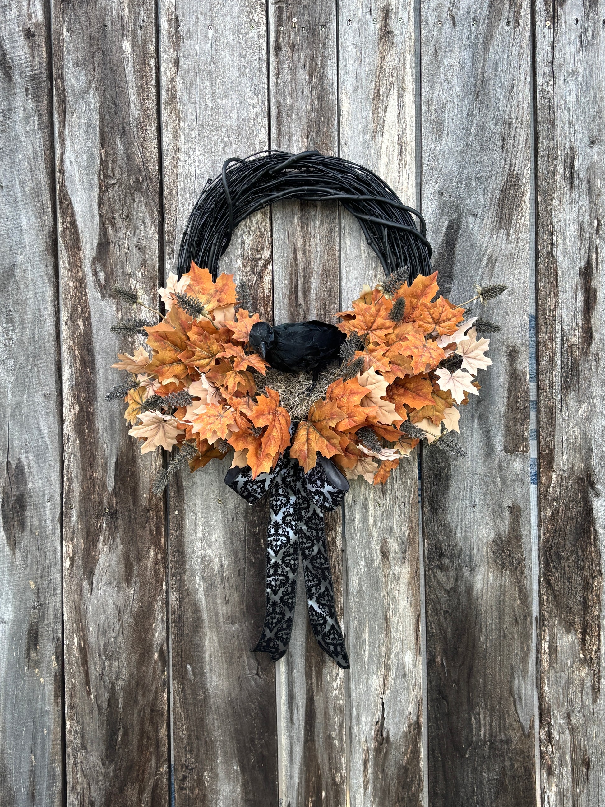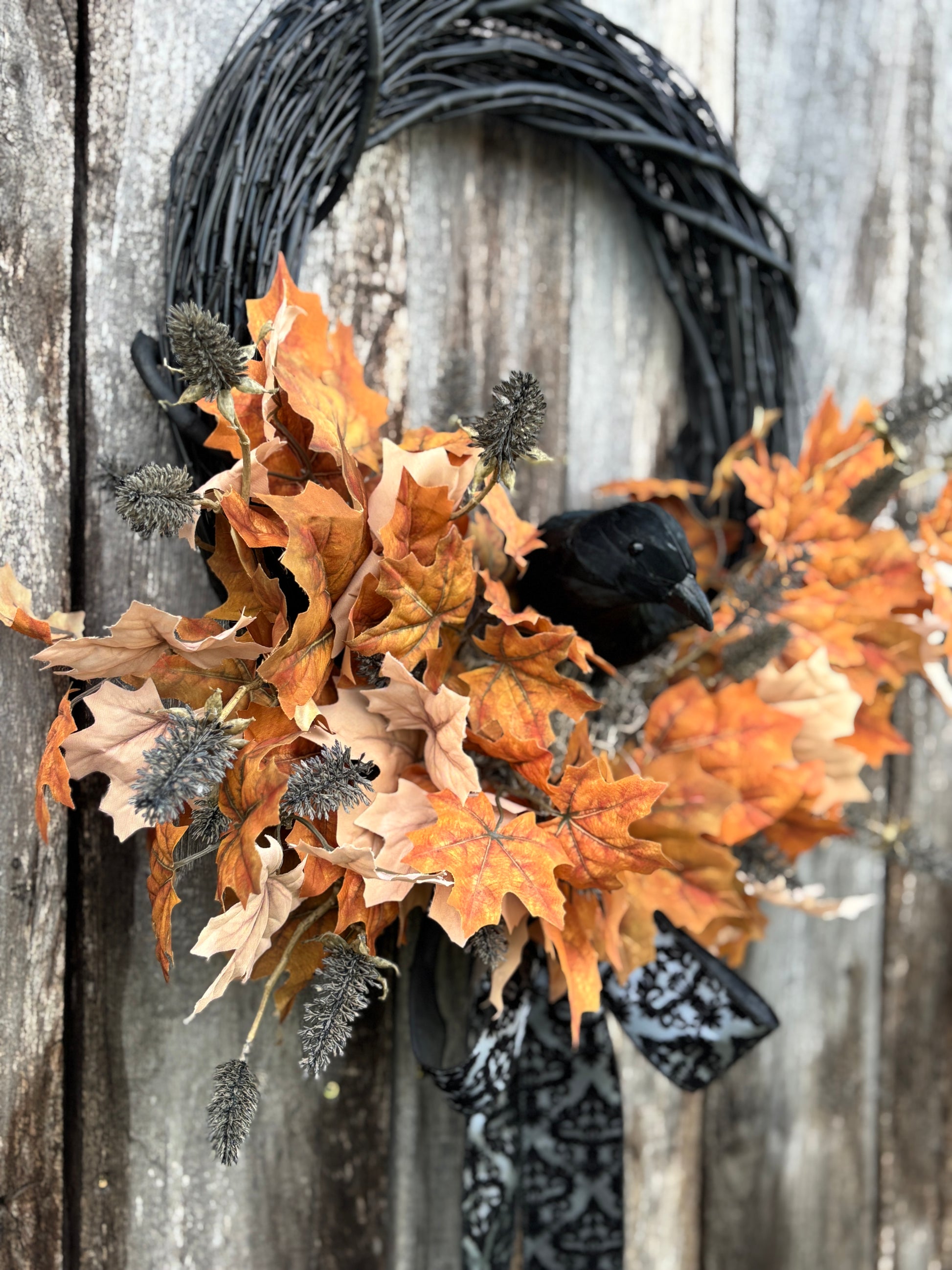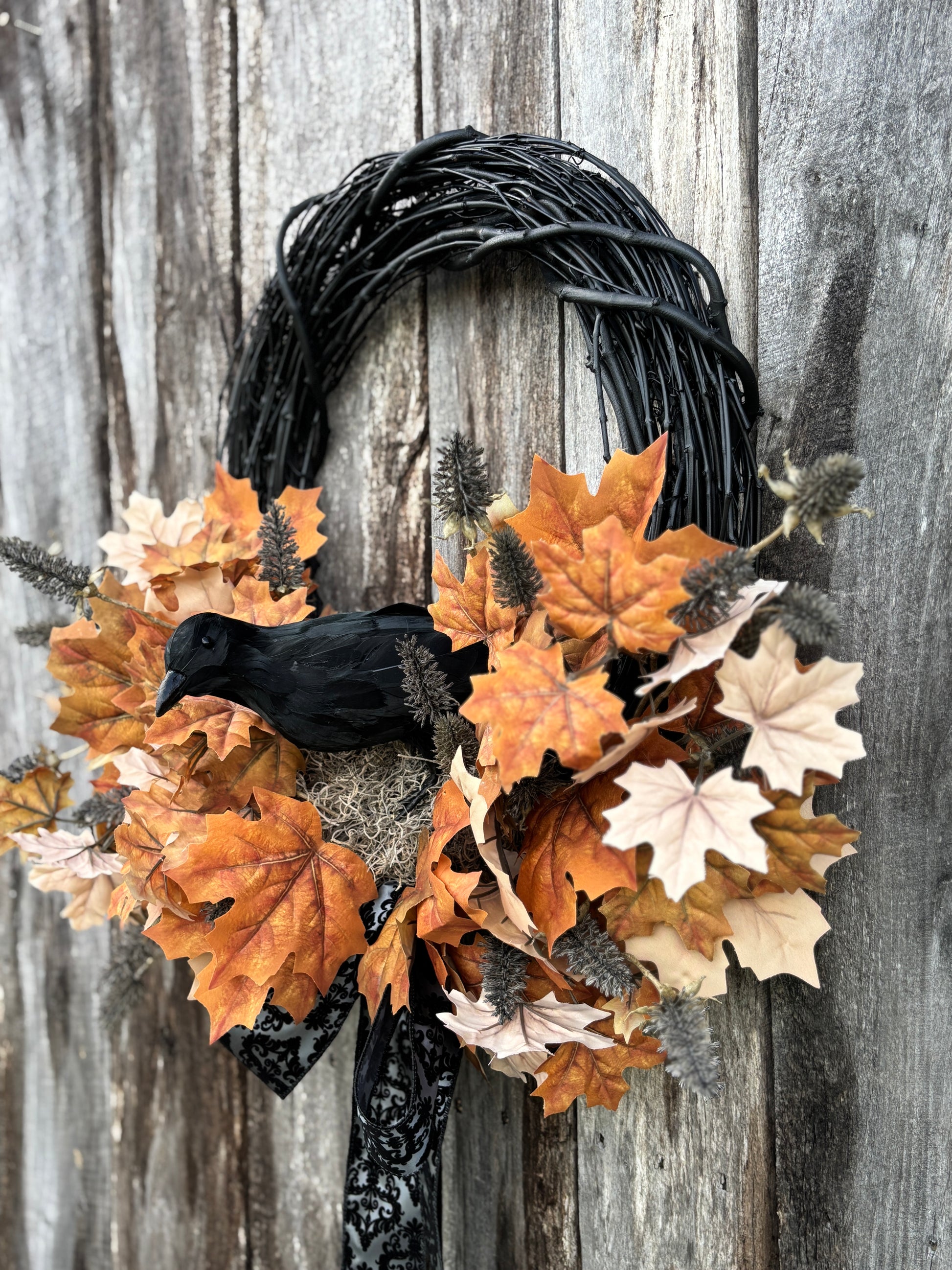 Black Raven Halloween Wreath will add a touch of spooky elegance to your front door with this handcrafted wreath. Built on an 18” black grapevine base and measuring approximately 23” in diameter (not including the ribbon tail), this design features a striking black crow nestled among layers of vibrant brown and cream maple leaves, textured black fall thistles, and a dramatic black damask ribbon.