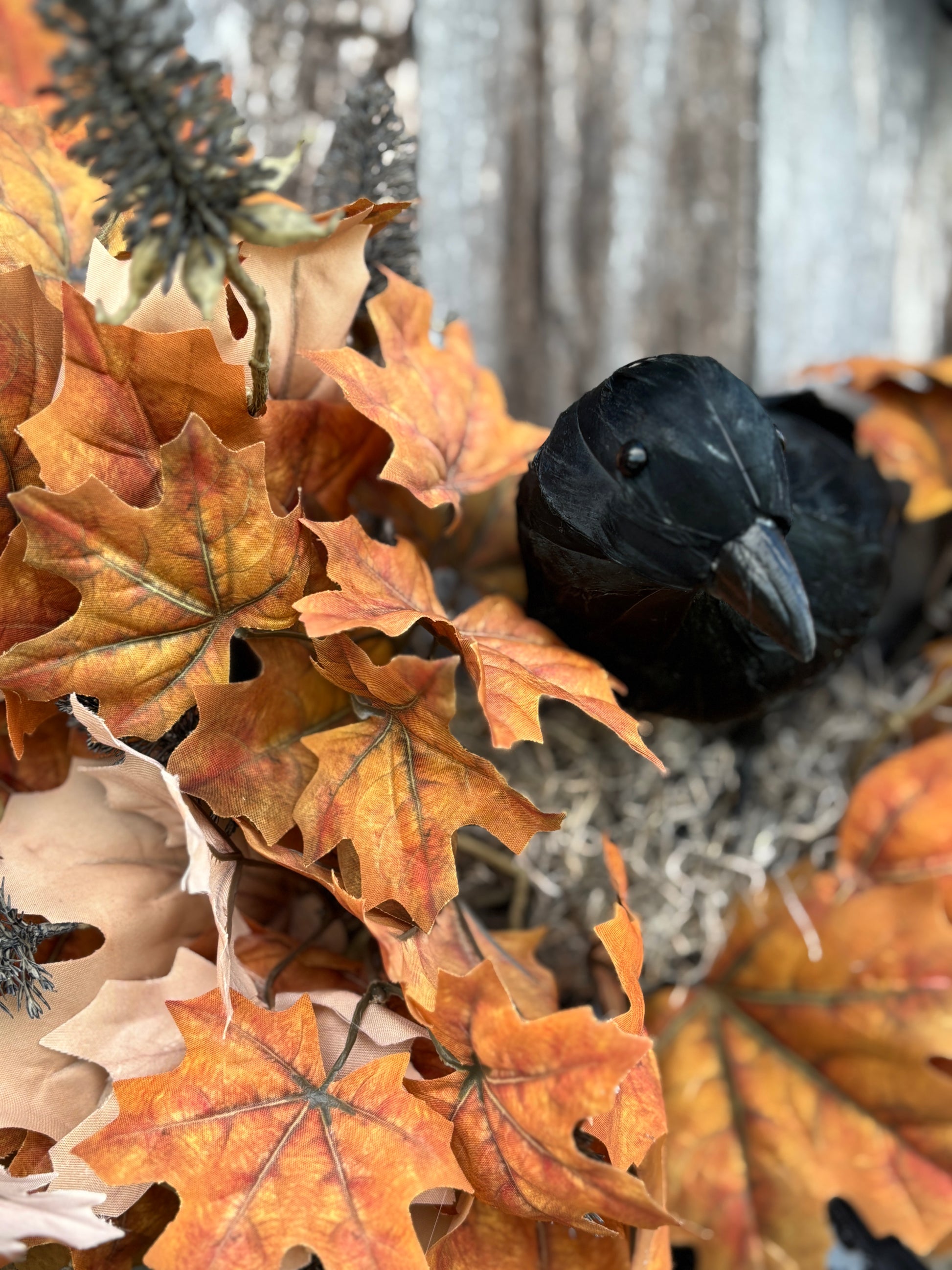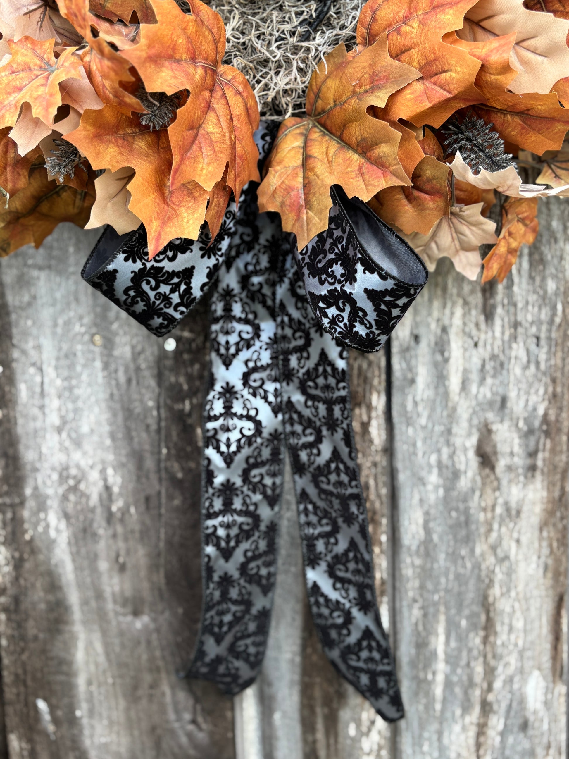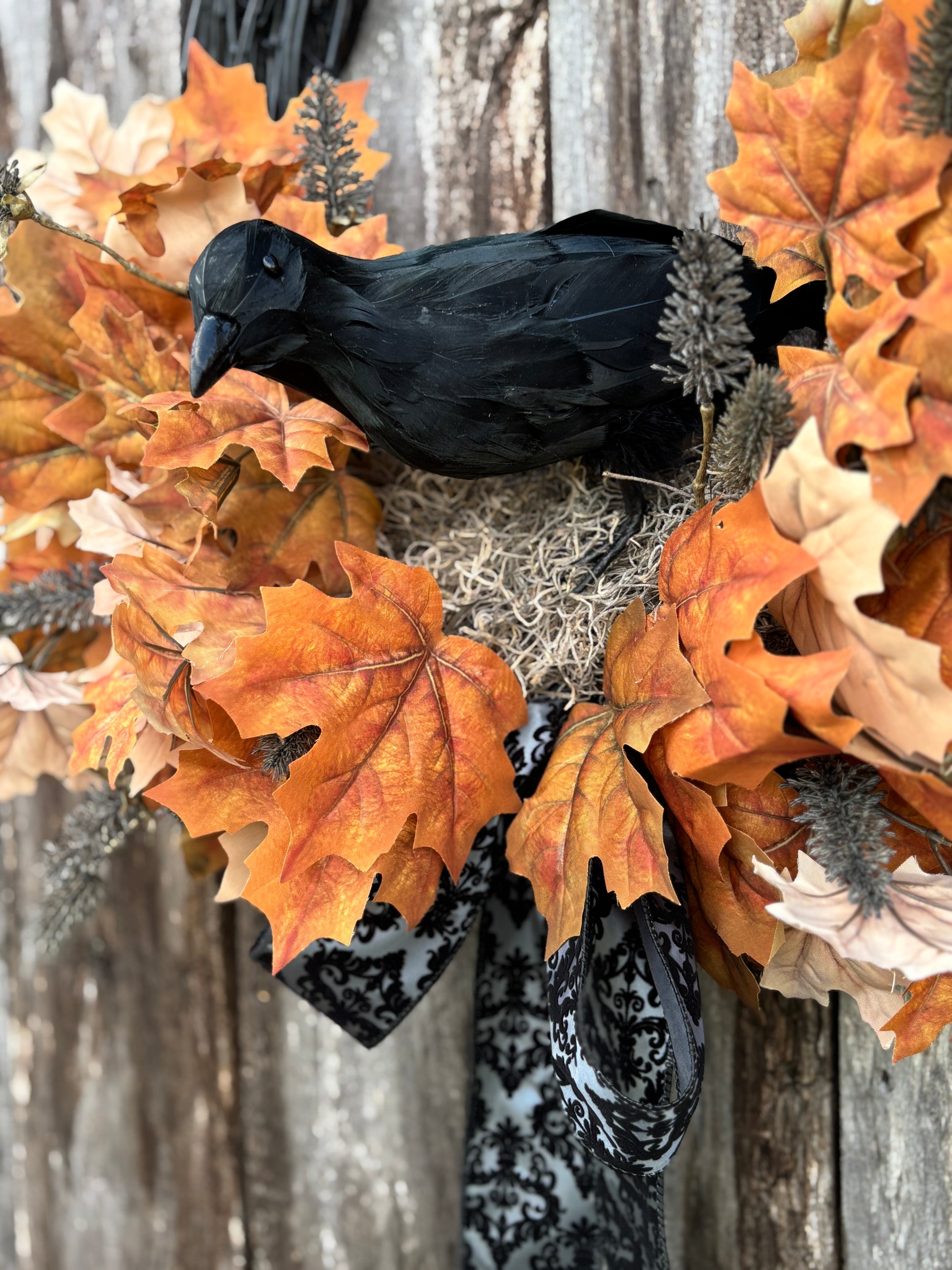 Black Raven Halloween Wreath will add a touch of spooky elegance to your front door with this handcrafted wreath. Built on an 18” black grapevine base and measuring approximately 23” in diameter (not including the ribbon tail), this design features a striking black crow nestled among layers of vibrant brown and cream maple leaves, textured black fall thistles, and a dramatic black damask ribbon.