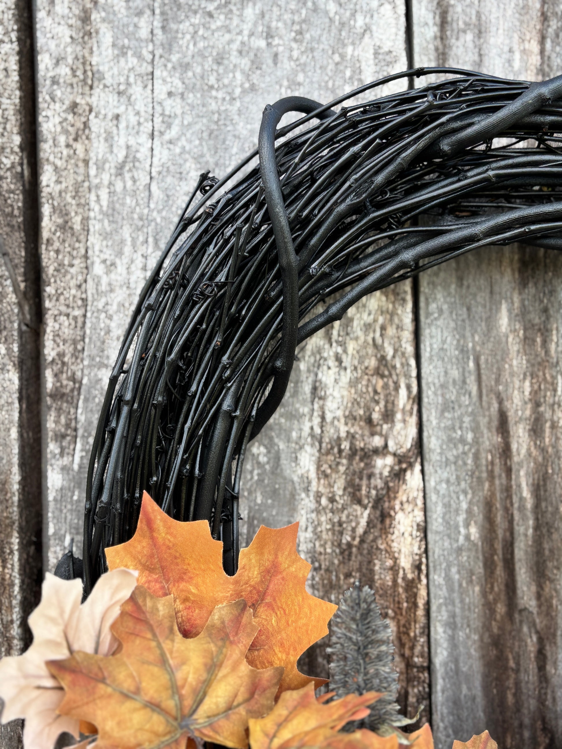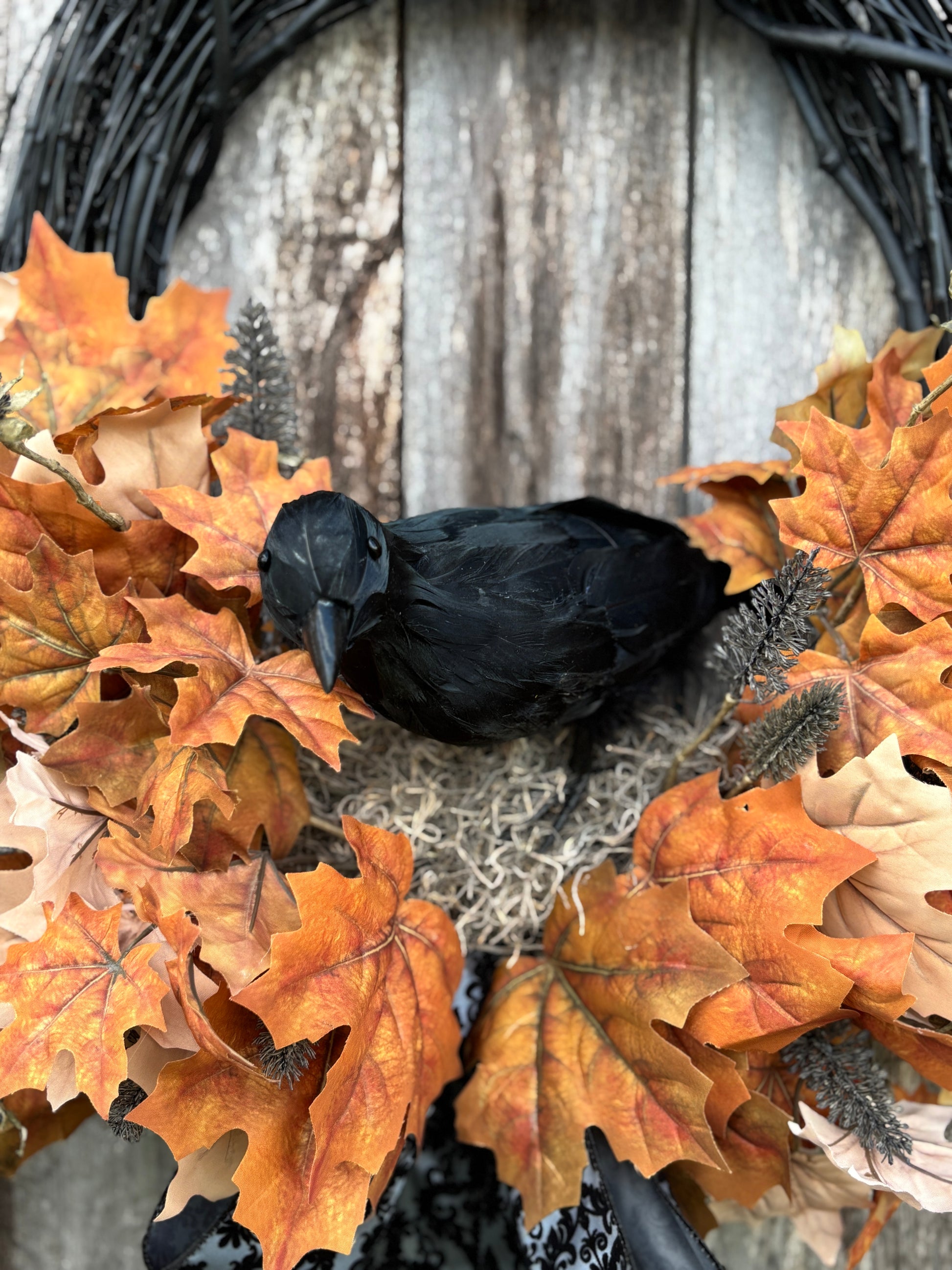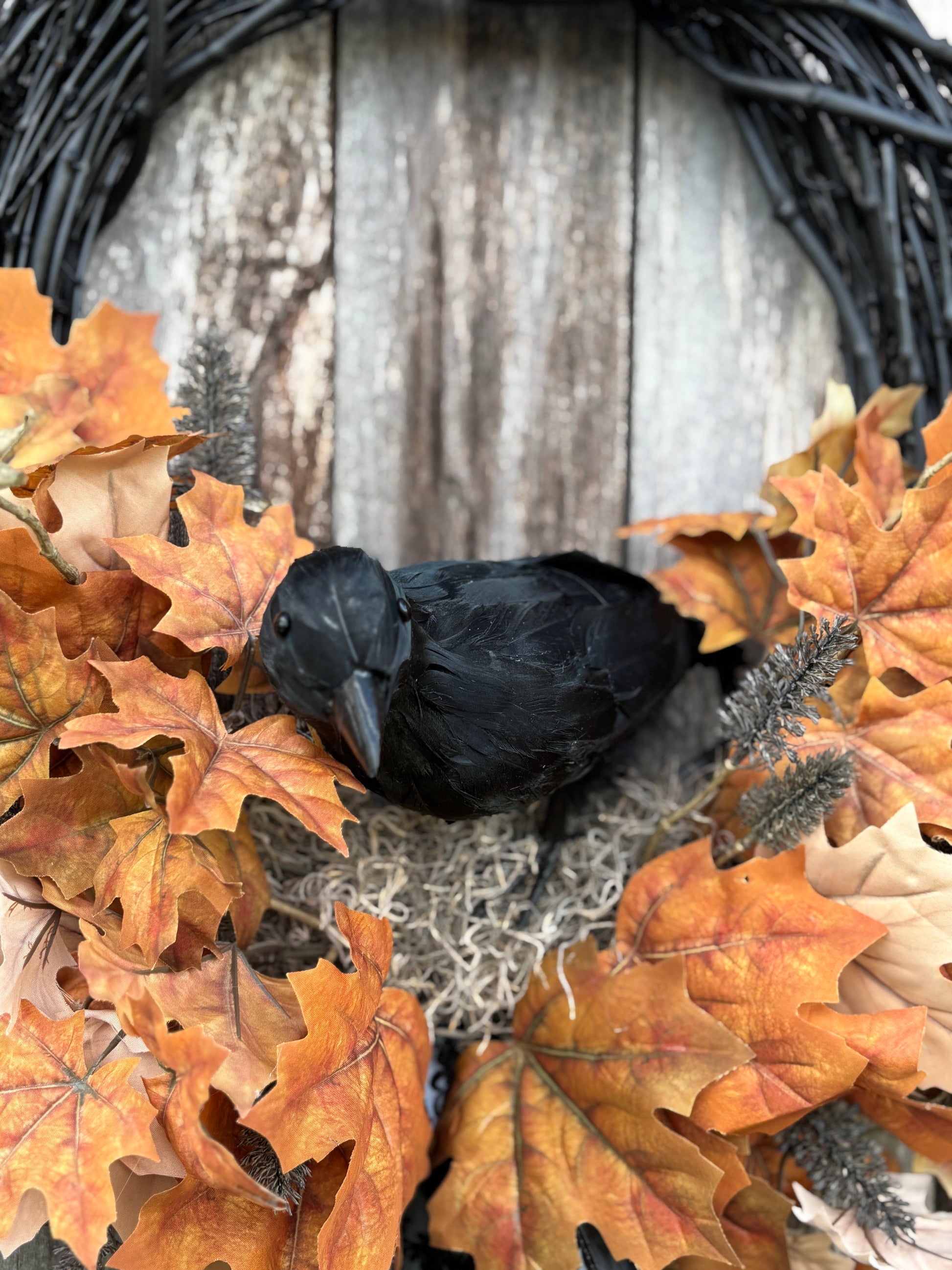 Perfect for Halloween and autumn decorating, this wreath blends rustic charm with a gothic edge—making it ideal for front doors, porches, entryways, or even as a statement piece above a mantel.