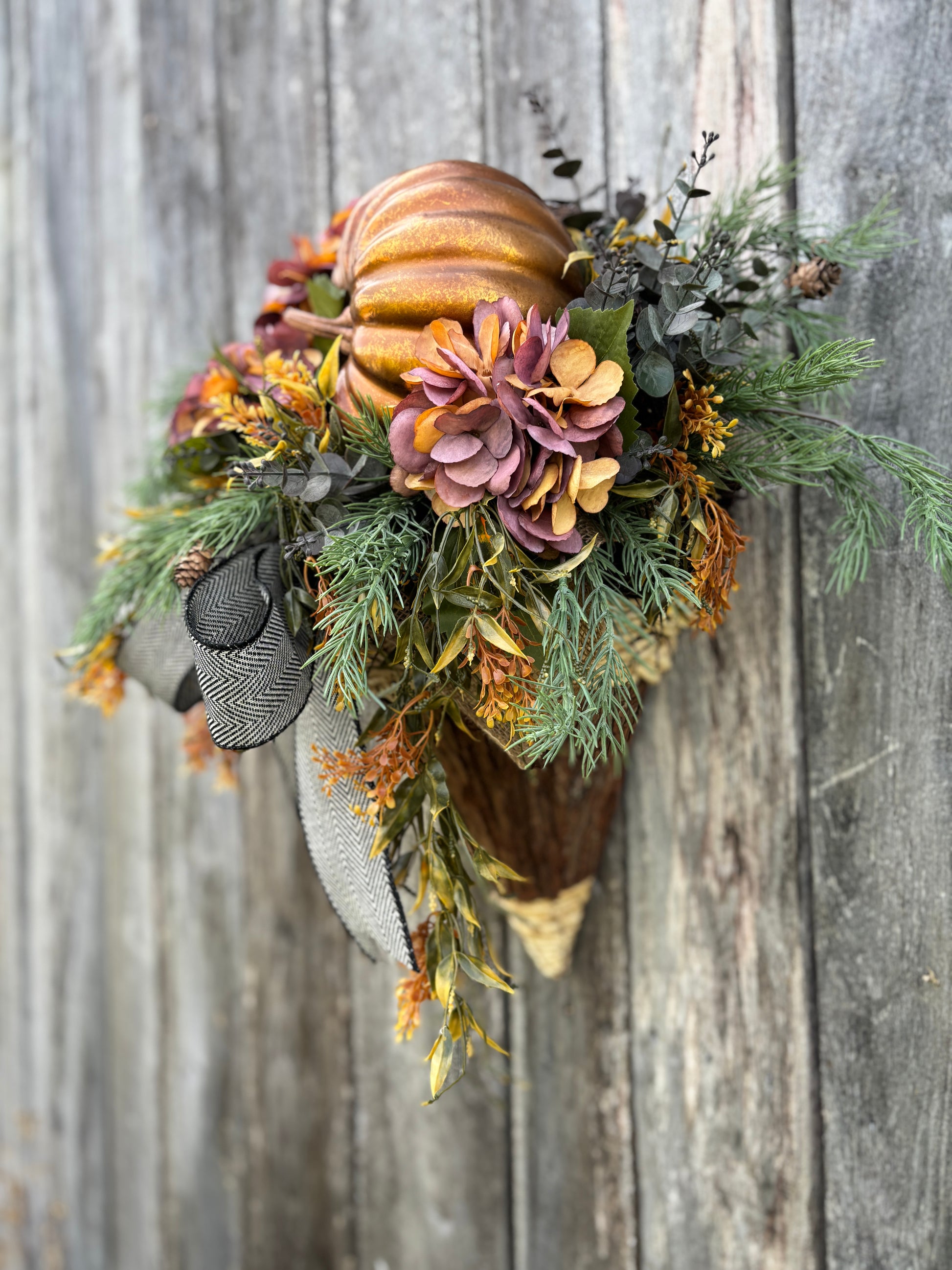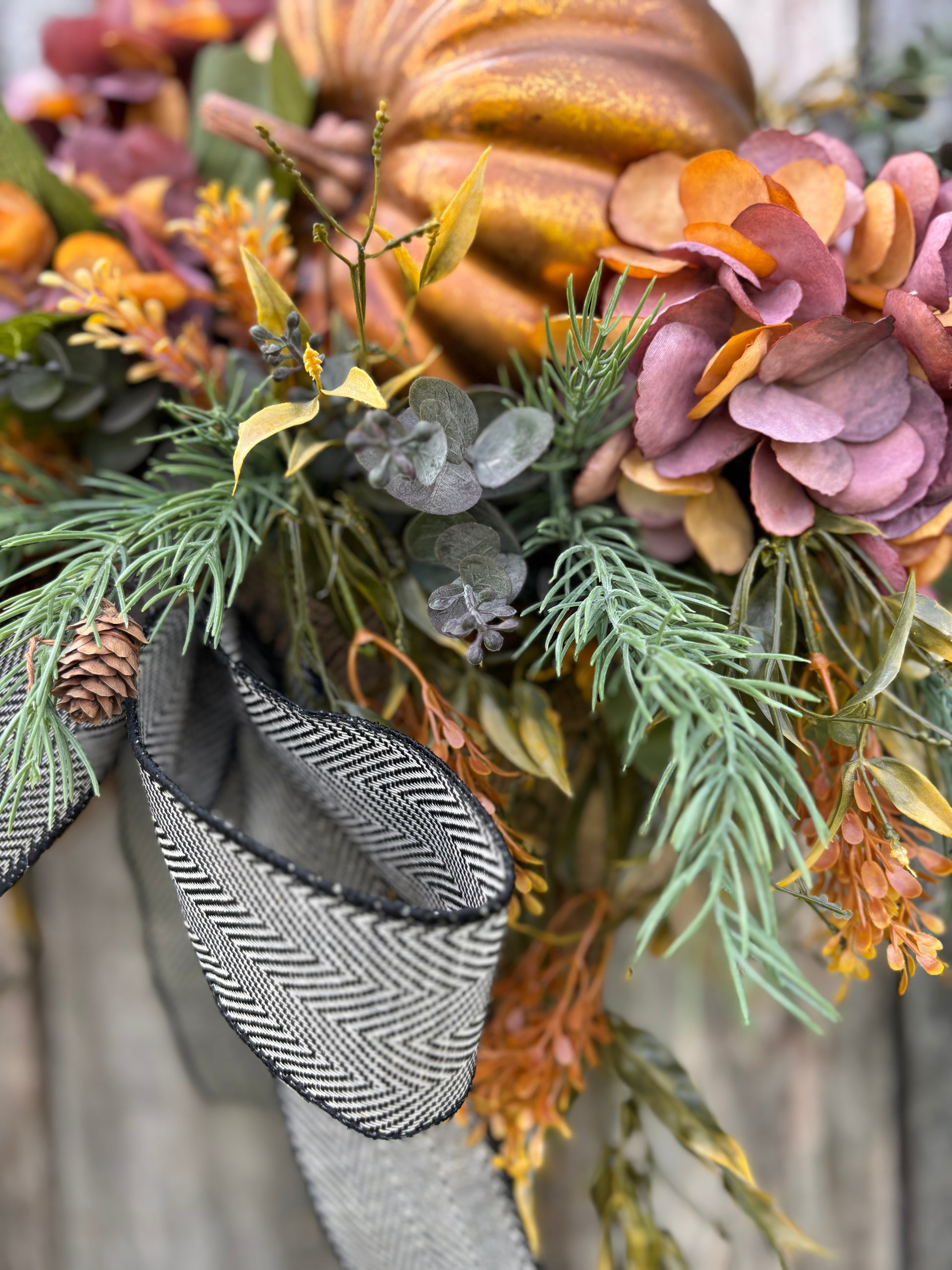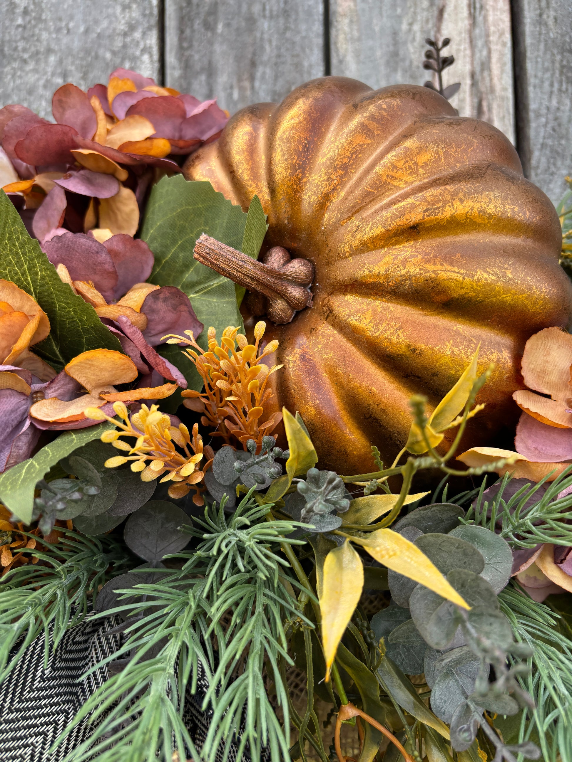 β’ Faux hydrangeas, greenery, fall florals, metallic pumpkin, designer bow