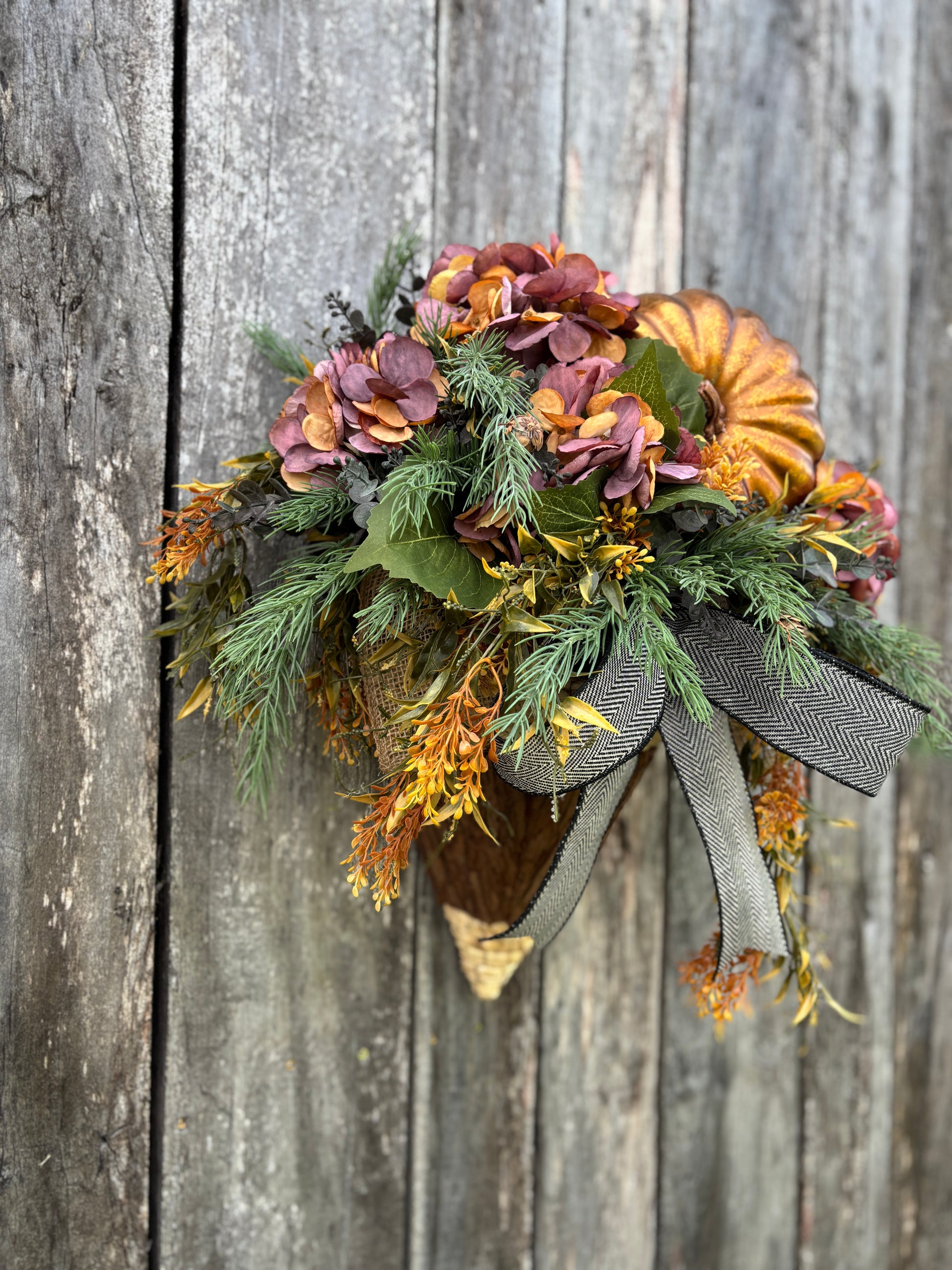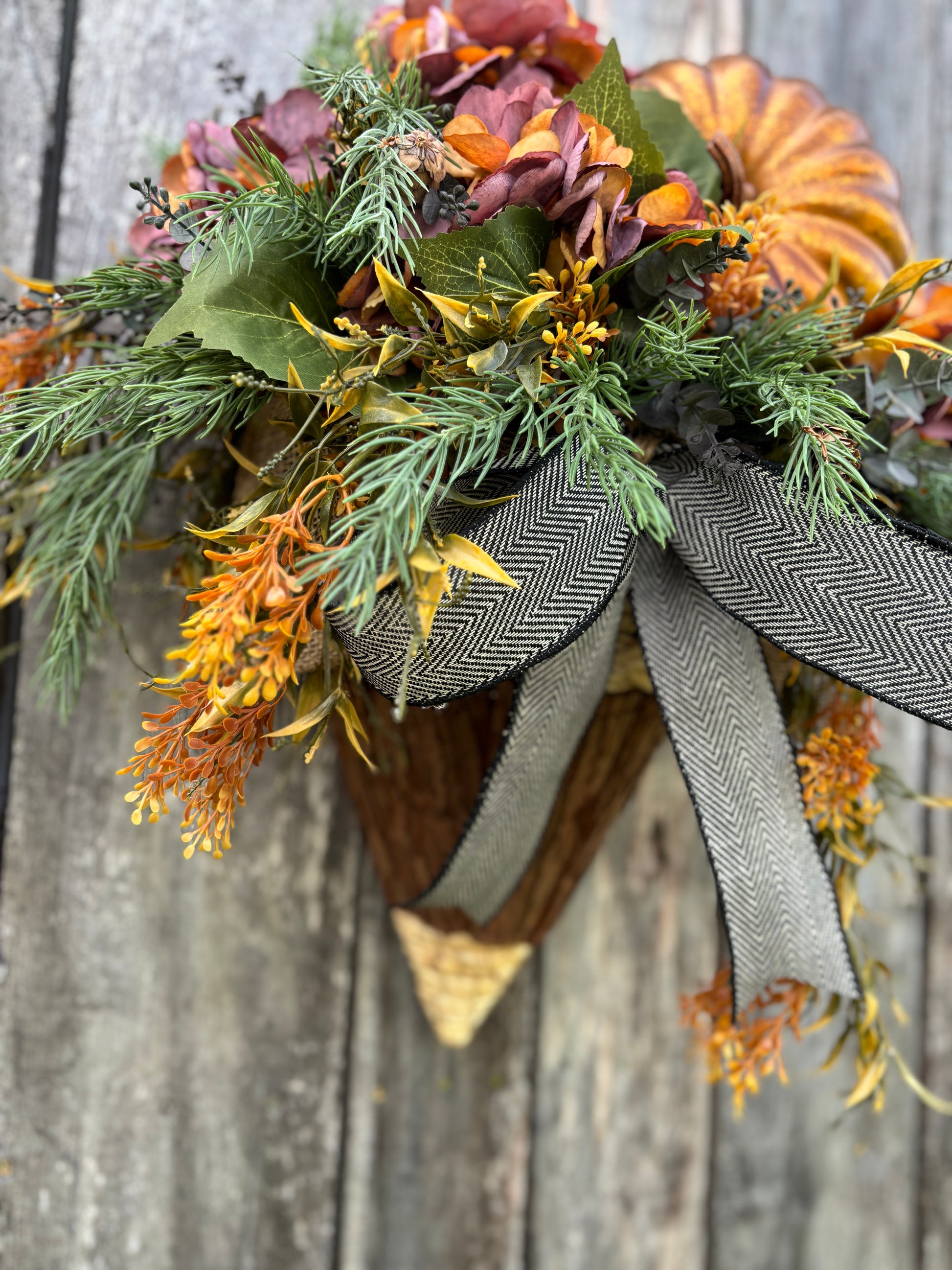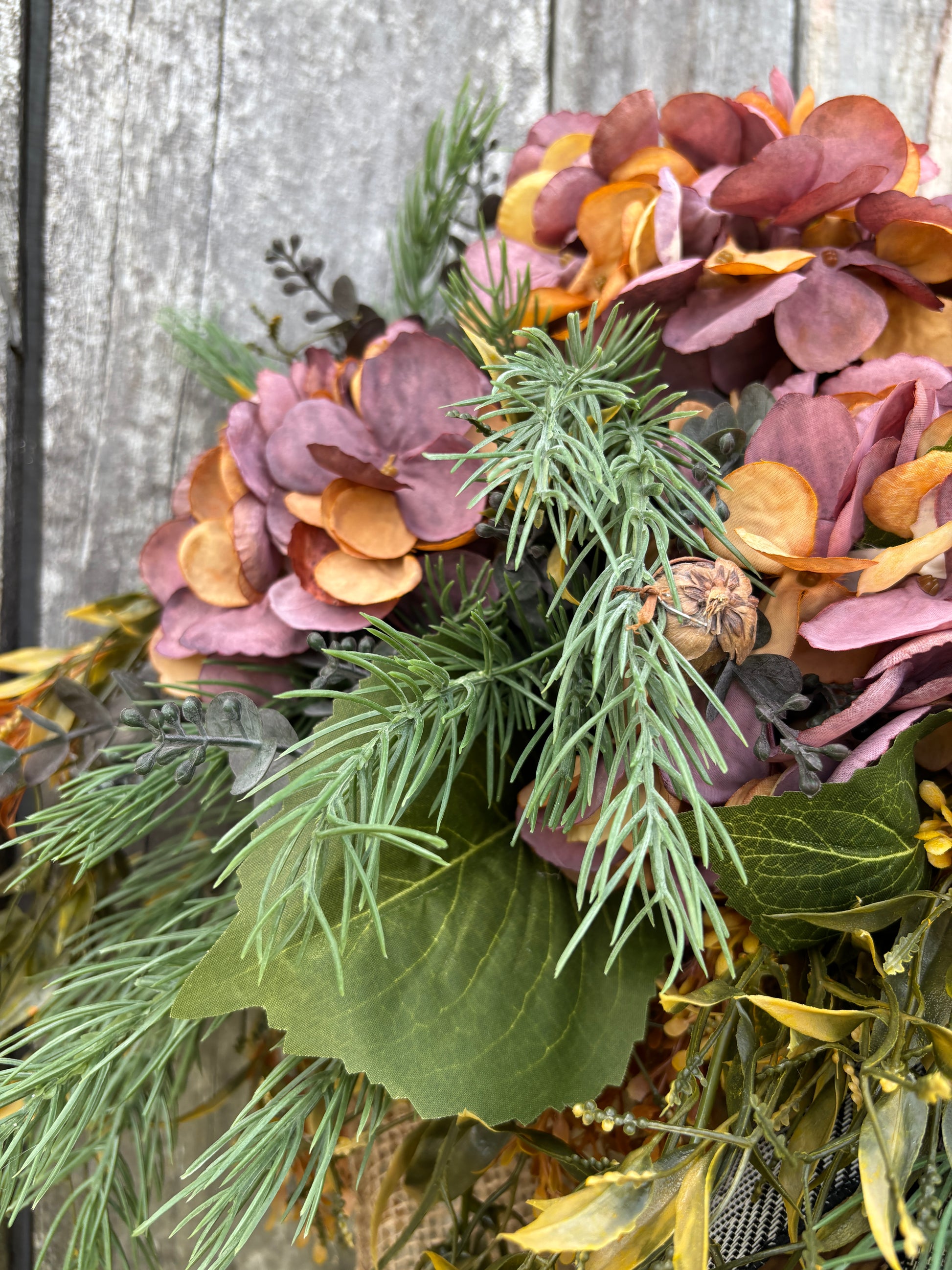 β’ Faux hydrangeas, greenery, fall florals, metallic pumpkin, designer bow