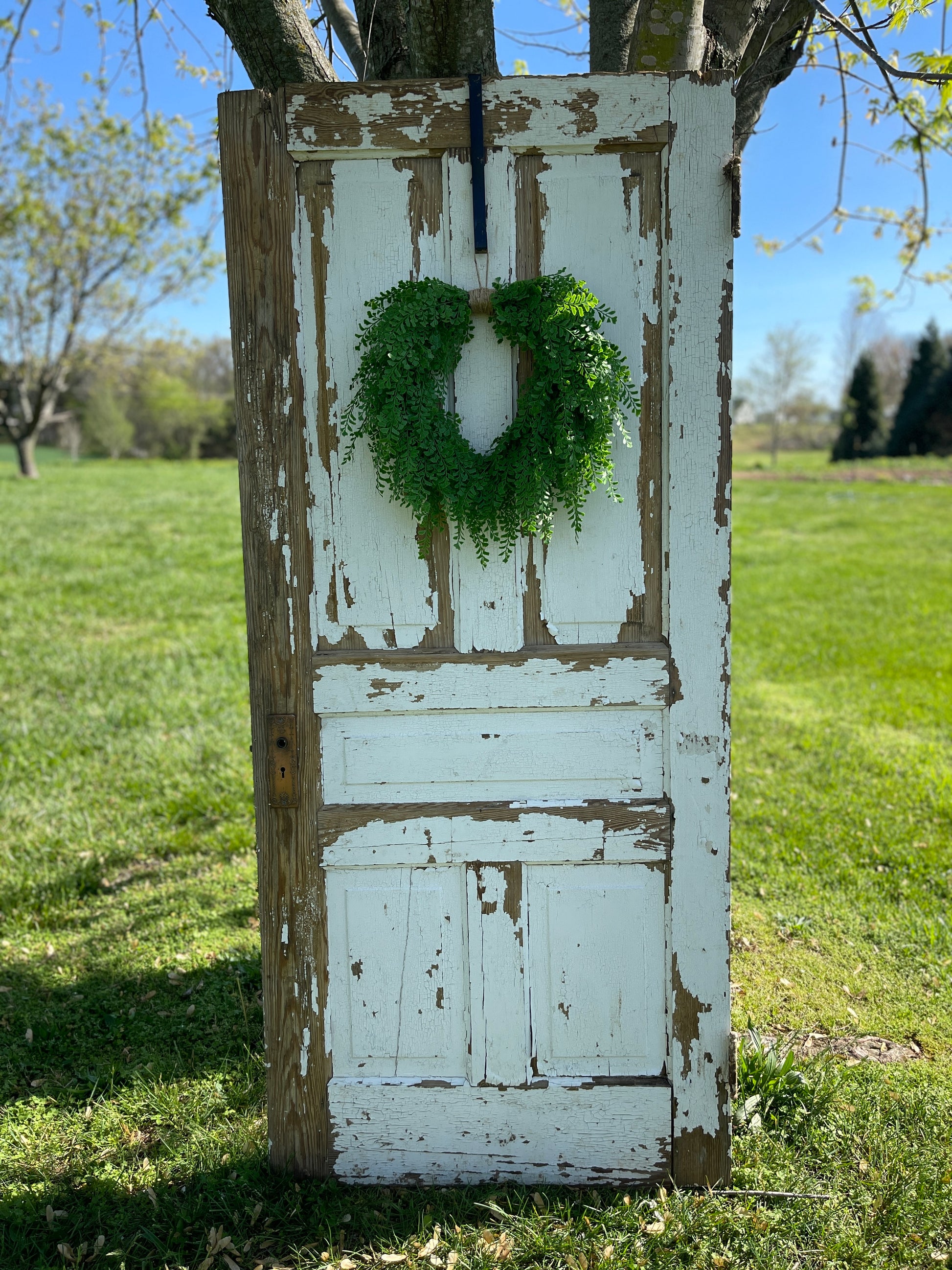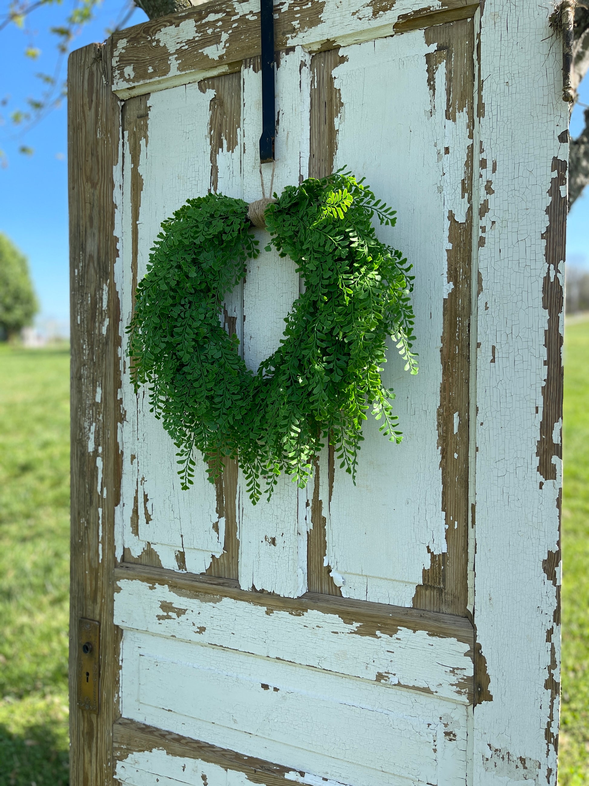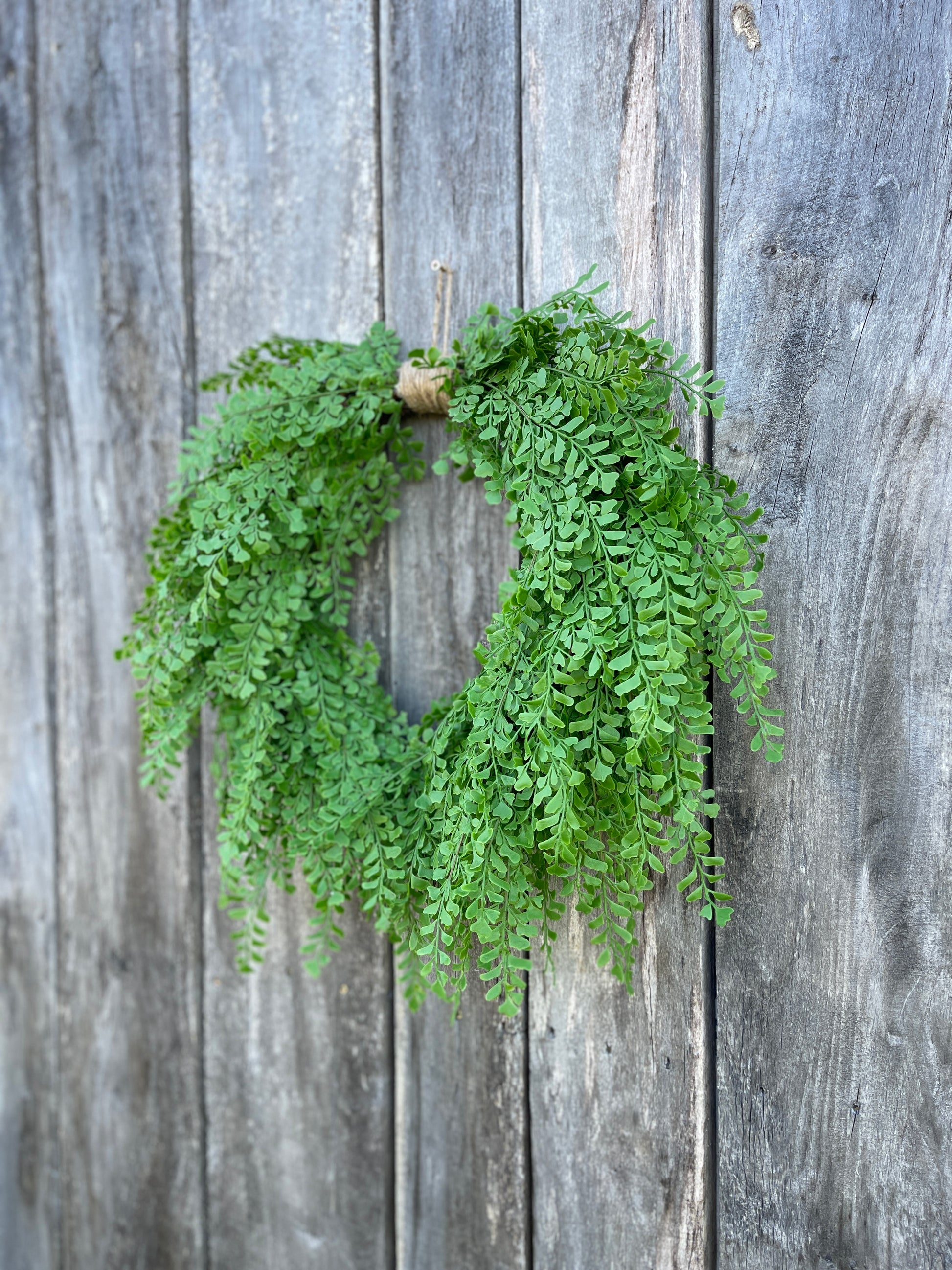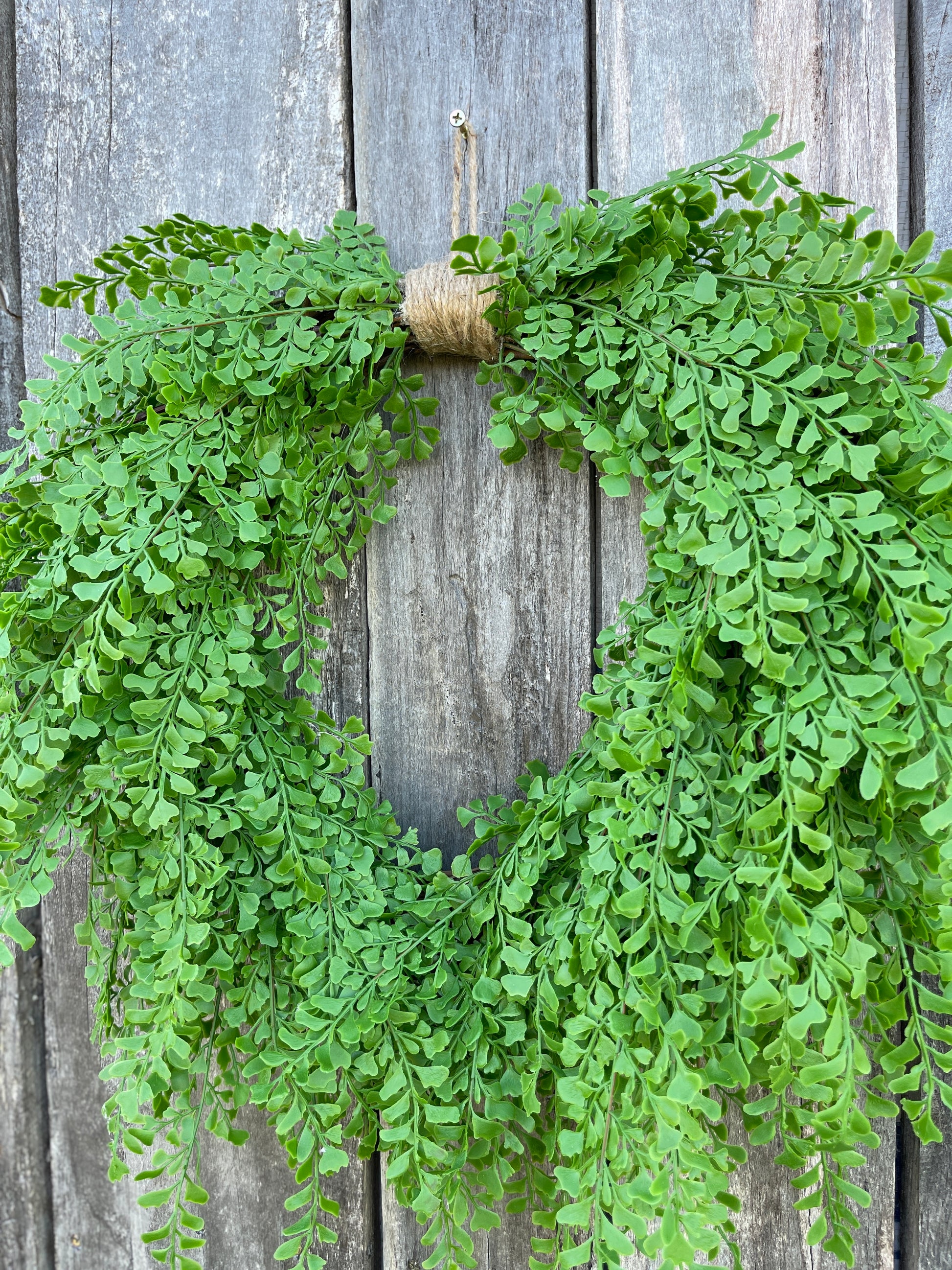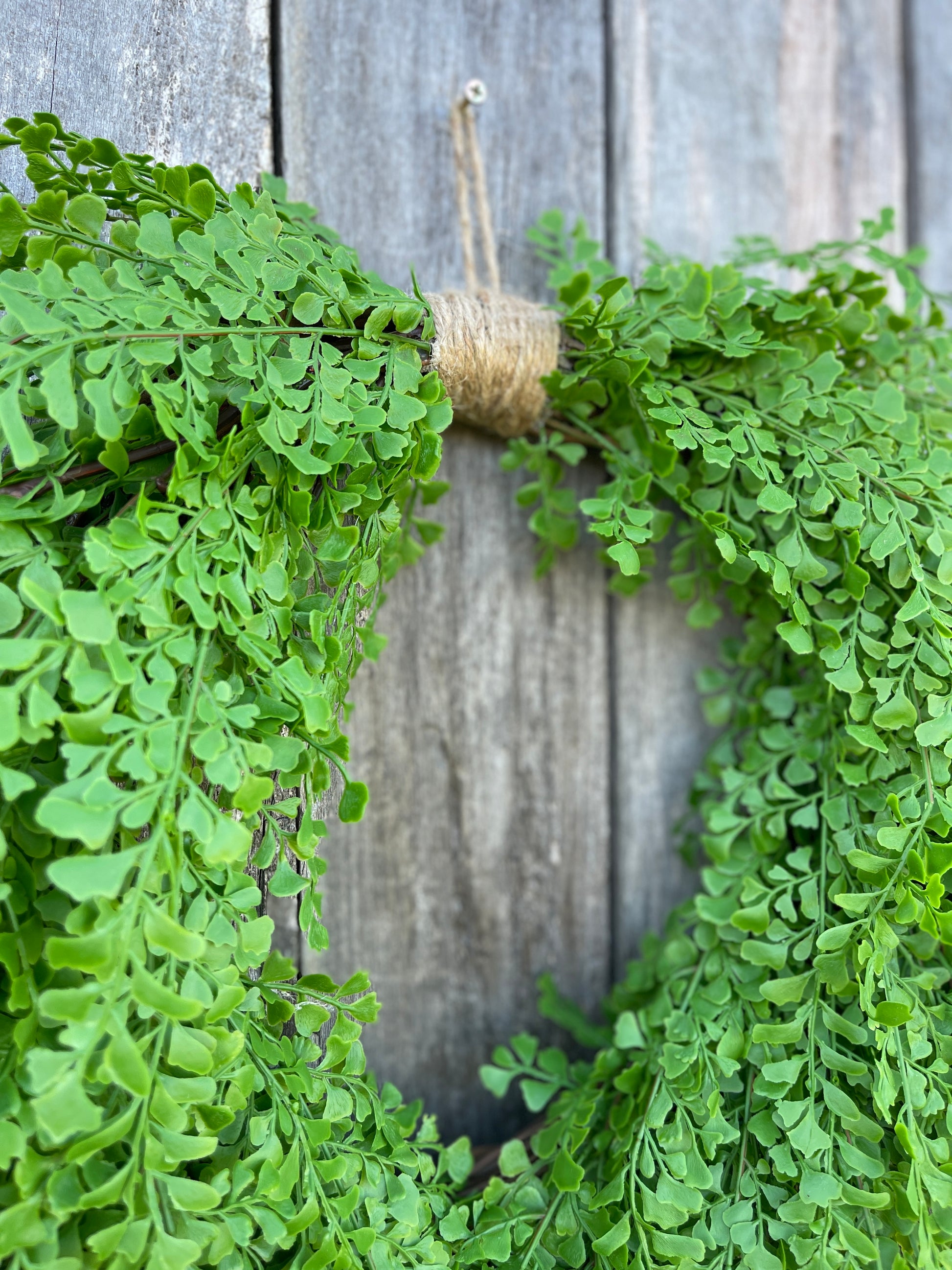 This beautiful farmhouse/cottage style is an ideal choice for your front door, creating a warm welcome for guests during the spring and summer months. It is full of high-quality real touch, hanging maiden hair fern. Beautifully arranged on a grapevine and a tan and white cabana stripped ribbon attached to jute rope for easy hanging.