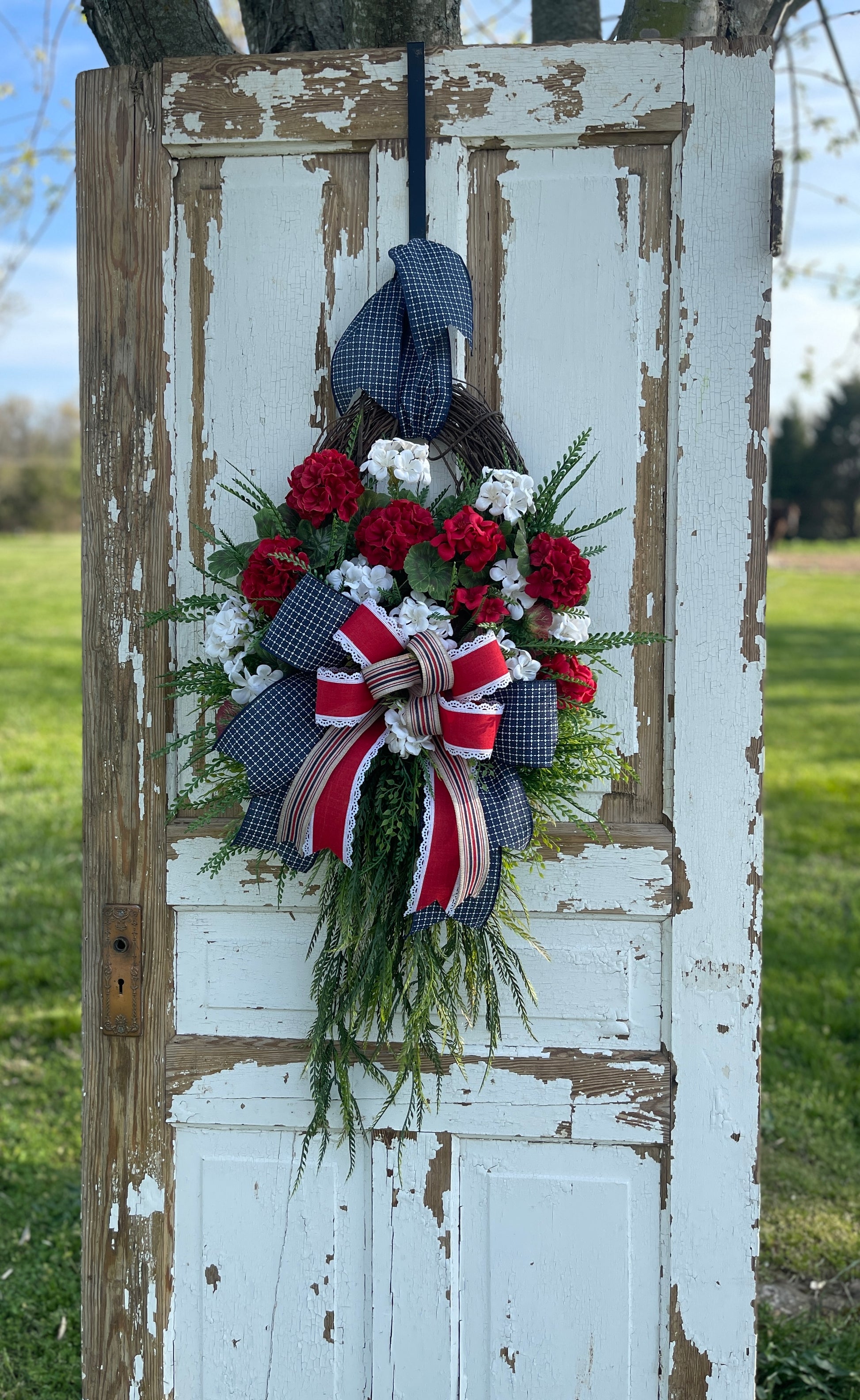 Make a bold statement this patriotic season with this stunning handcrafted wreath! Designed on an oval grapevine base measuring 24” long x 16” wide, this wreath extends to an impressive 38” long x 22” wide, creating a grand and inviting display for your front door or home decor.