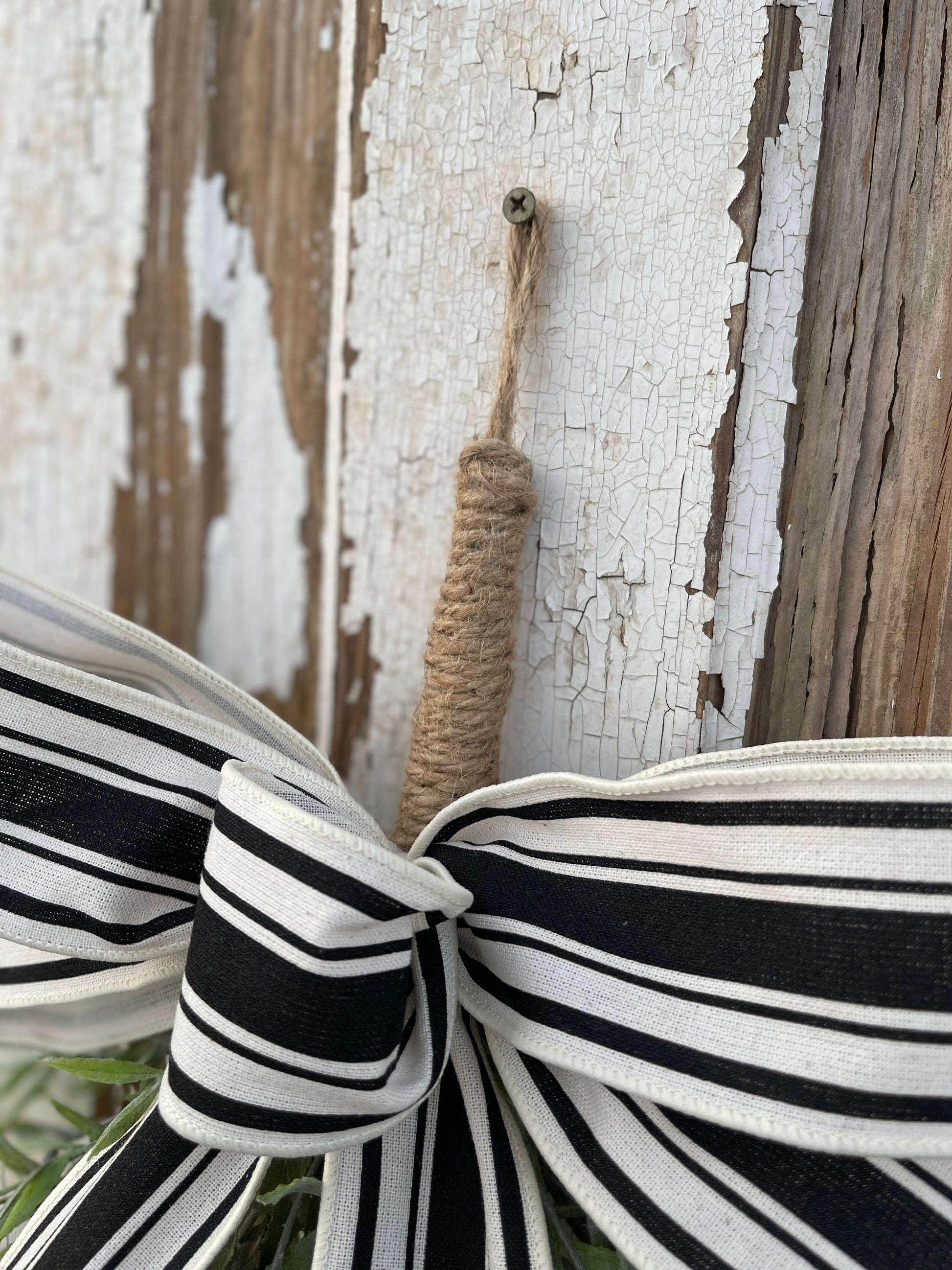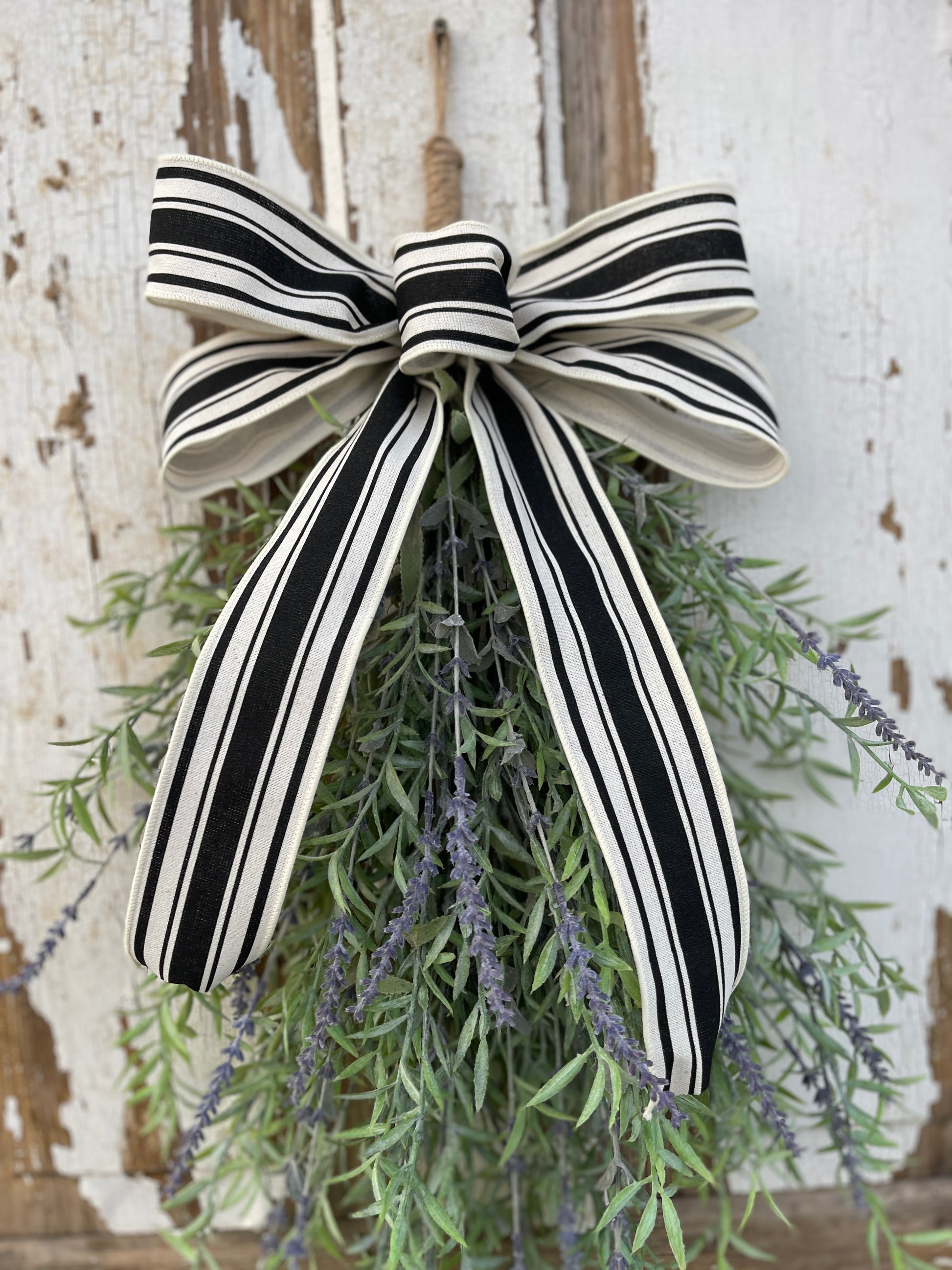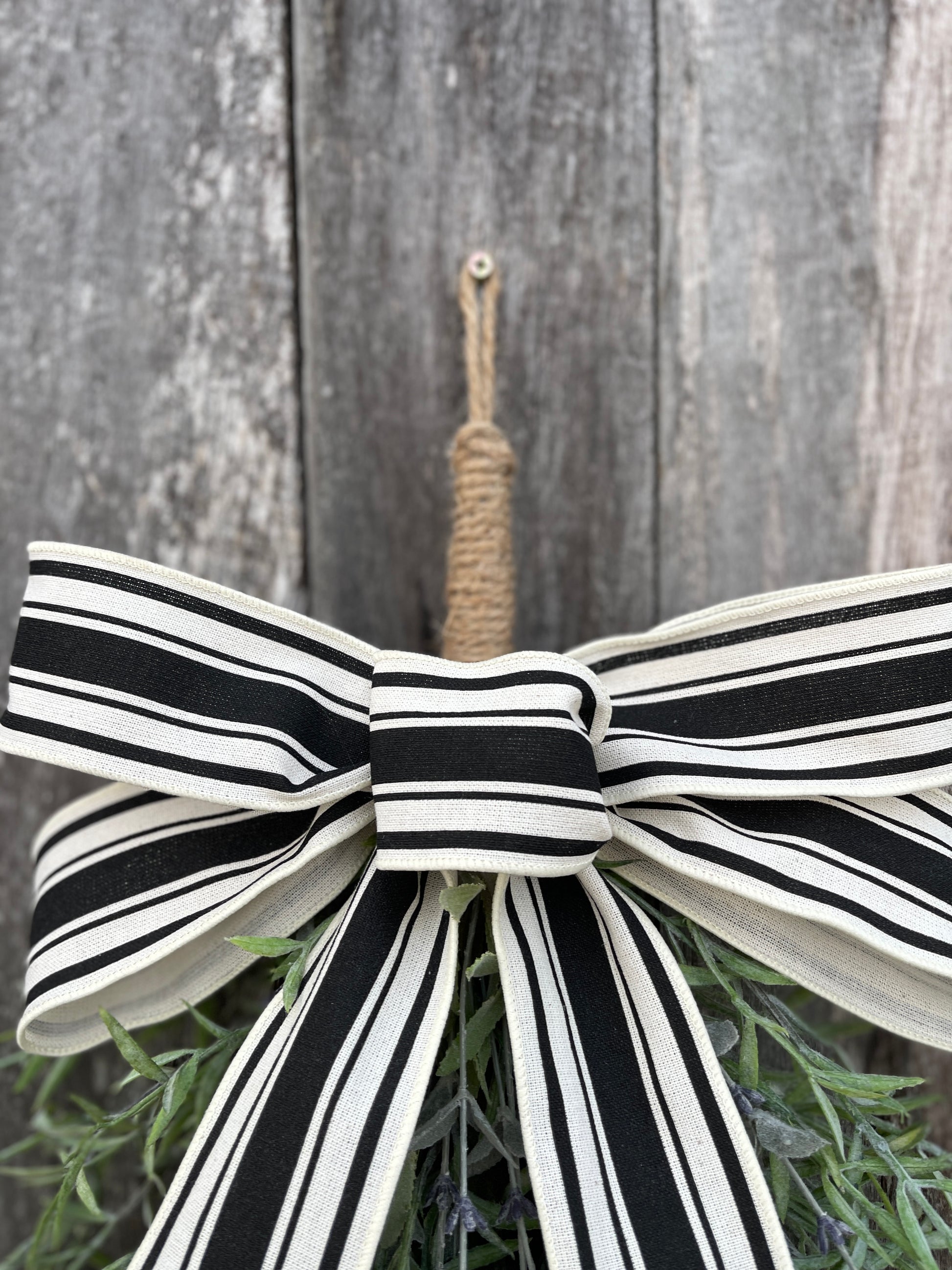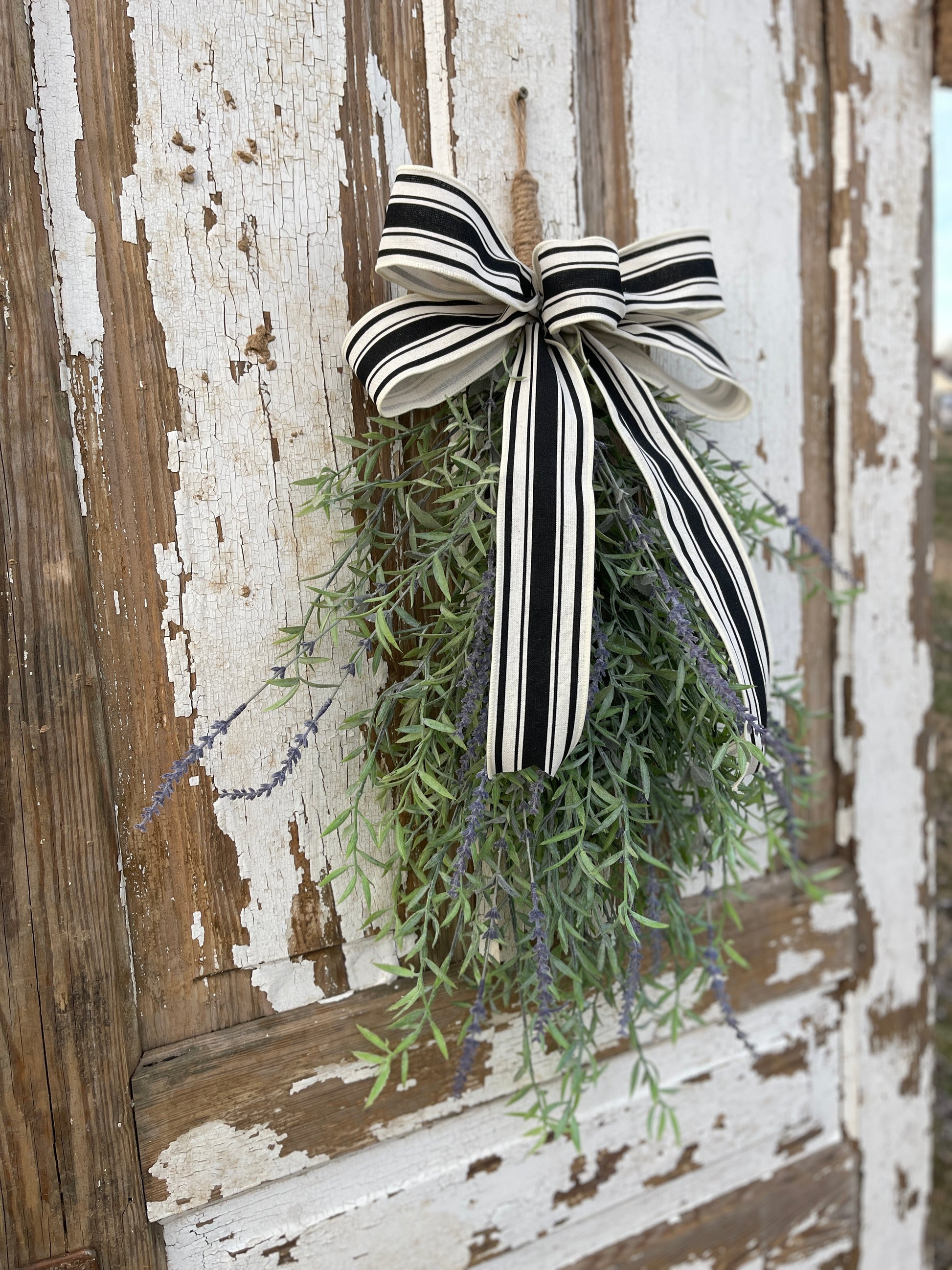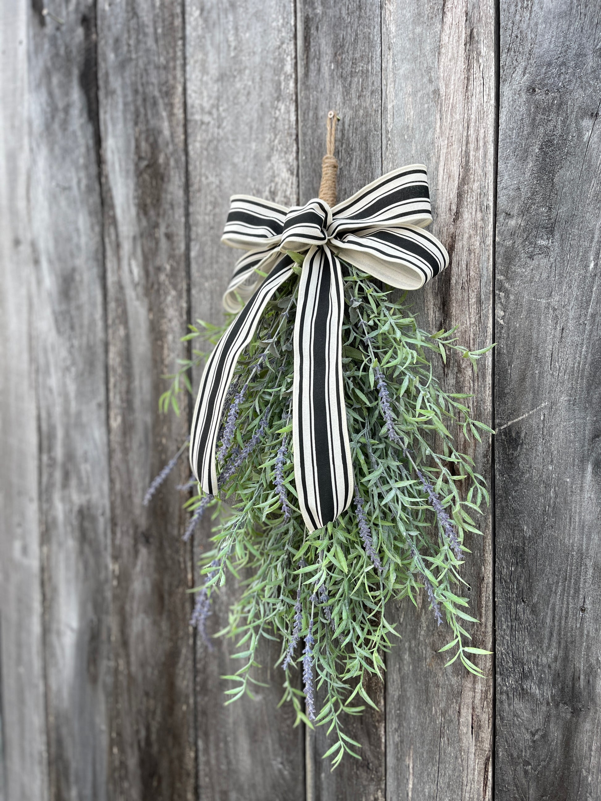 Add a touch of rustic elegance to your home with this handcrafted greenery swag. Measuring 31” long, 17” wide, and 5” deep, this piece features cascading greenery paired with faux lavender stems for a timeless look. The bold black-and-white striped ribbon adds a modern farmhouse flair, making it perfect for year-round decor or gifting.