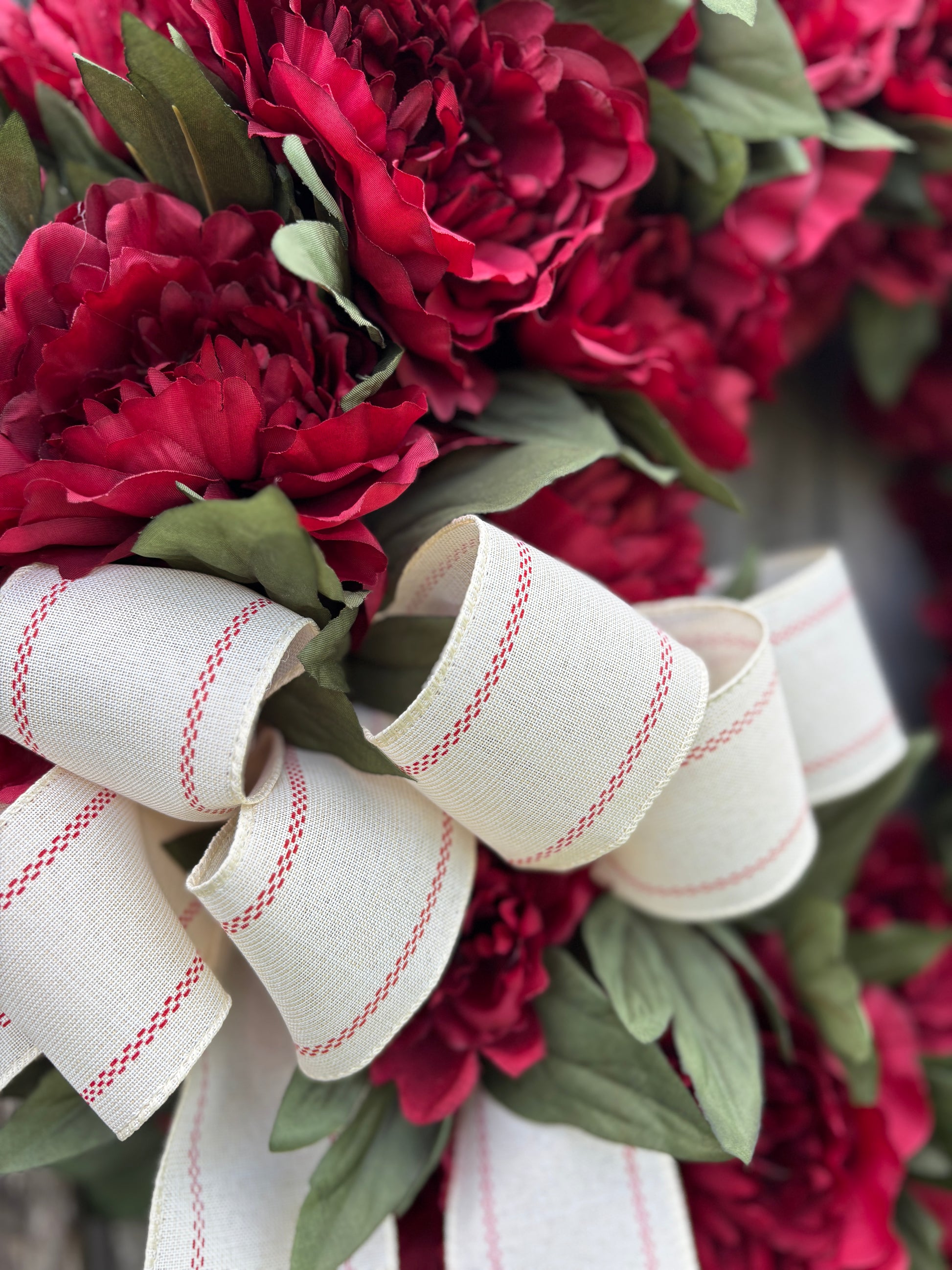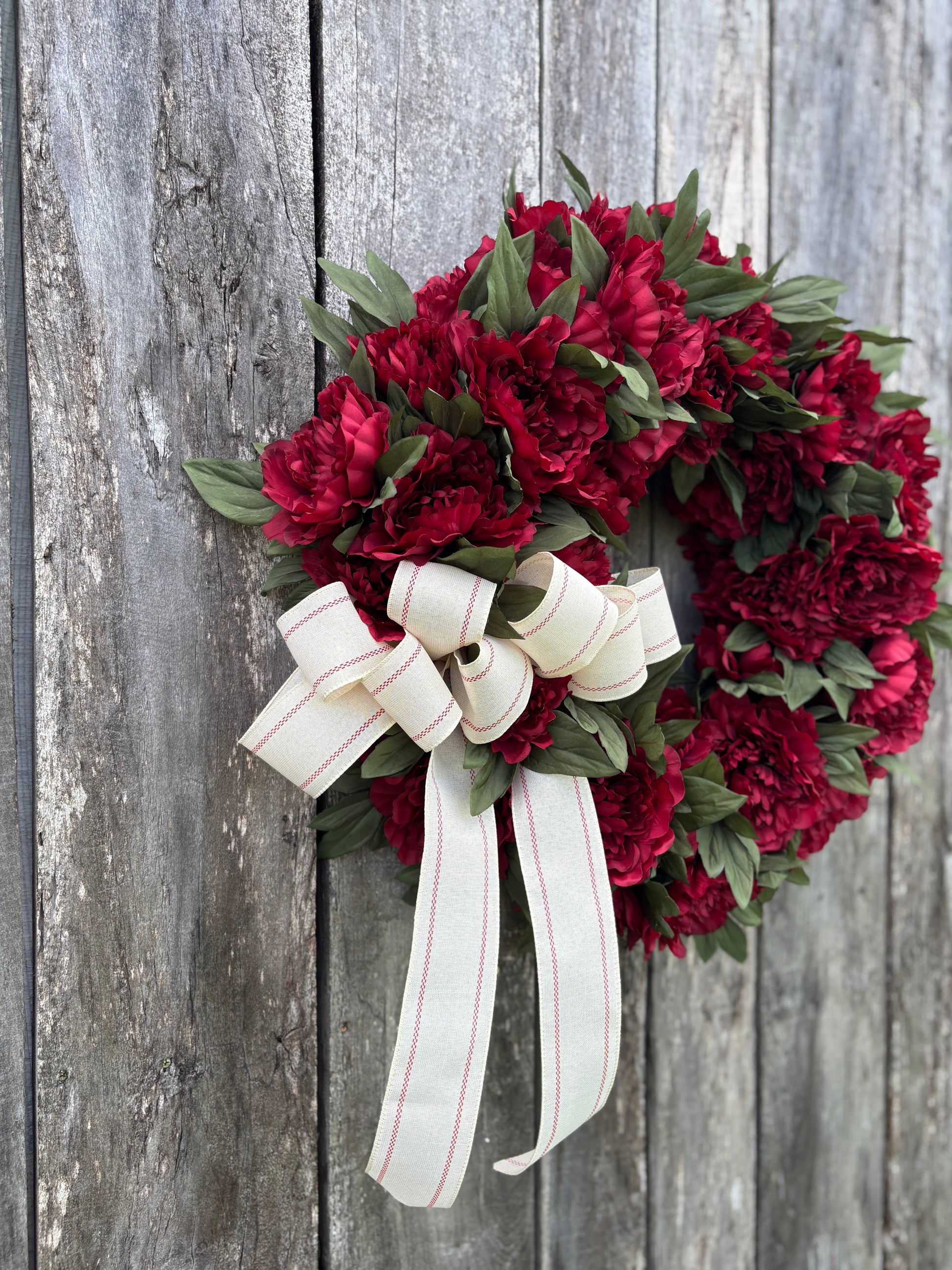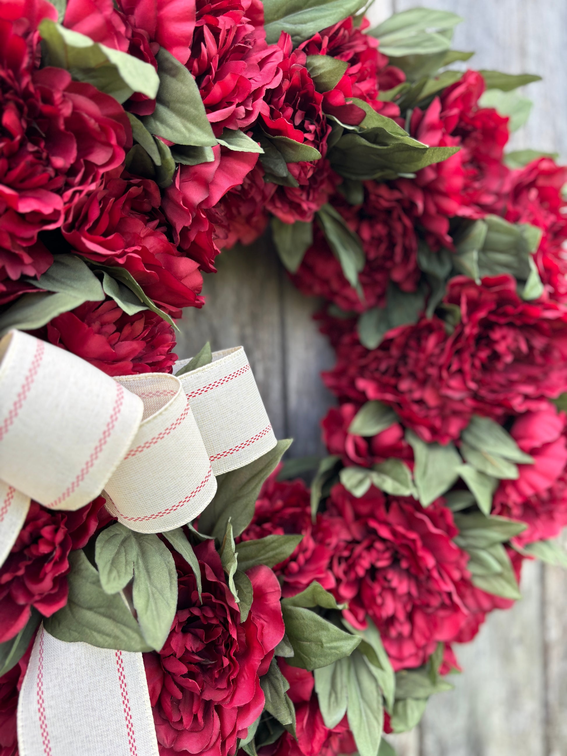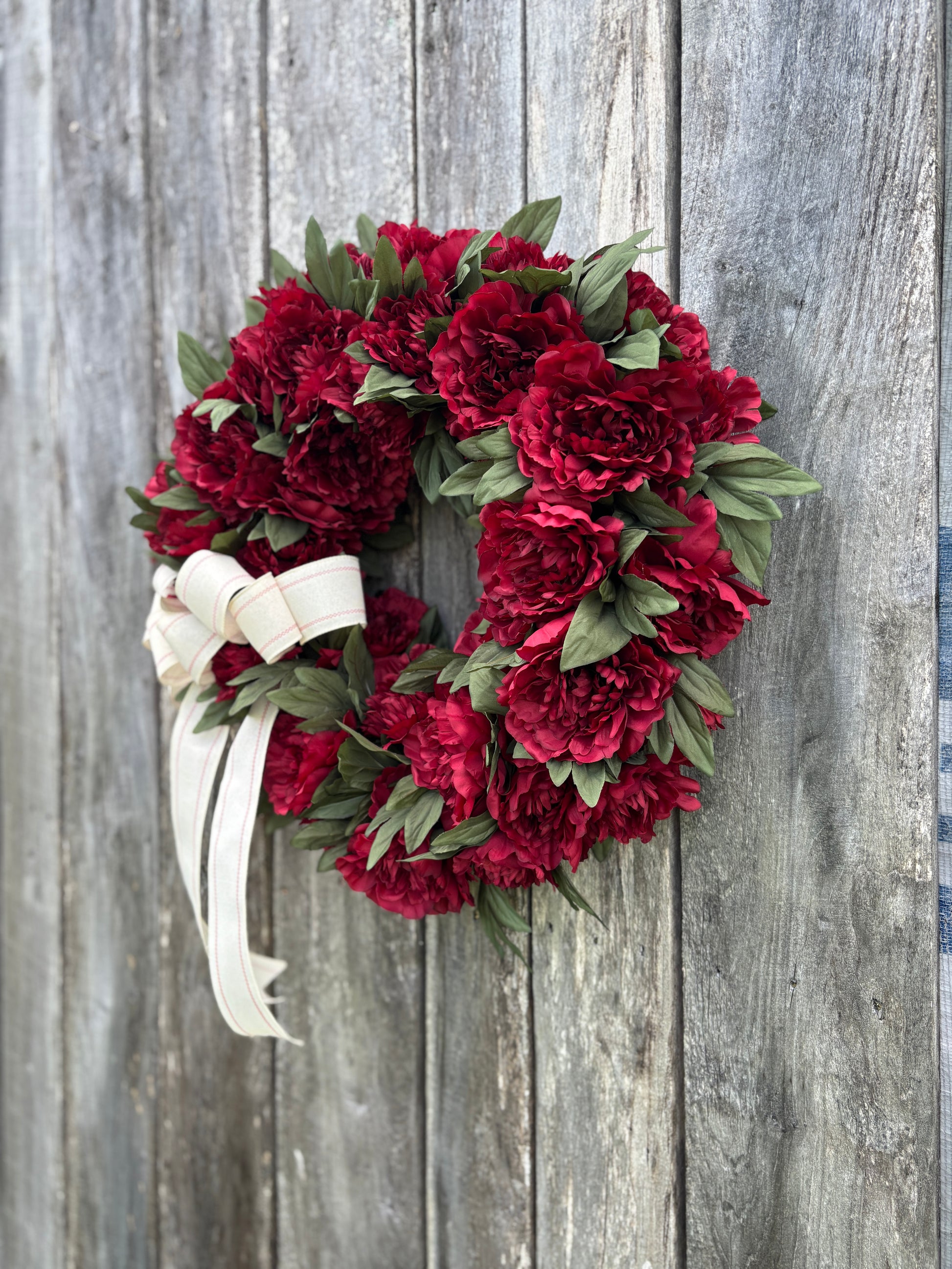 Welcome guests all season long with this elegant burgundy peony wreath, perfect for fall, Christmas, and year-round decor. Built on an 18” grapevine base and measuring approximately 22” in total diameter, this lush wreath is overflowing with deep burgundy peonies and soft, realistic greenery for a rich, full look.